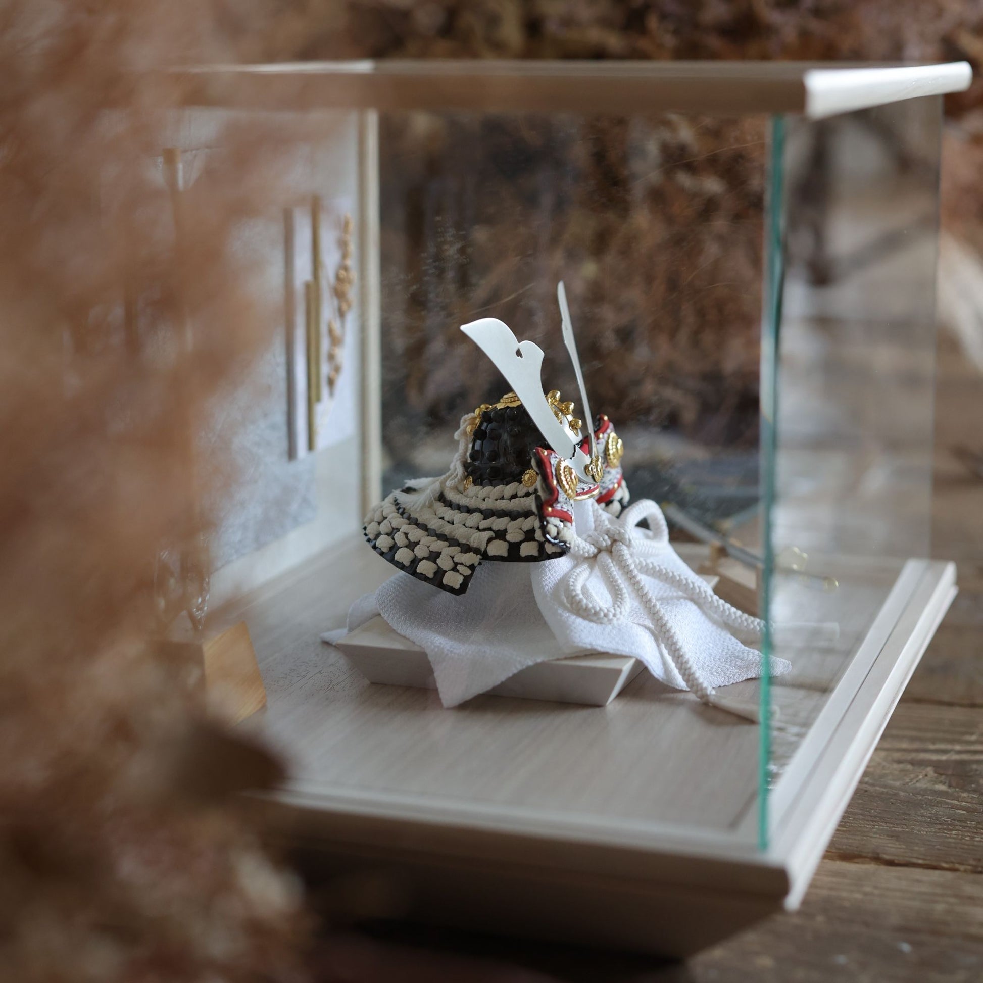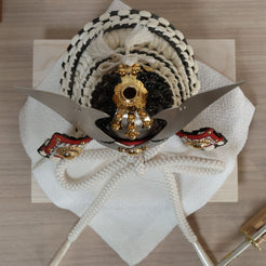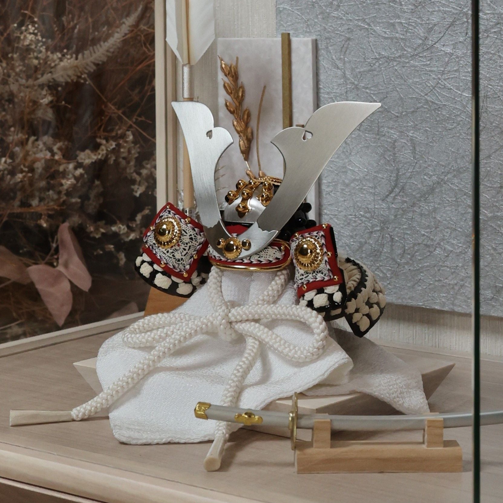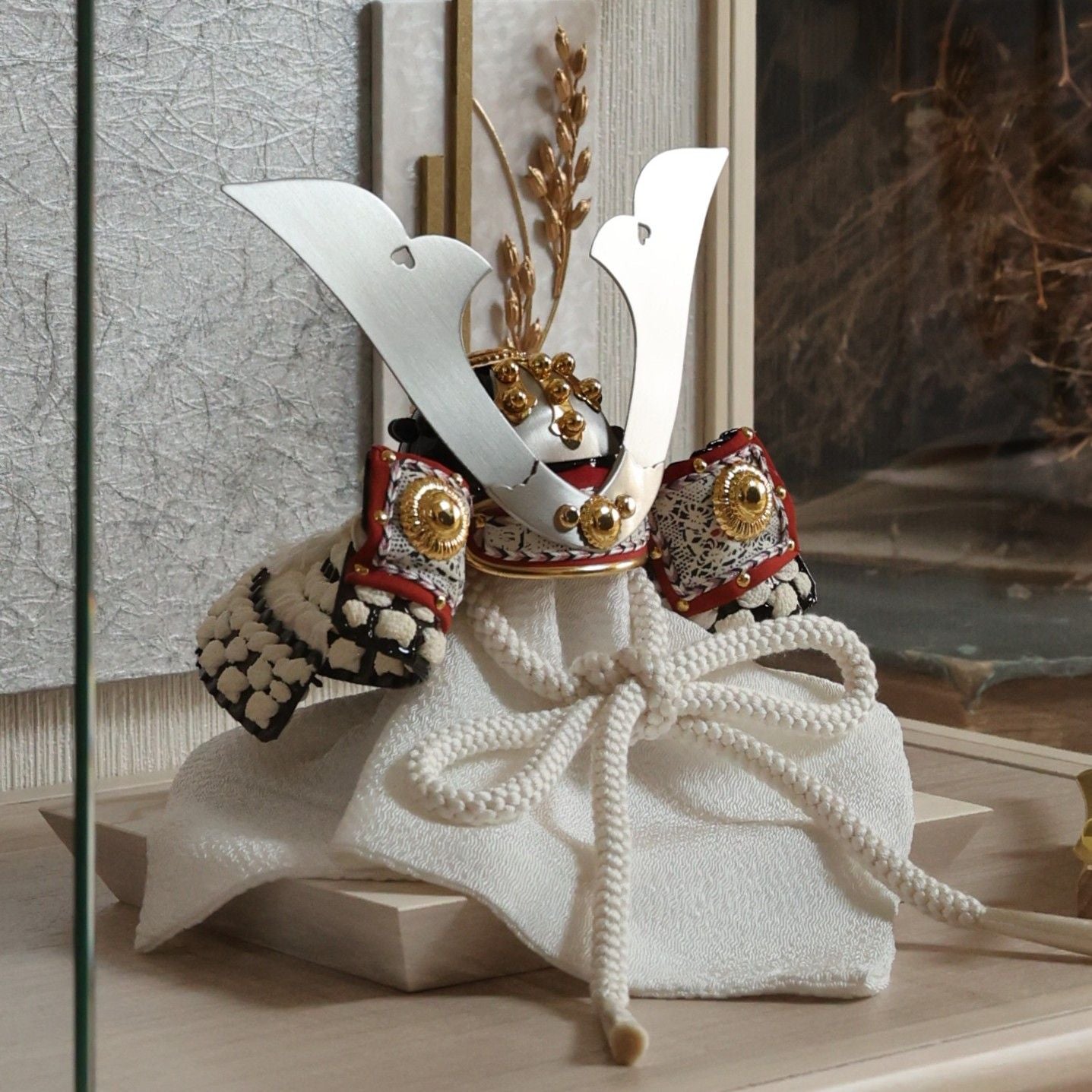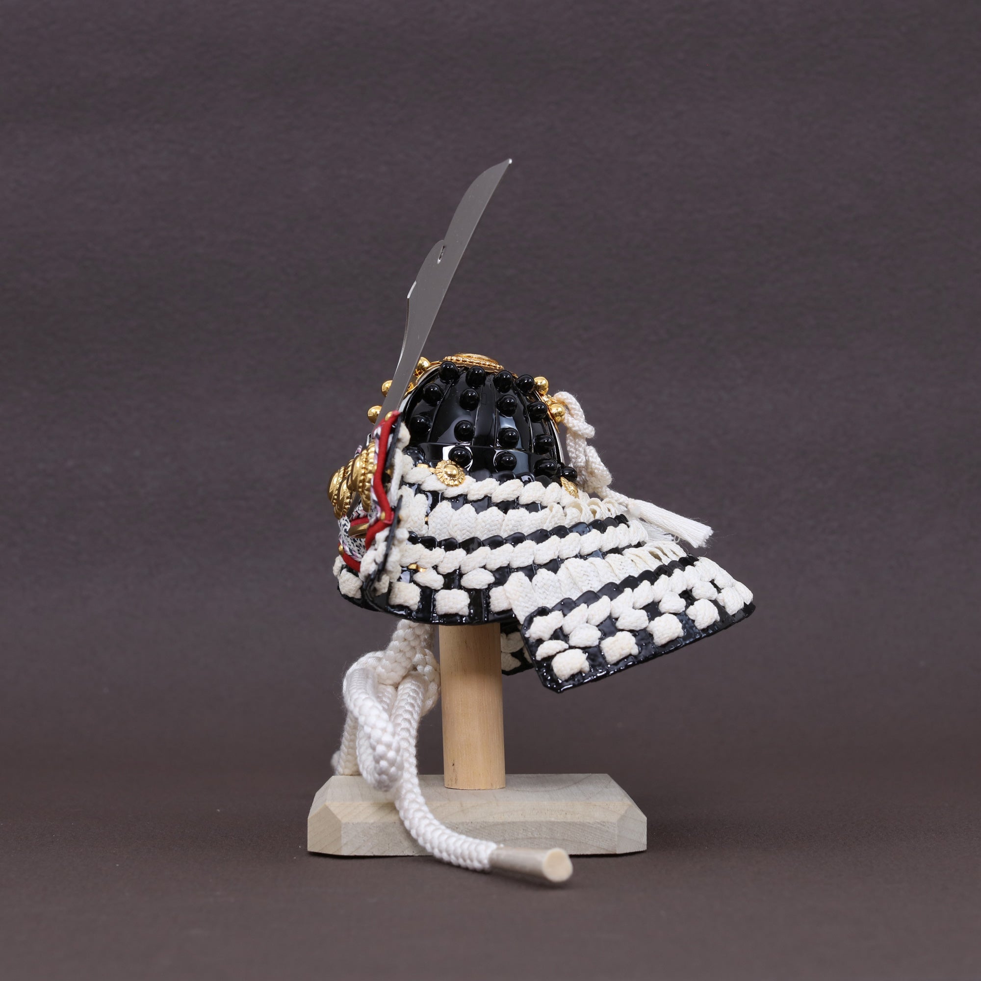 白色の威糸で仕上げた兜の後ろ姿は、品のある美しさが特徴です。白糸が整然と並んだ垂れ部分は、全体に清潔感と高貴な印象を与えます。また、他の素材や色との調和が美しくシンプルながらも伝統美を感じさせる仕上がりになっています。