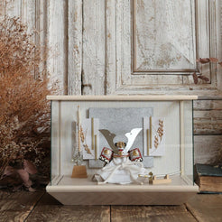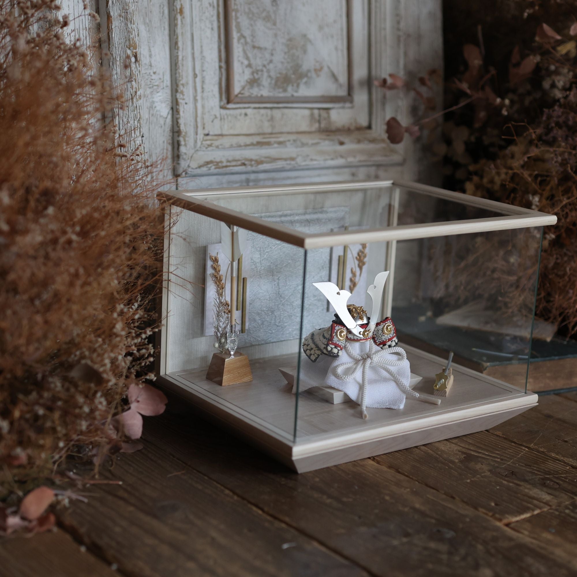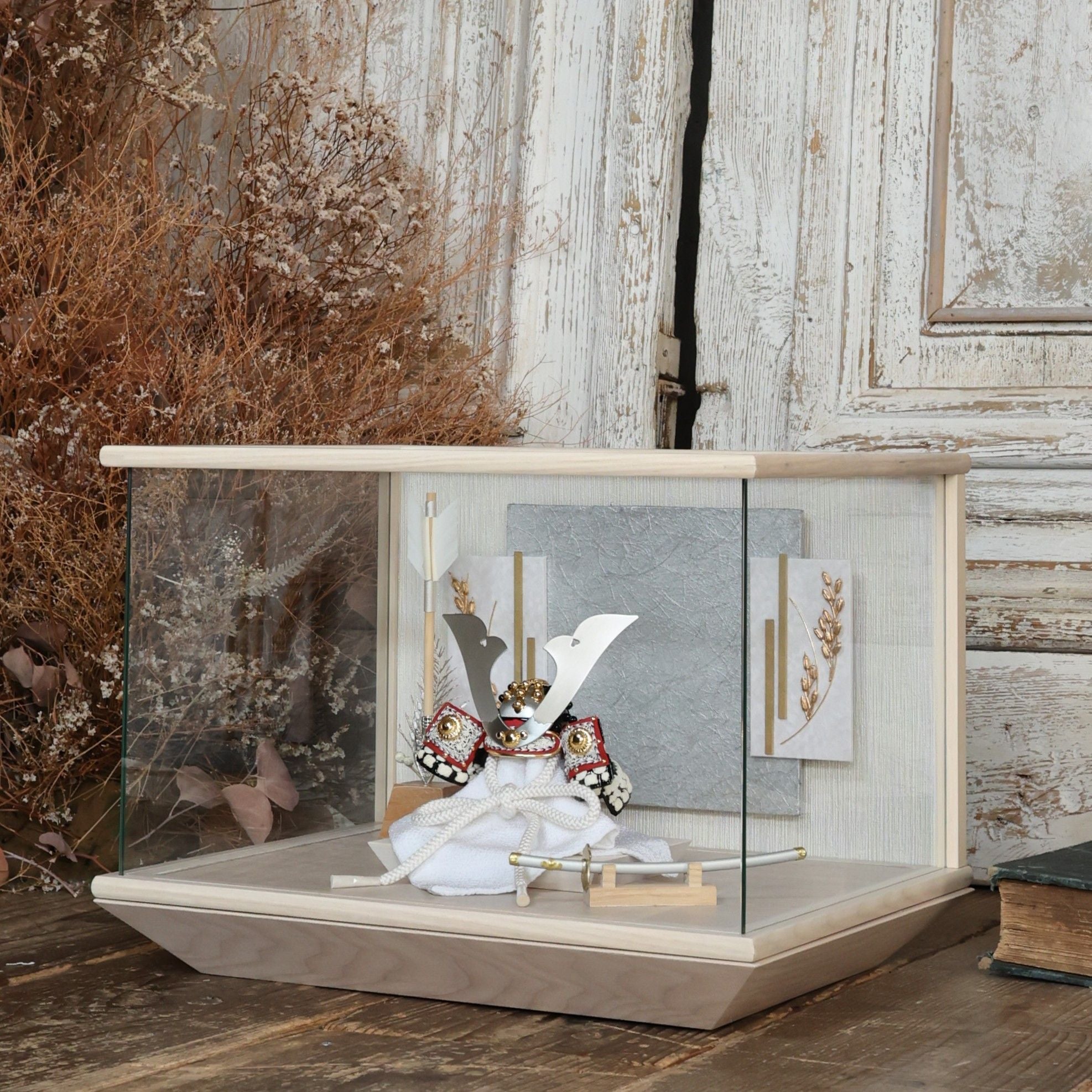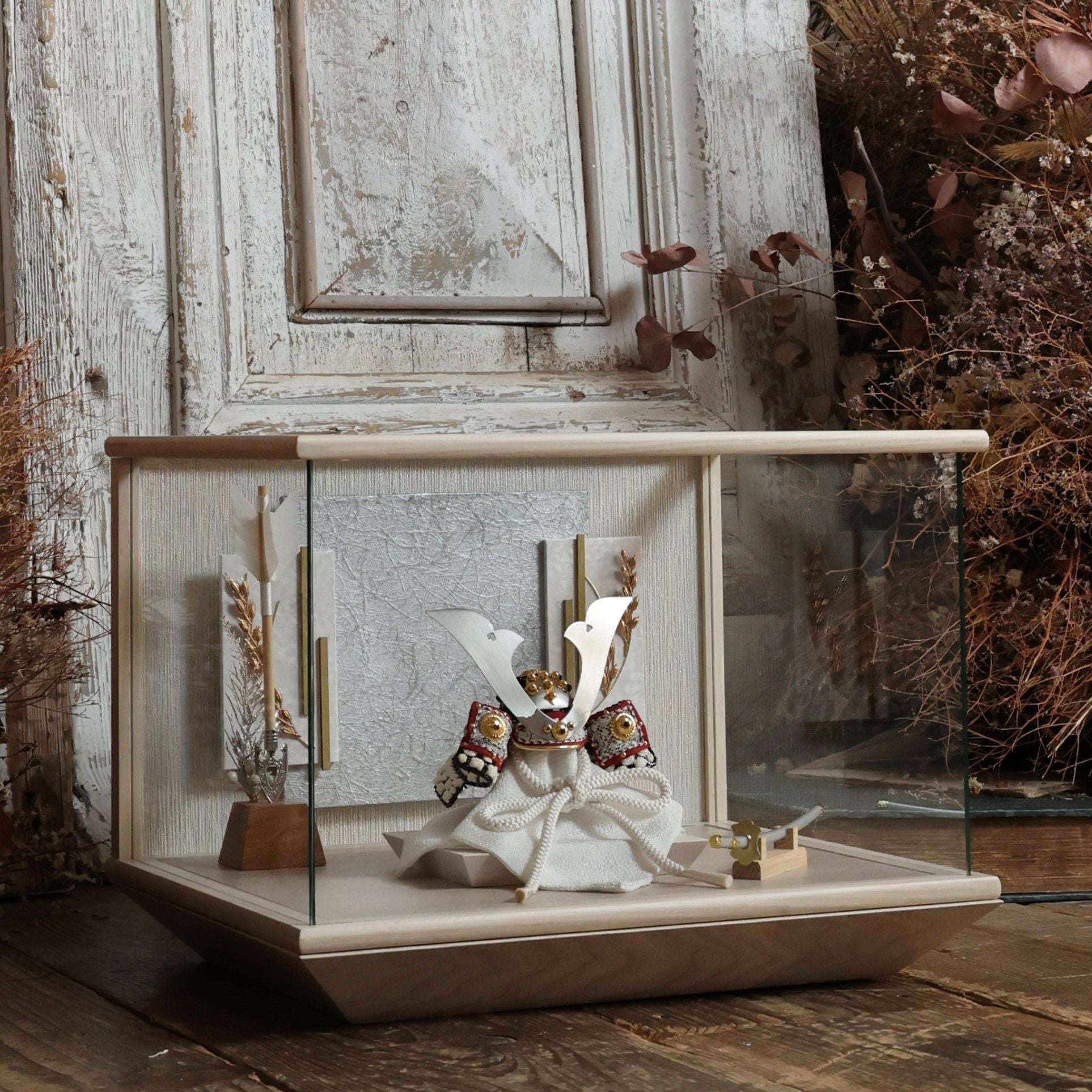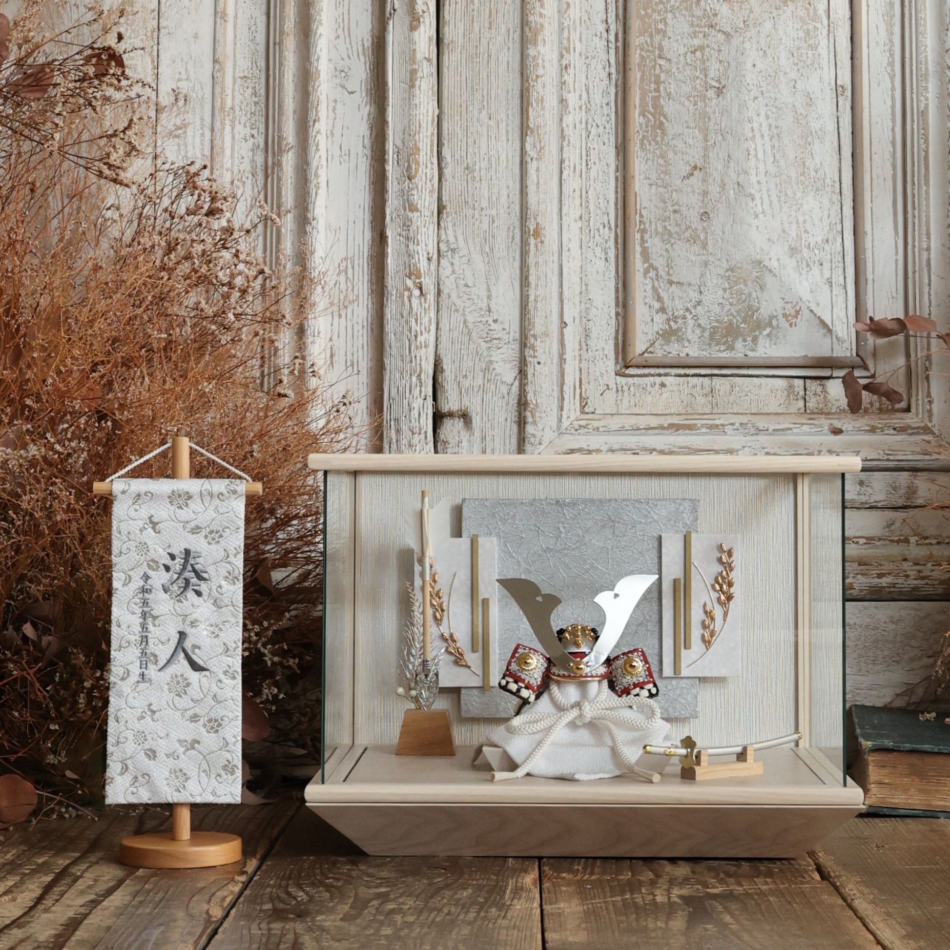 白色の威糸で仕上げた兜の後ろ姿は、品のある美しさが特徴です。白糸が整然と並んだ垂れ部分は、全体に清潔感と高貴な印象を与えます。また、他の素材や色との調和が美しくシンプルながらも伝統美を感じさせる仕上がりになっています。