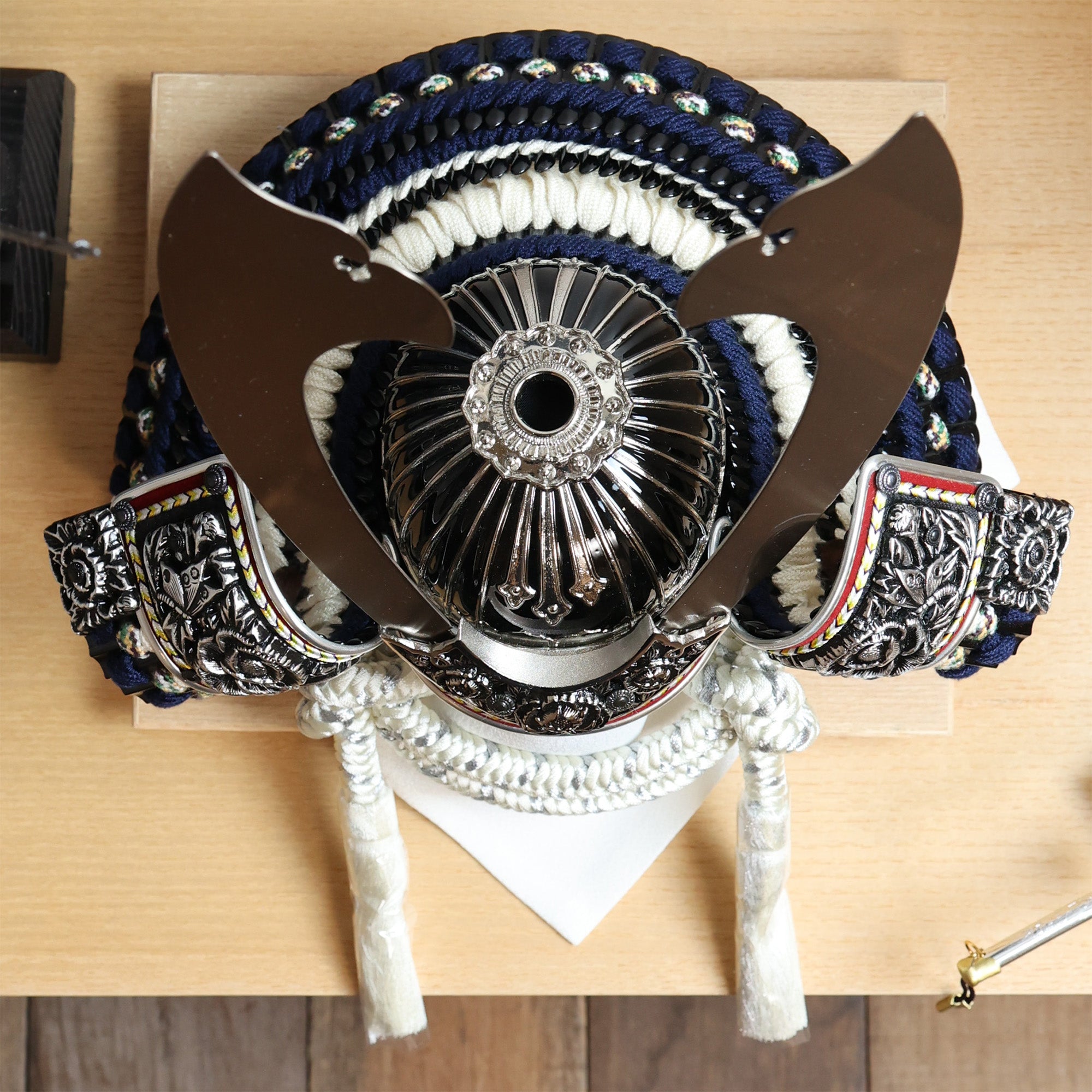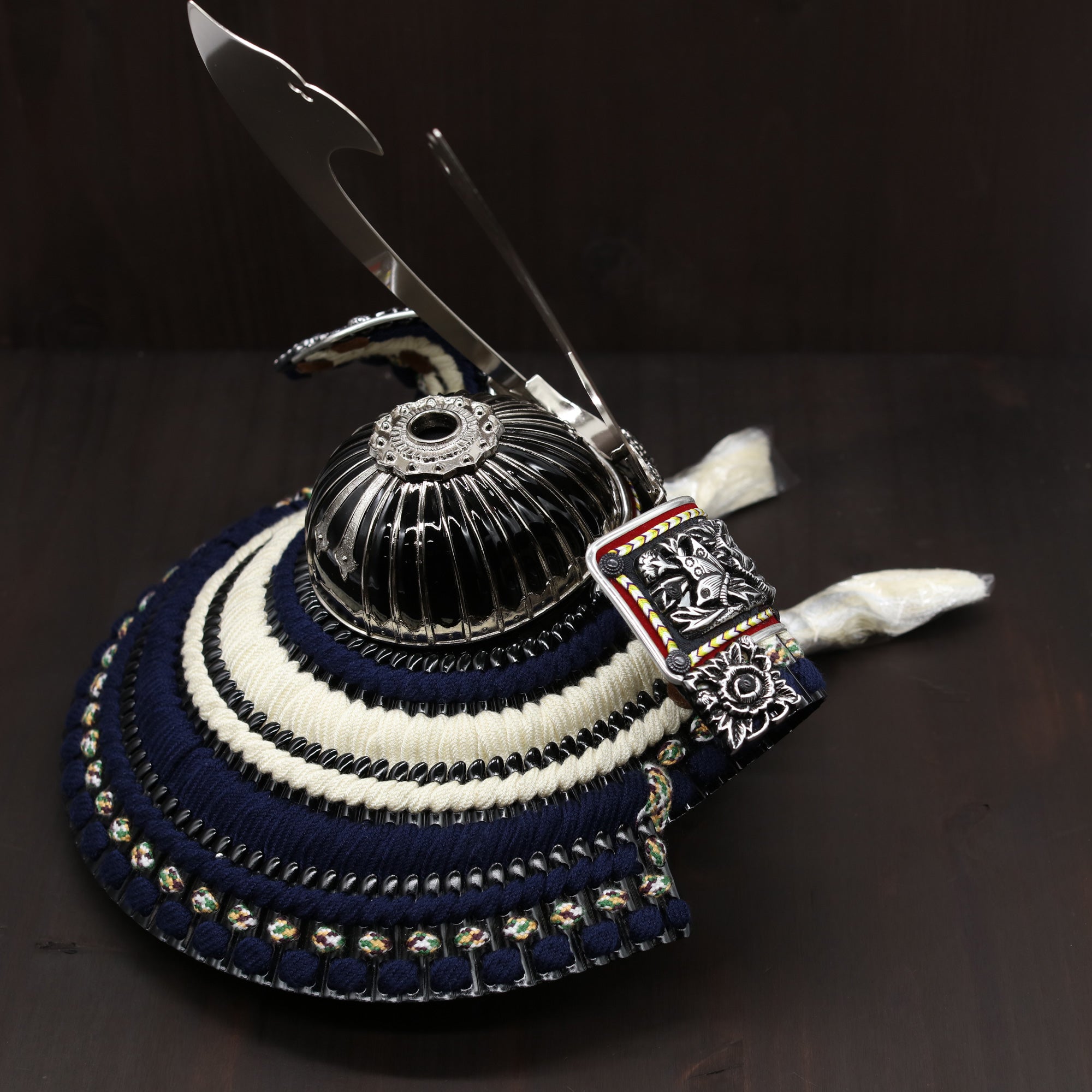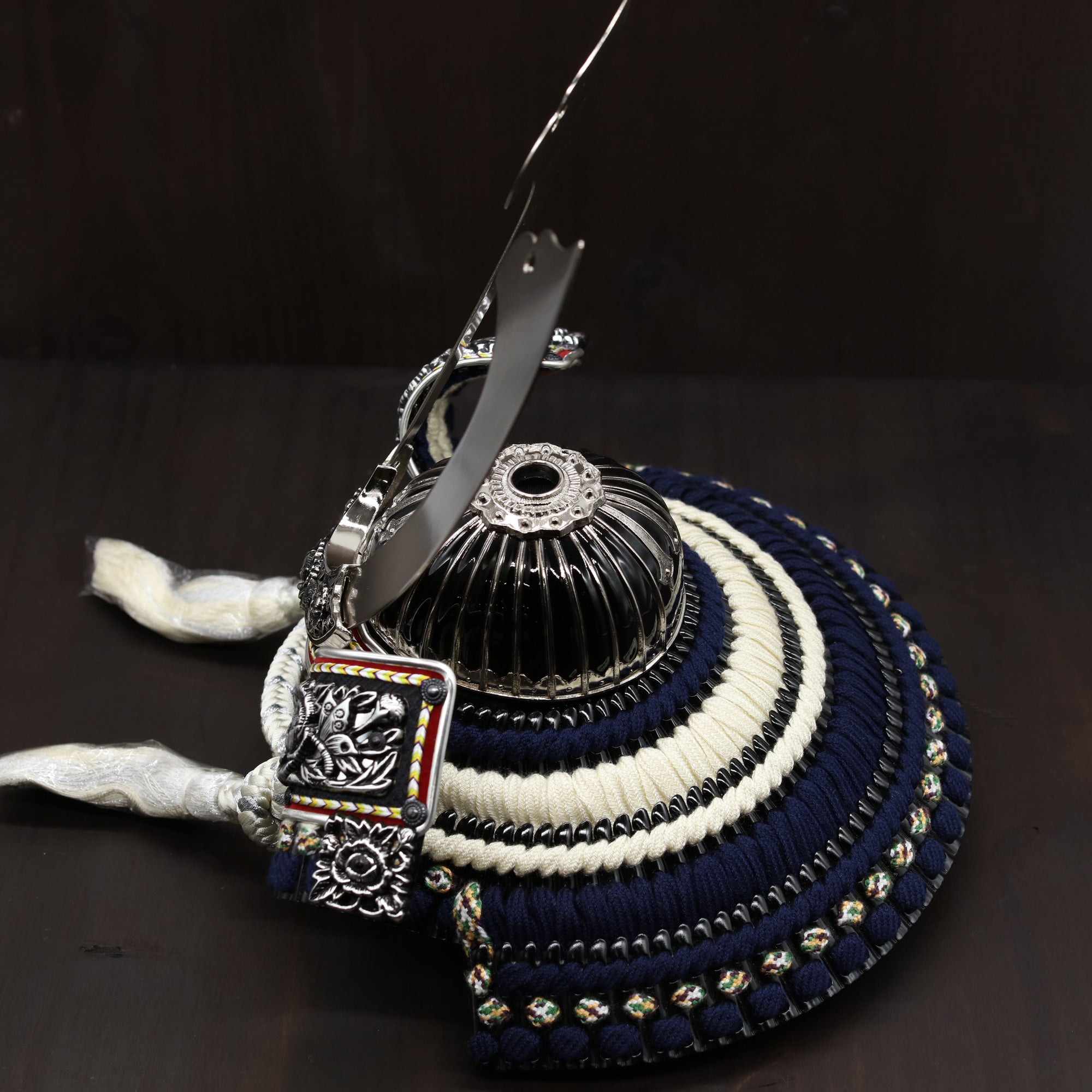 兜の後ろ姿には、白紺色の威し糸が丁寧に施されており、伝統と気品を感じさせる仕上がりとなっています。この深みのある色合いの糸が、兜全体に落ち着いた華やかさを添え、背面からも美しい印象を与えます。細部までこだわった職人の技が光る後ろ姿は、見る人の心を惹きつける存在感を放っています。