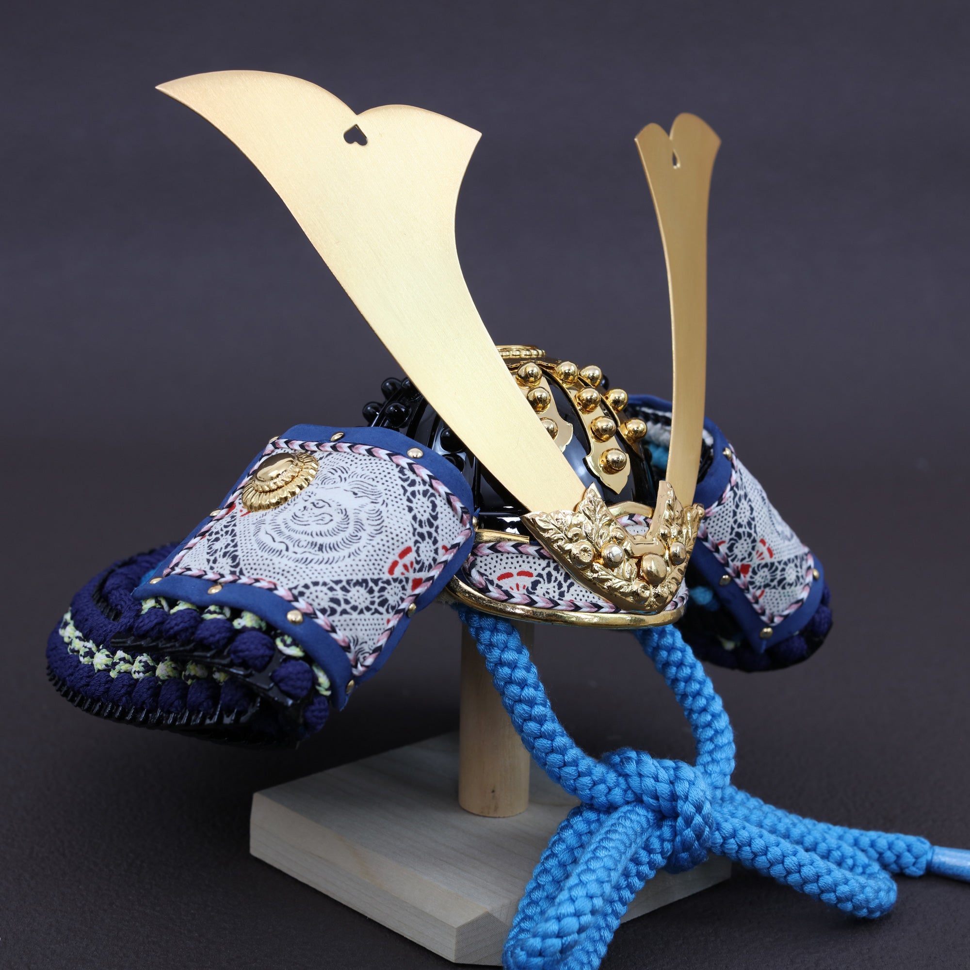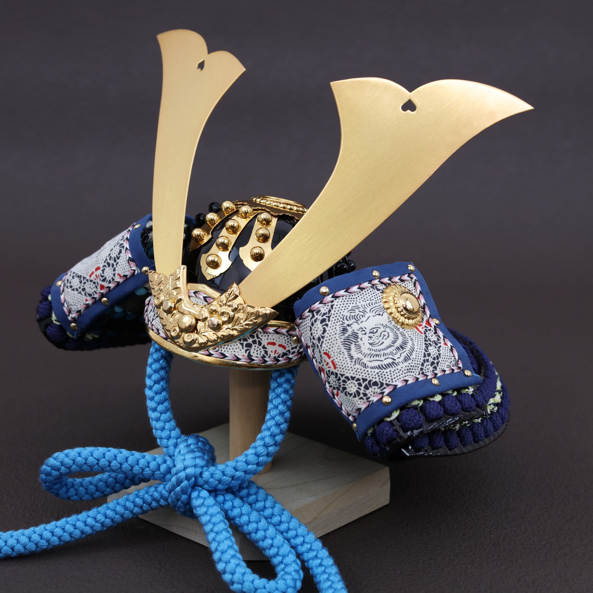 兜のこだわり 大鍬形の本金鍍金。艶を抑えた黄金の品格。 堂々とした幅を持つ大鍬形を、落ち着いた金色で仕立てました。強い光沢ではなく、やわらかな艶が兜全体に上質な華やぎを添えます。黒と赤の引き締まった配色を格上げし、飾った瞬間に格式が...