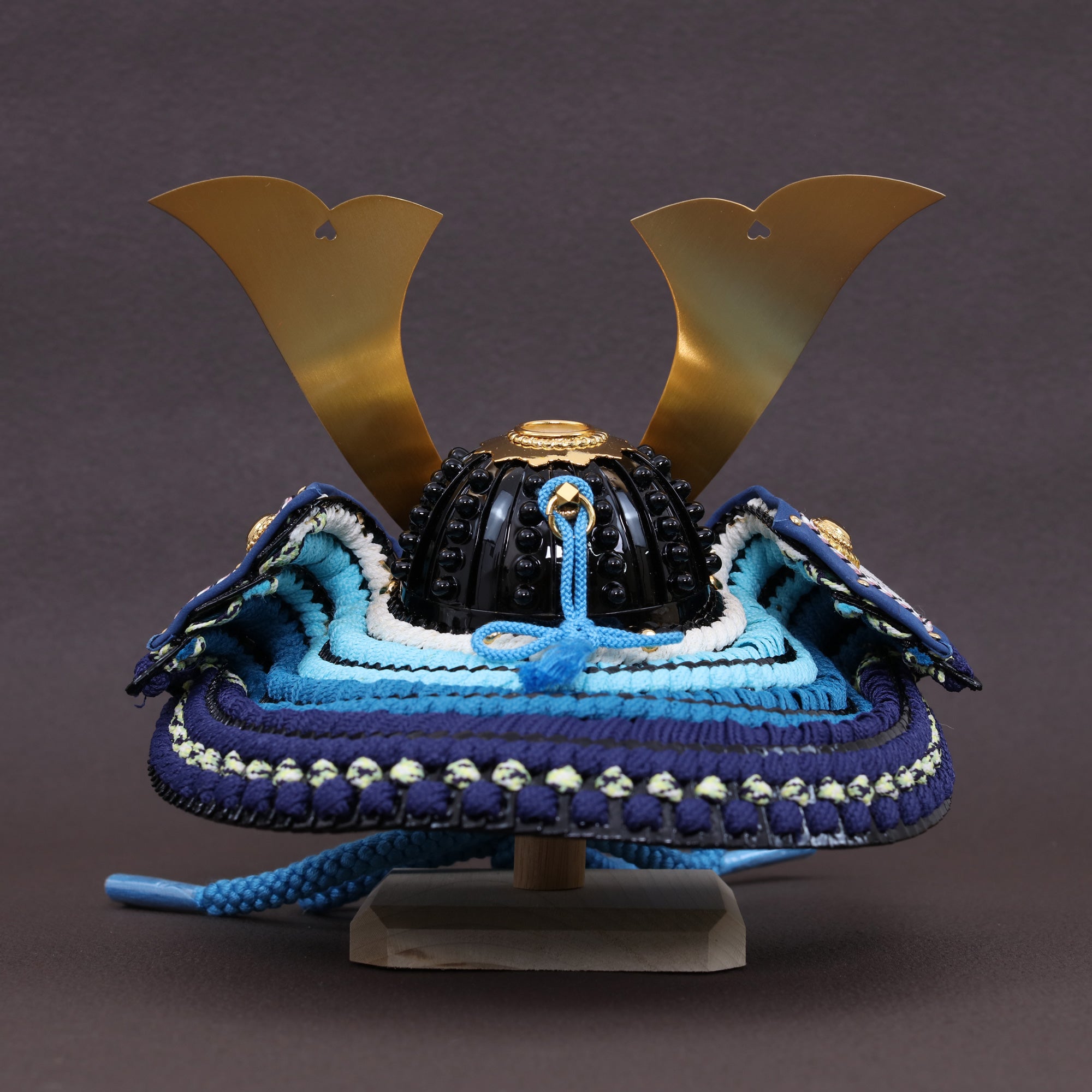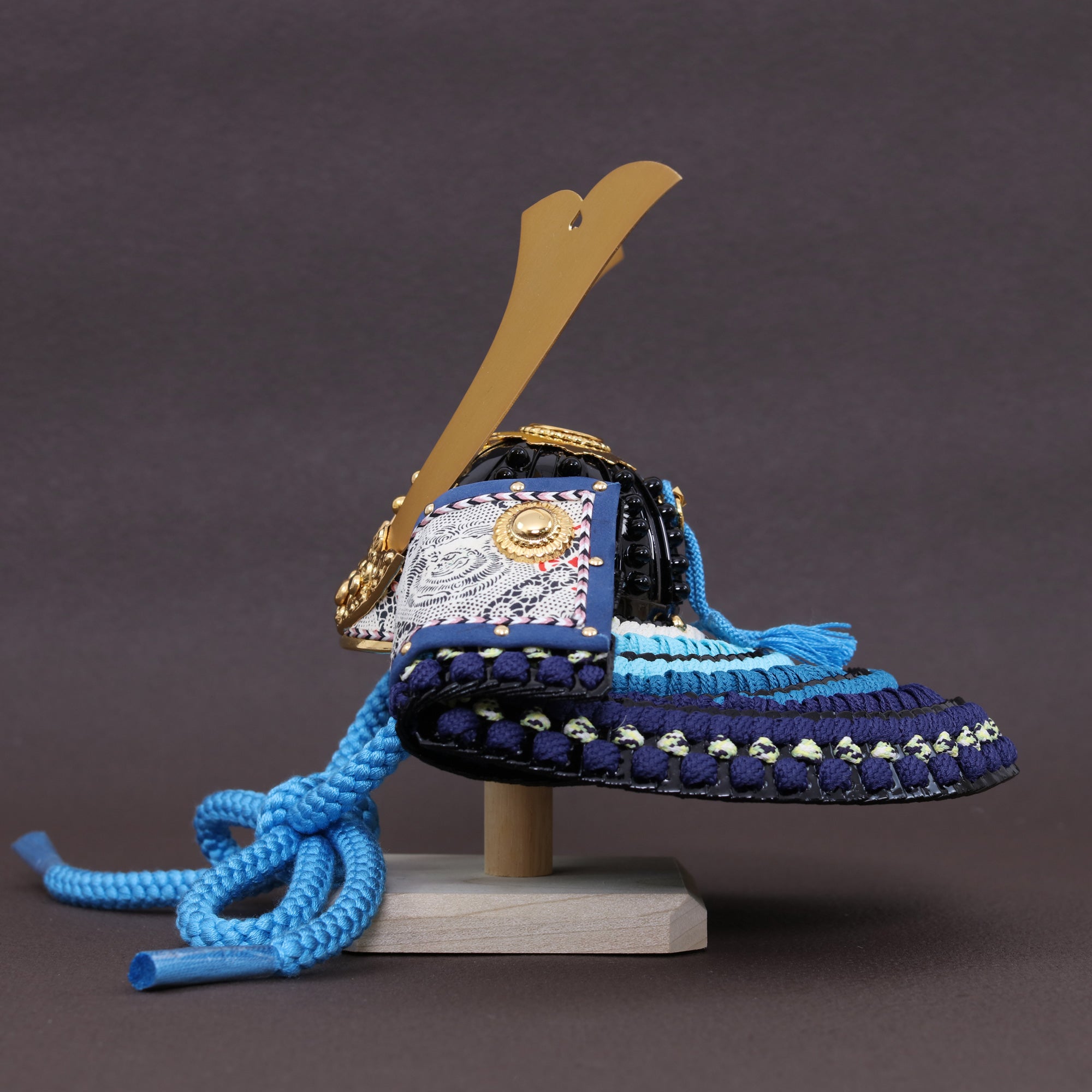紺裾濃色の威し糸で仕上げた兜の後ろ姿は、深みのある色合いの美しさが特徴です。紺から徐々に濃淡が移ろう裾濃の糸が織りなすグラデーションは、静かな中にも動きを感じさせ、洗練された奥ゆかしさを演出しています。重厚な金具や黒漆との調和が見事であり、伝統美の中に格式高い雰囲気が漂います。その緻密で芸術的な仕上がりは、日本の職人技が生む格別な美を余すことなく伝えています。