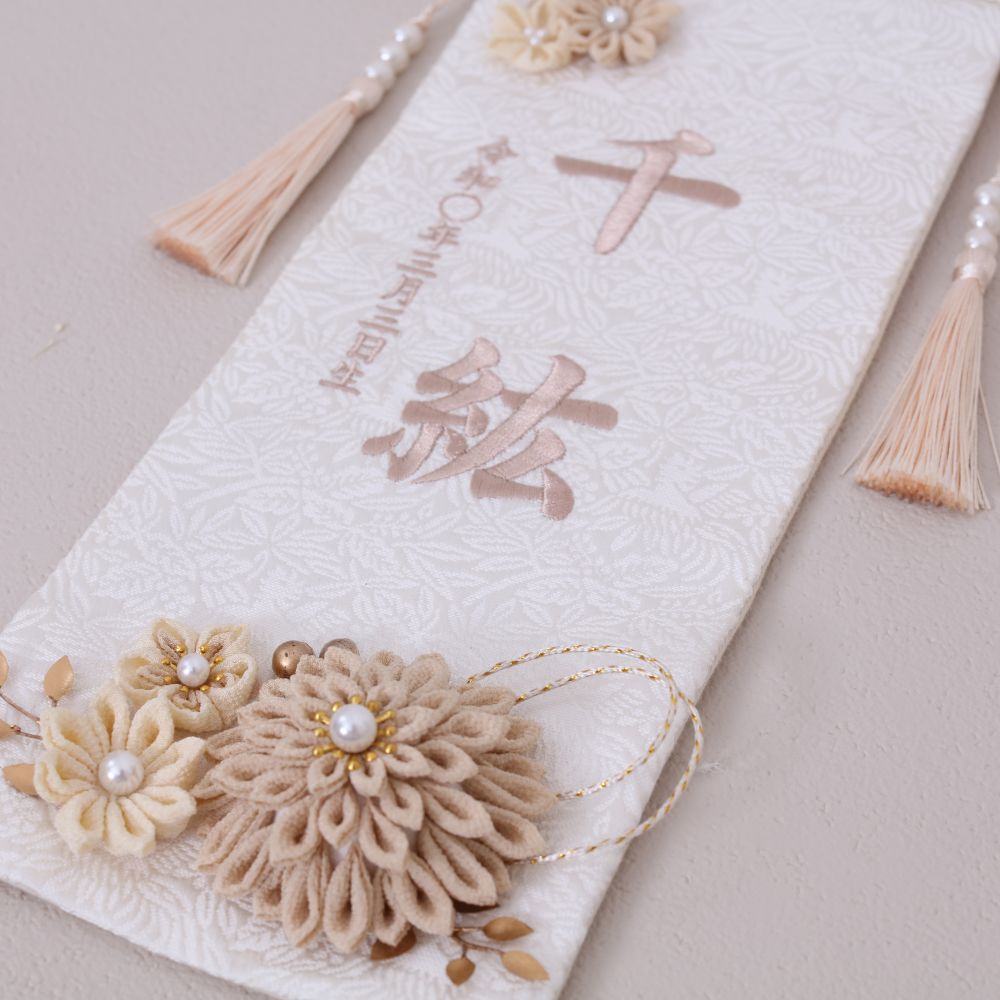 名前旗の刺繍には、京都西陣の由緒ある刺繍工房の技が息づいています。雅やかな柄刺繍は、古来から伝わる日本の美を象徴しています。この伝統を受け継ぎつつ、祈デザイナーの手によってモダンなデザインへと洗練されています。伝統と現代の感性が融合することで、時代を超えて愛される美しさが生まれます。