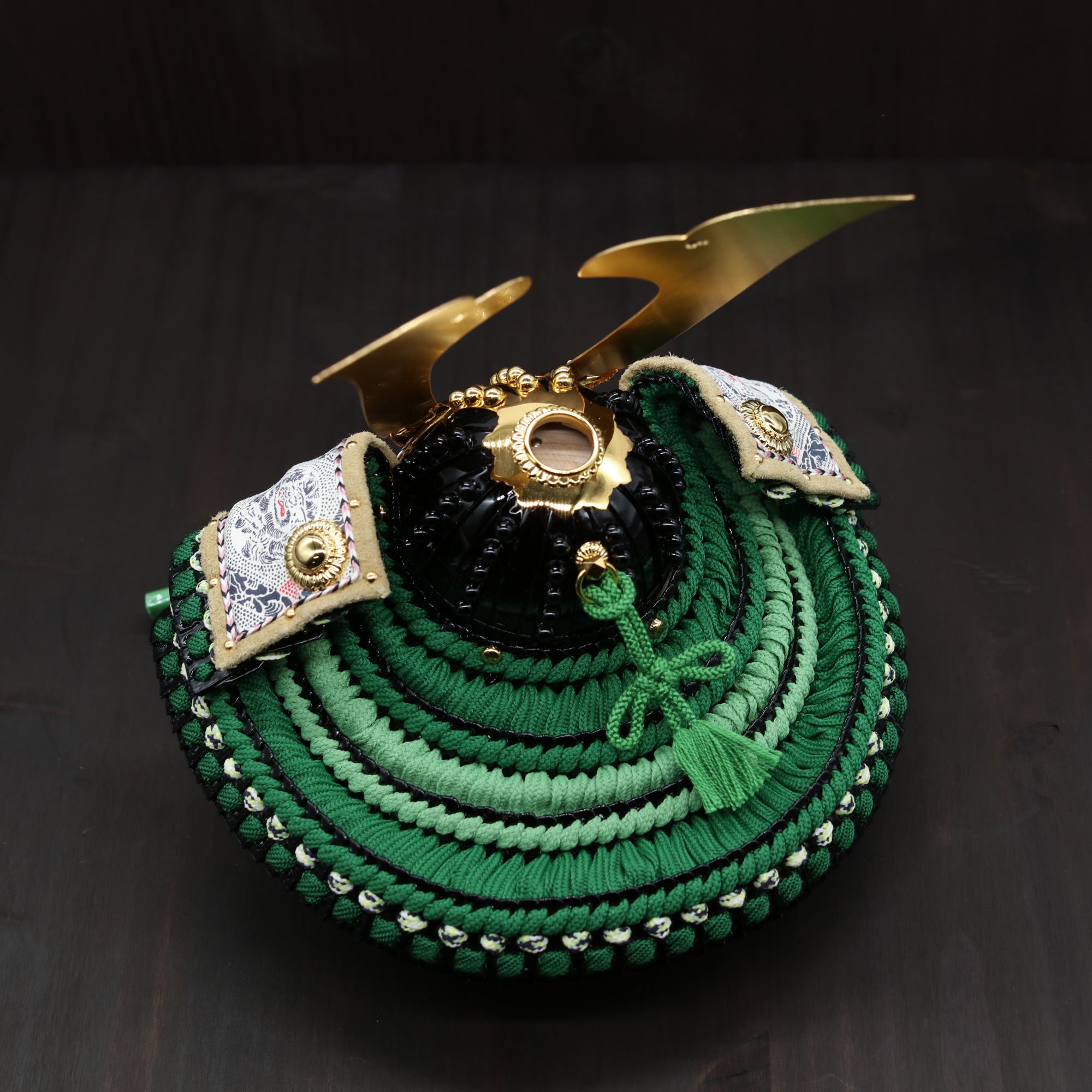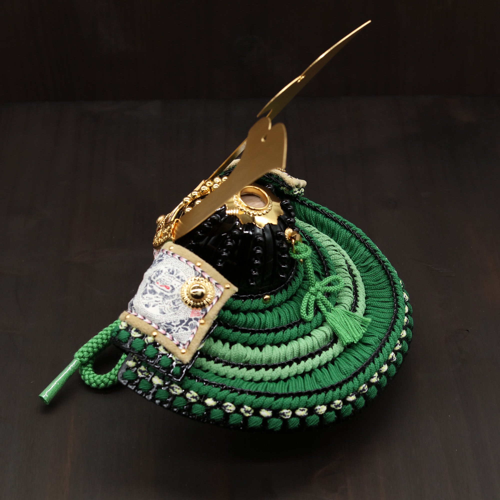 緑色の威し糸で仕上げた兜の後ろ姿は、自然の生命力と落ち着きが共存する魅力的な仕上がりです。鮮やかで深みのある緑糸が整然と並んだ垂れ部分は、新緑を思わせる爽やかさと安らぎを感じさせます。金具や濃色の素材との調和が美しく、全体にバランスの取れた品格ある印象を与えます。その瑞々しい色合いは、自然の息吹と伝統的な工芸美を融合させた唯一無二の存在感を放っています。
