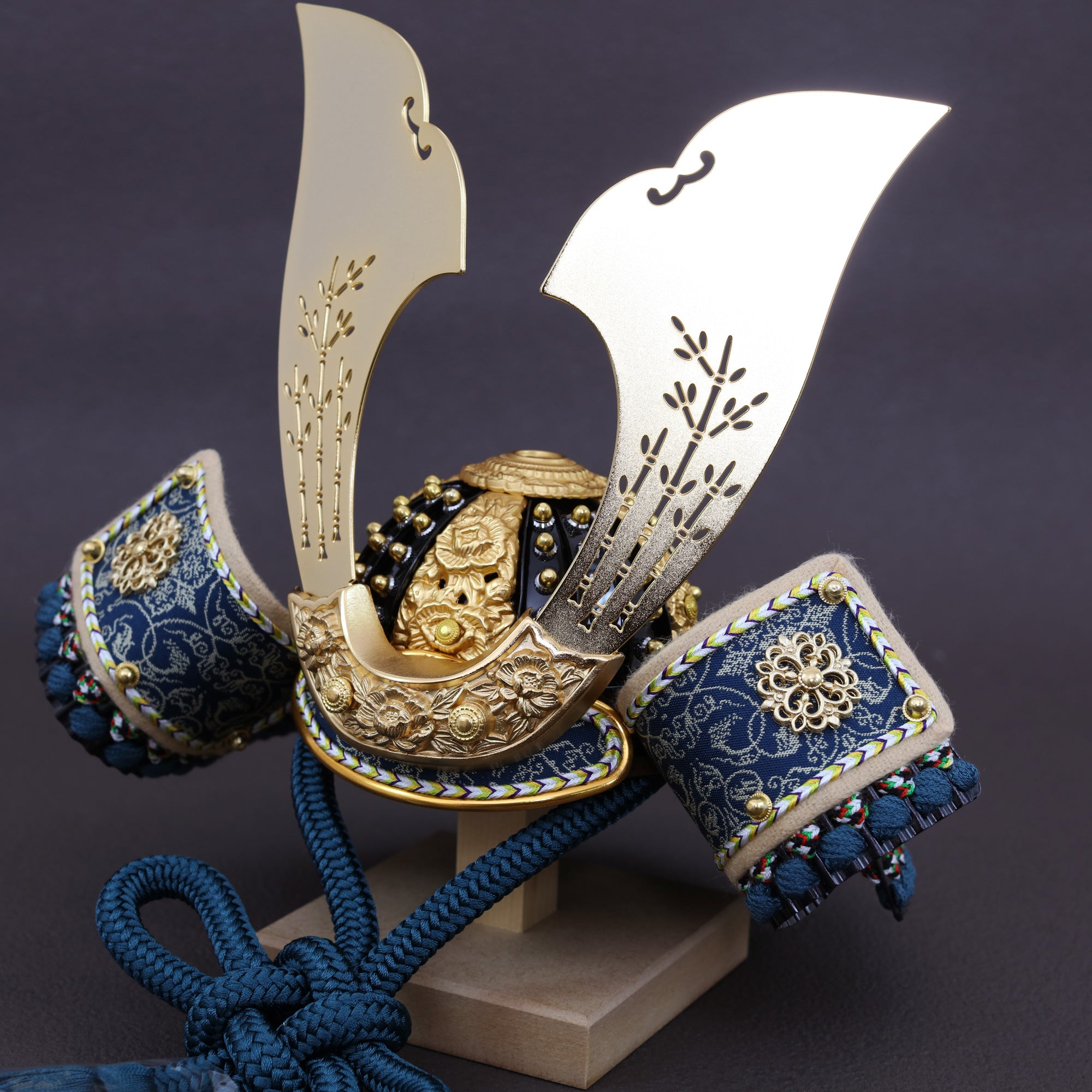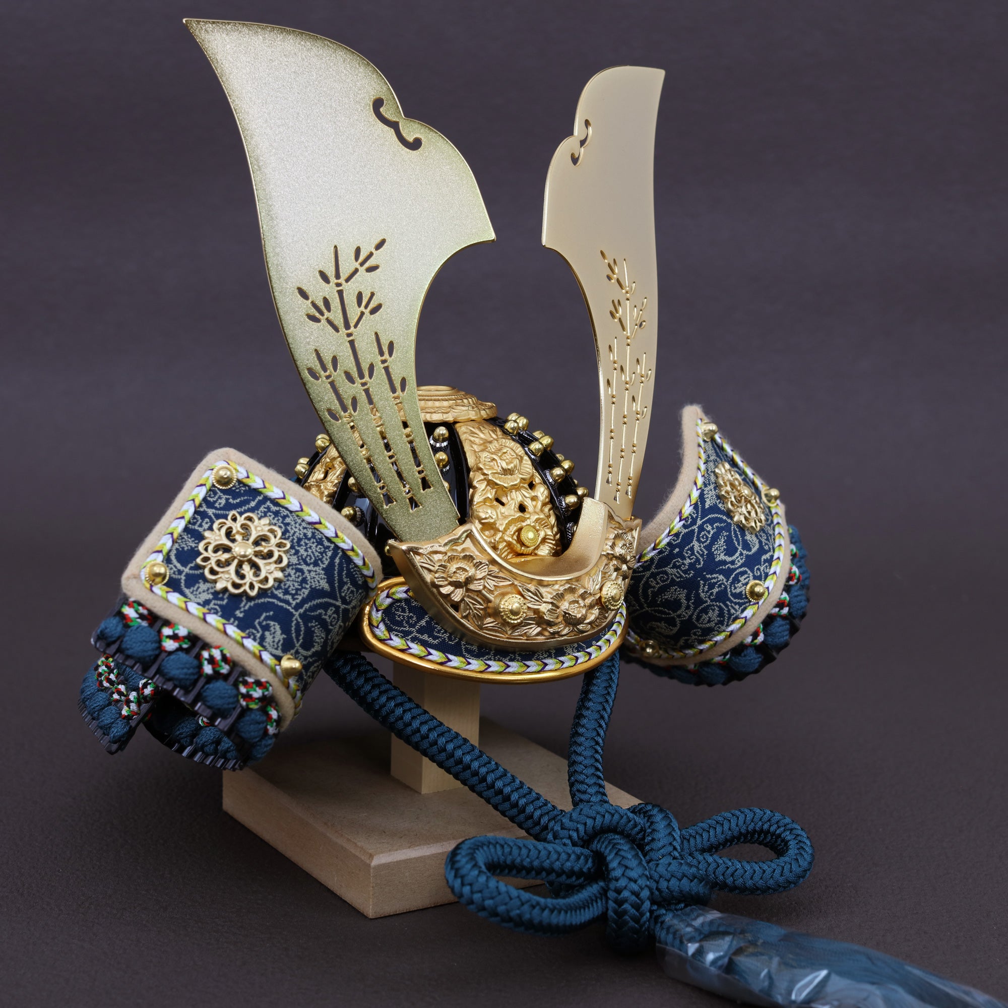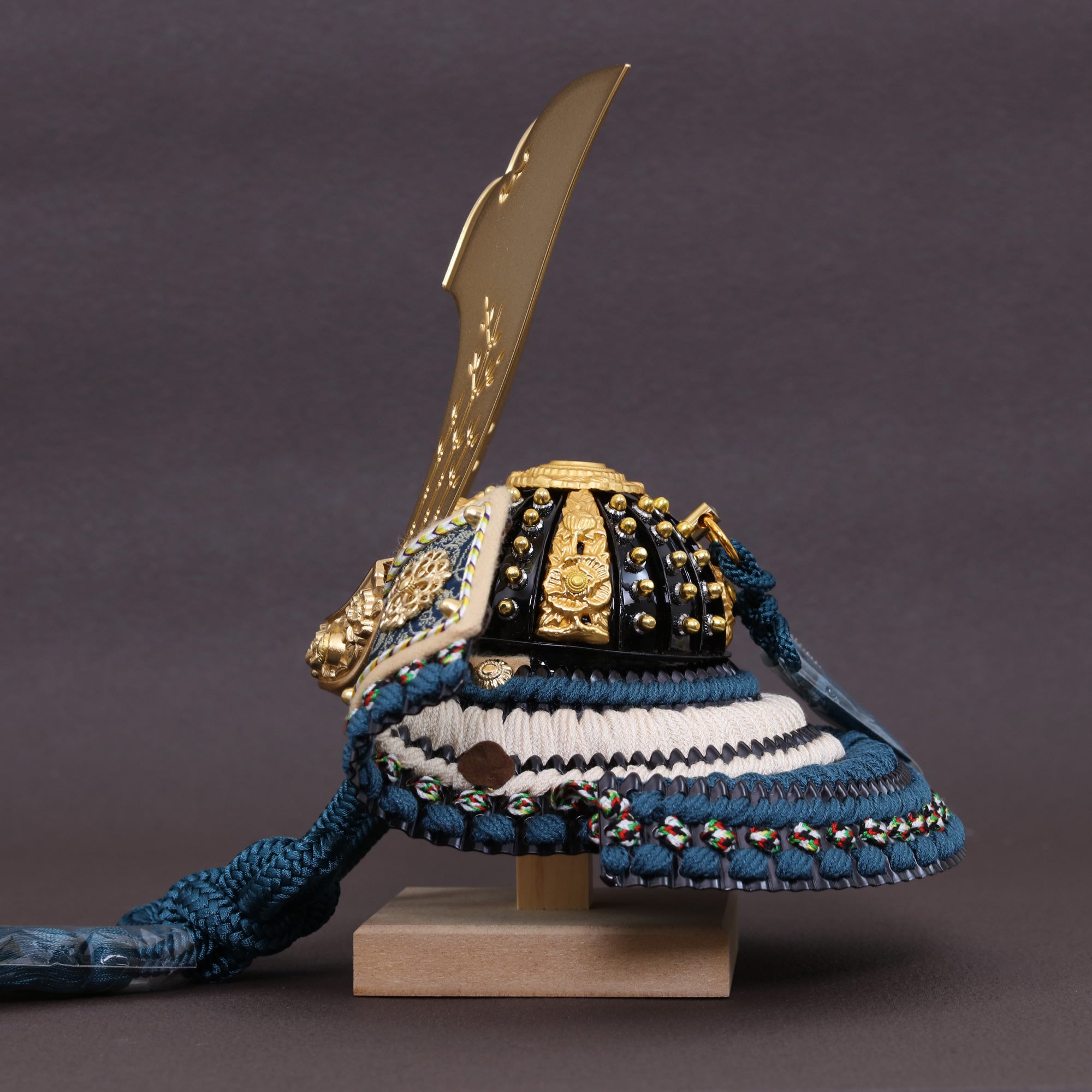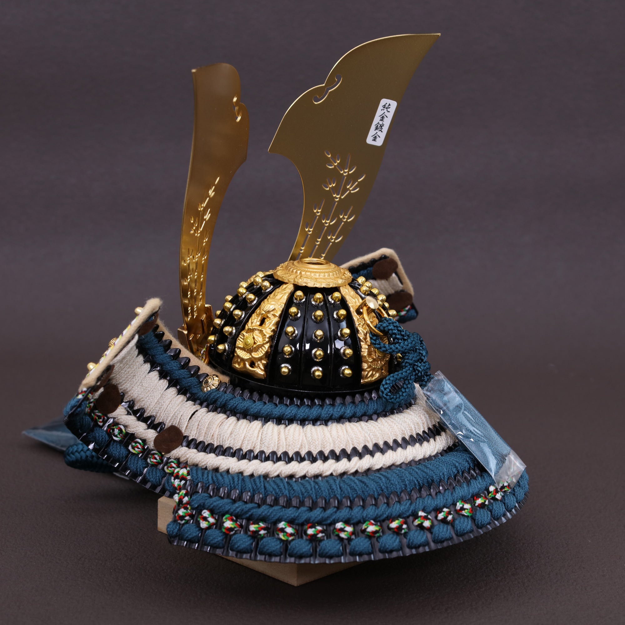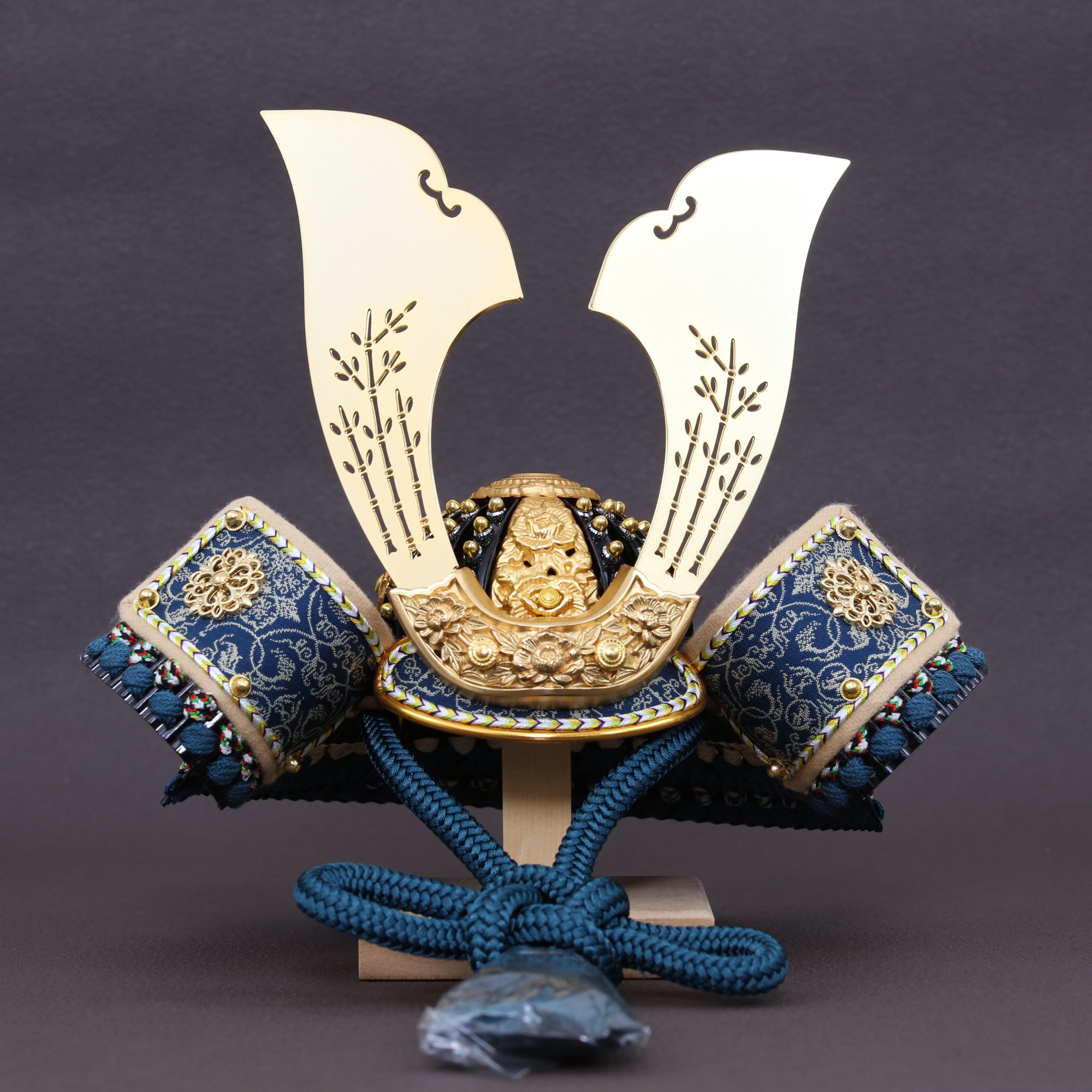 深い青緑の装いと金具の煌めきに寄り添い、上品で洗練された存在感を放つ鍬形です。