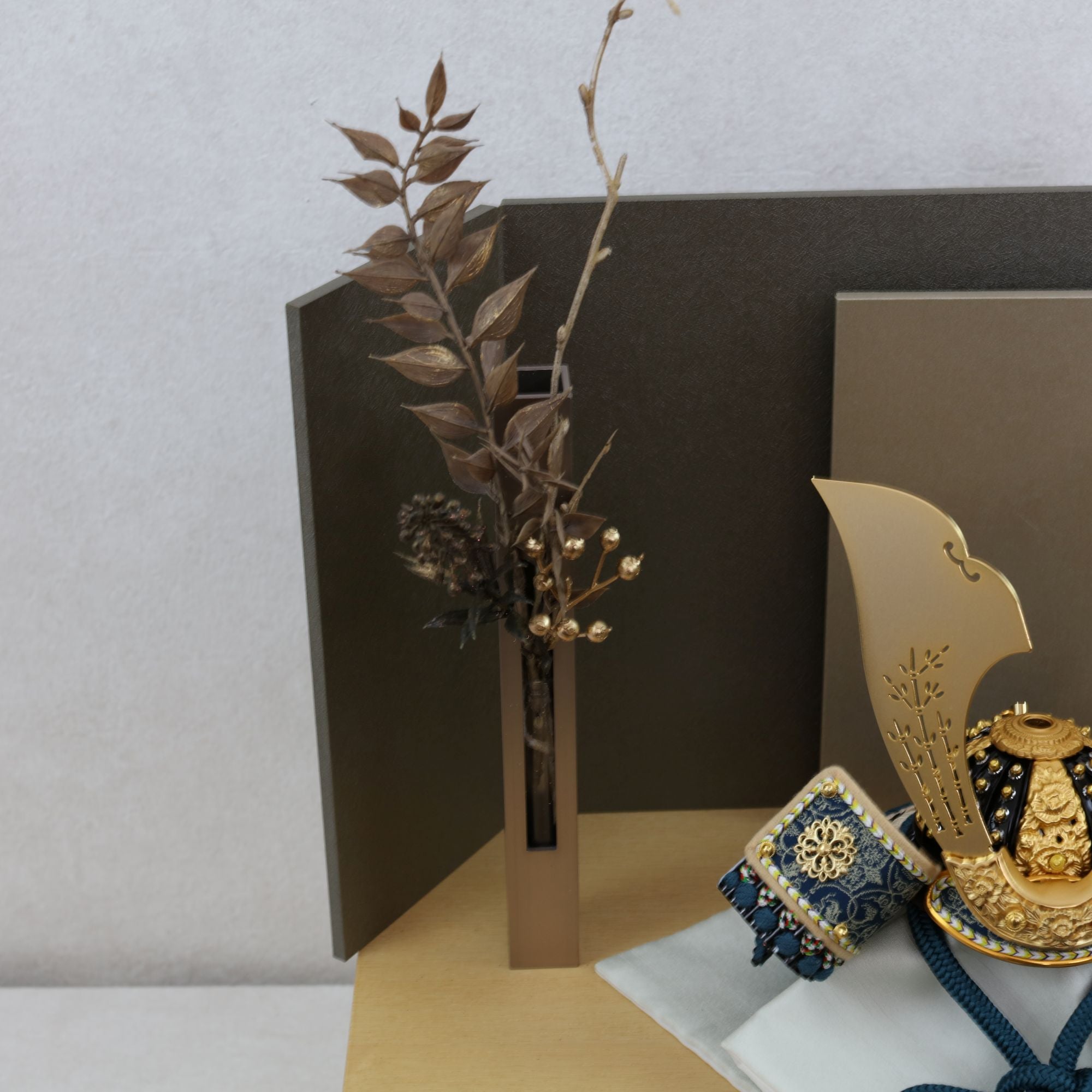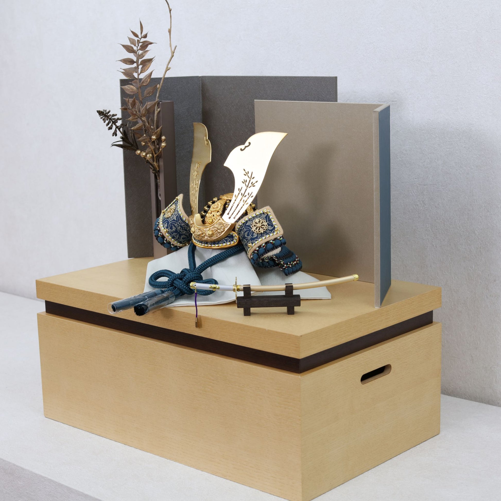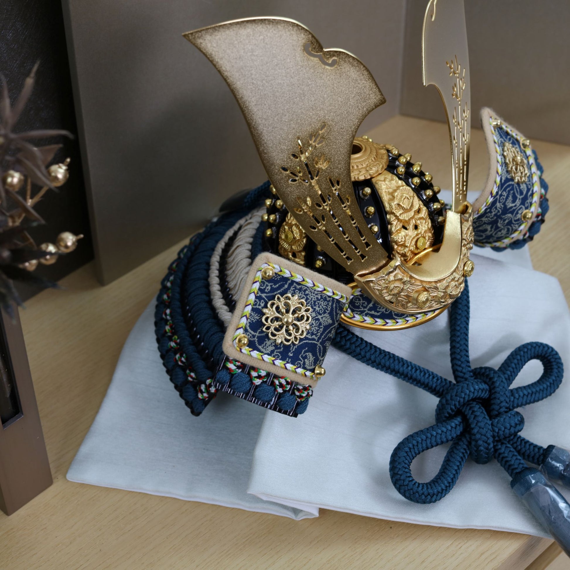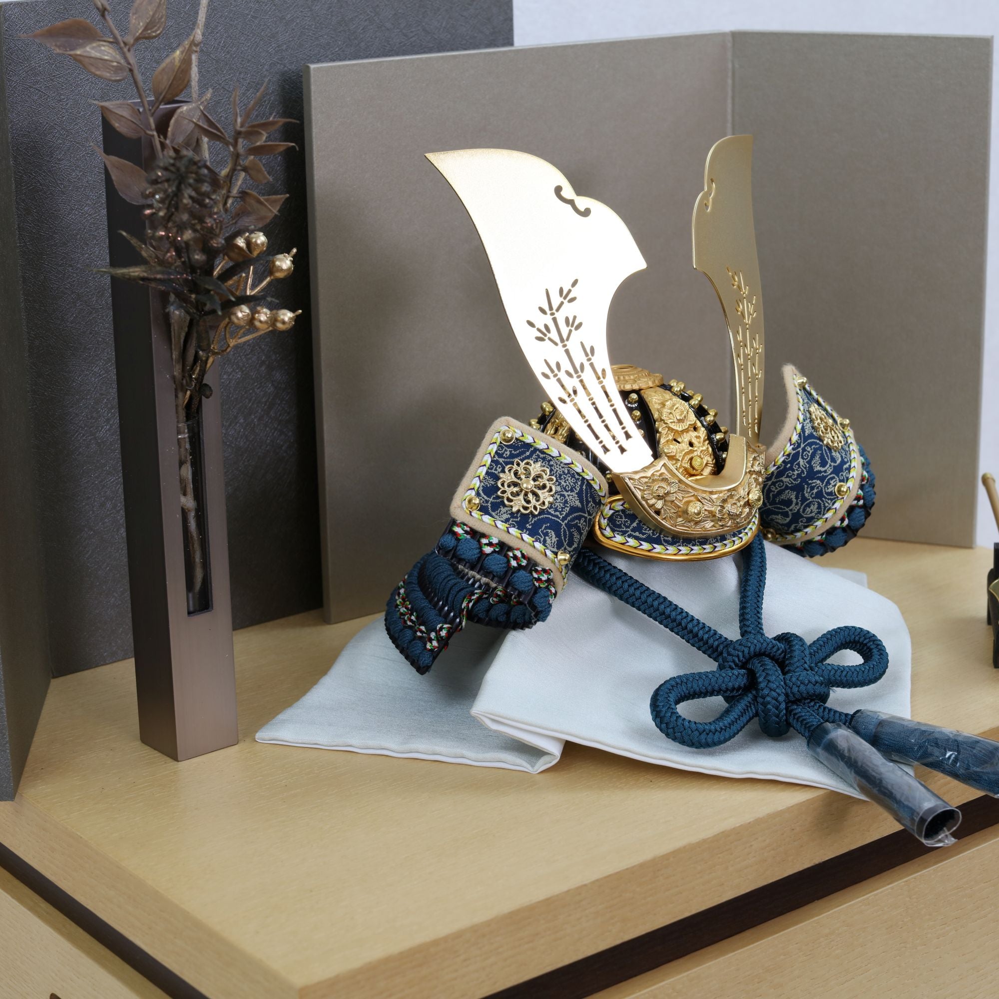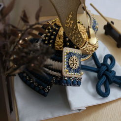 深い青緑の装いと金具の煌めきに寄り添い、上品で洗練された存在感を放つ鍬形です。