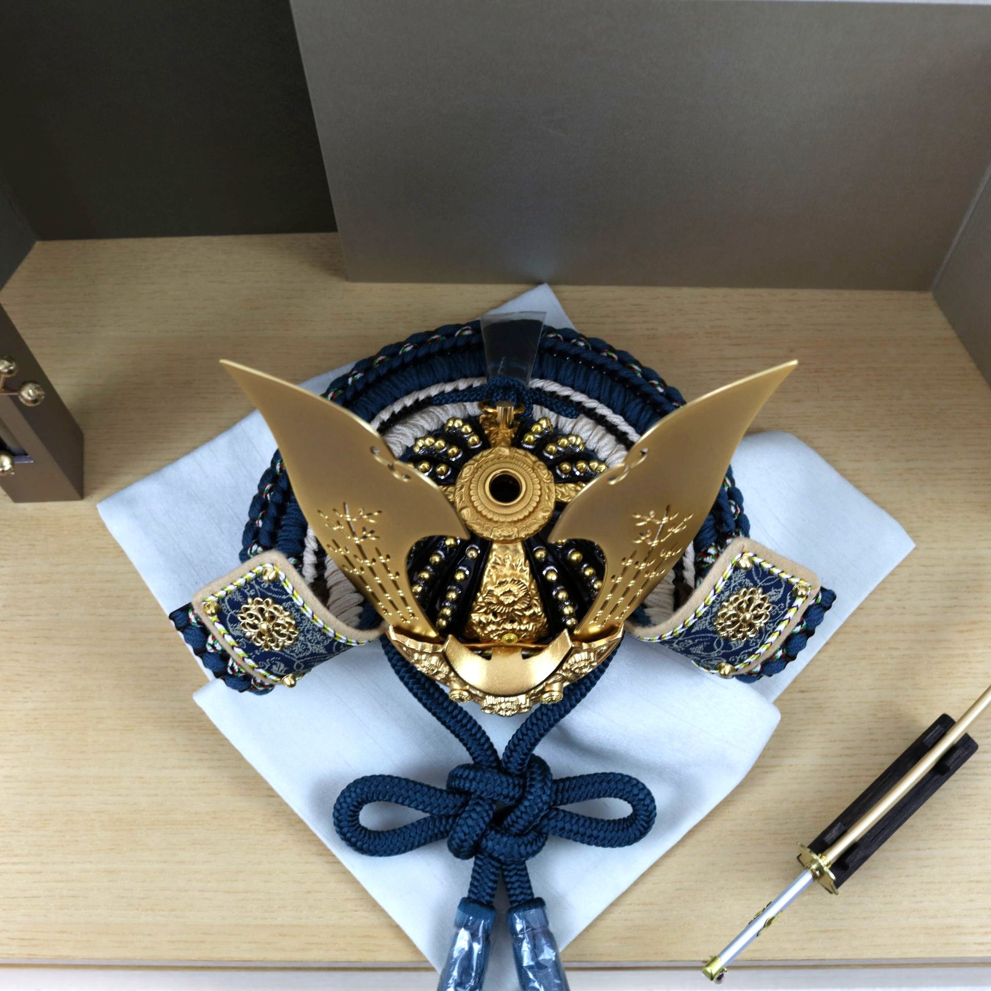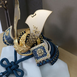 兜の後ろ姿には、青藍色の威し糸が丁寧に施されており、伝統と気品を感じさせる仕上がりとなっています。この深みのある色合いの糸が、兜全体に落ち着いた華やかさを添え、背面からも美しい印象を与えます。細部までこだわった職人の技が光る後ろ姿は、見る人の心を惹きつける存在感を放っています。