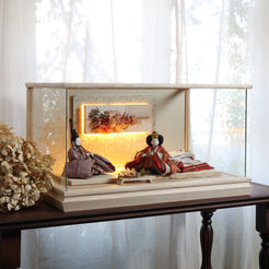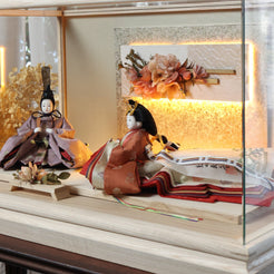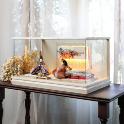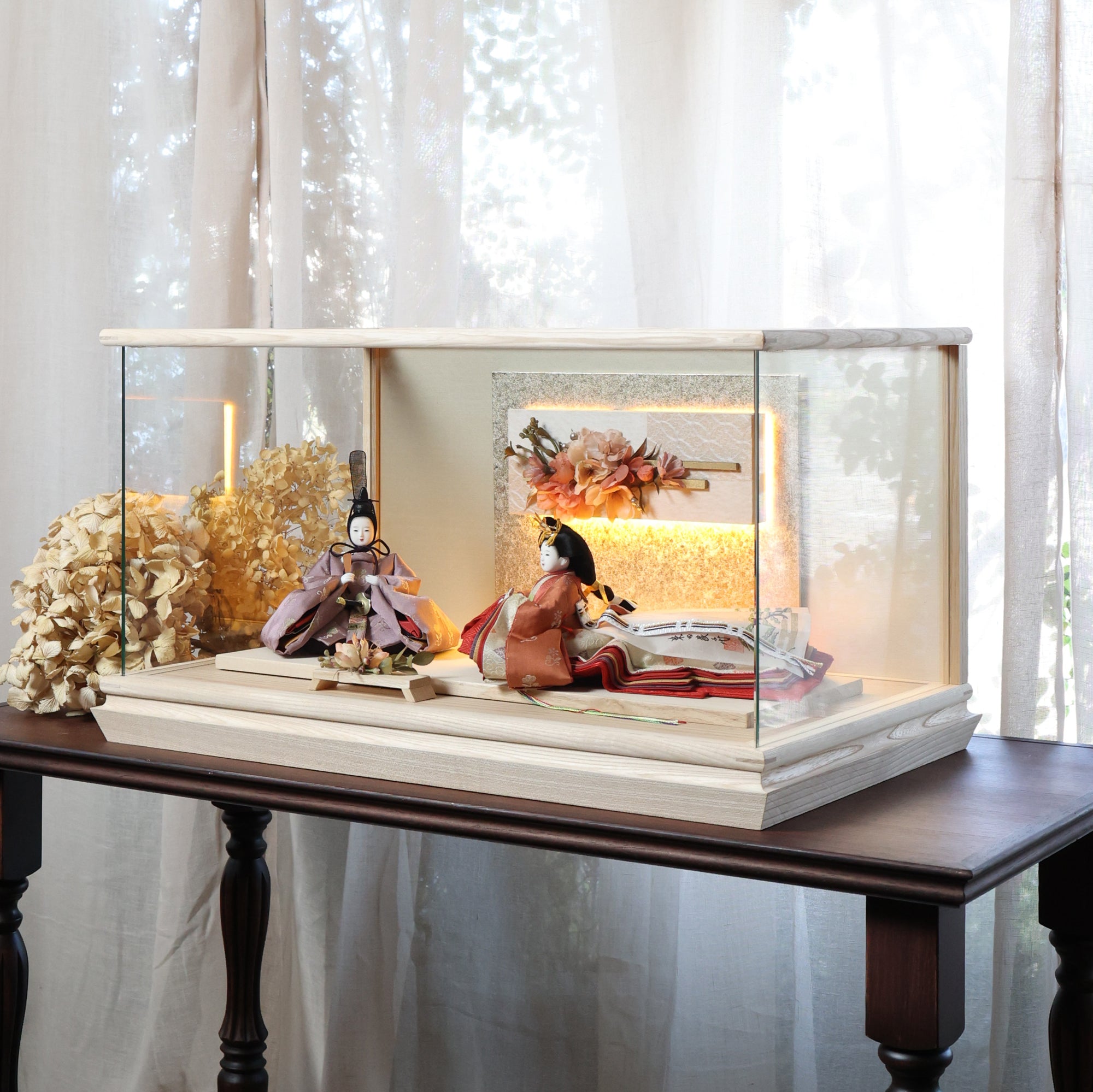 通常2mm厚が一般的な中、当店ではより高品質なAGC製3mmガラスを採用しています。厚みが増すことで強度と安全性が高まり、透明度の高いクリアな美しさを保ちます。大切な雛人形を守りながら、高級感のある見栄えを実現しています。