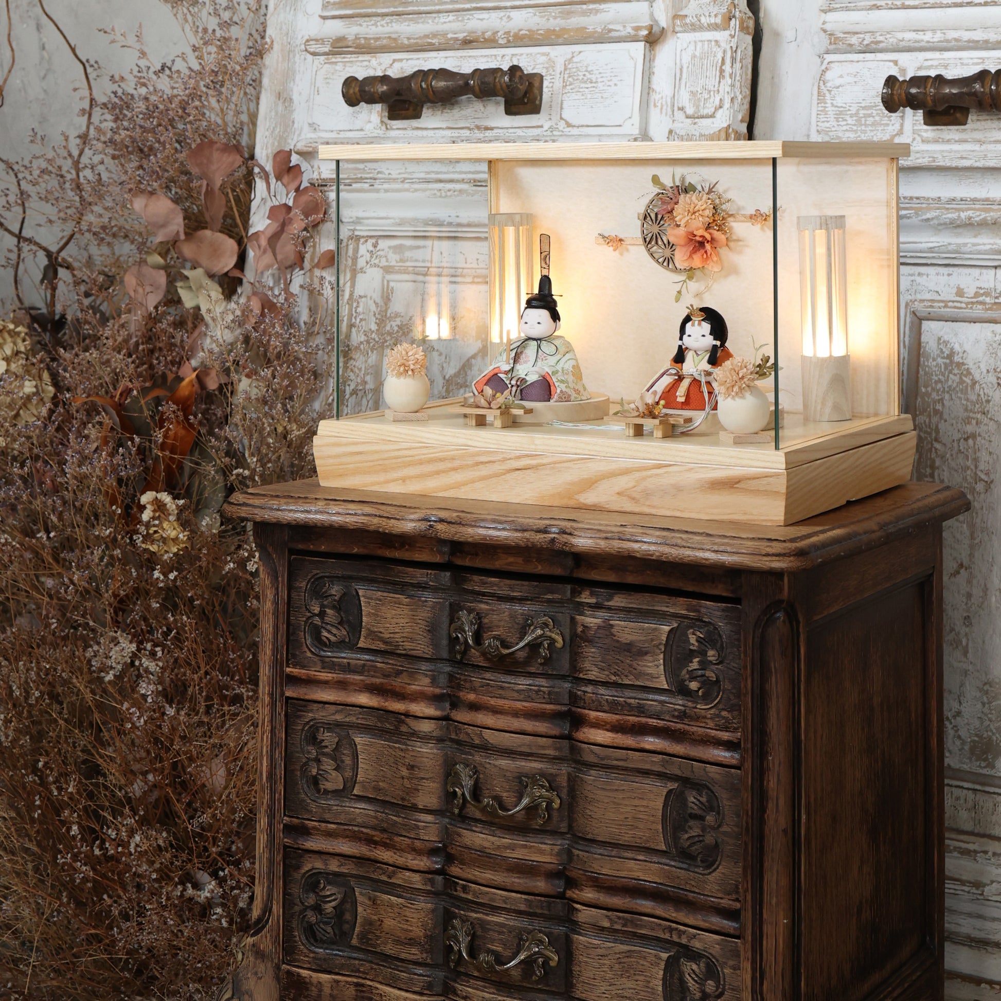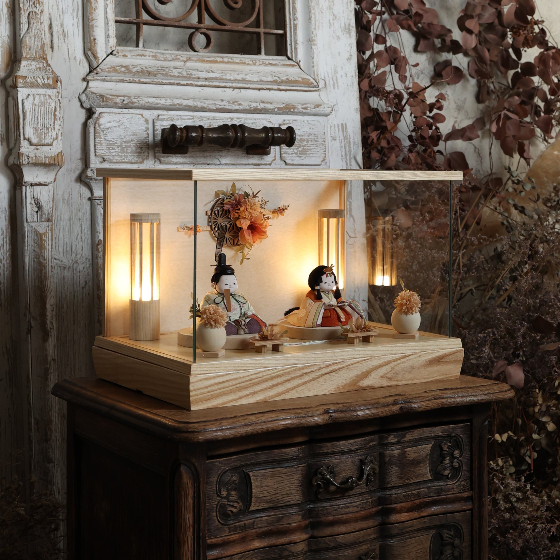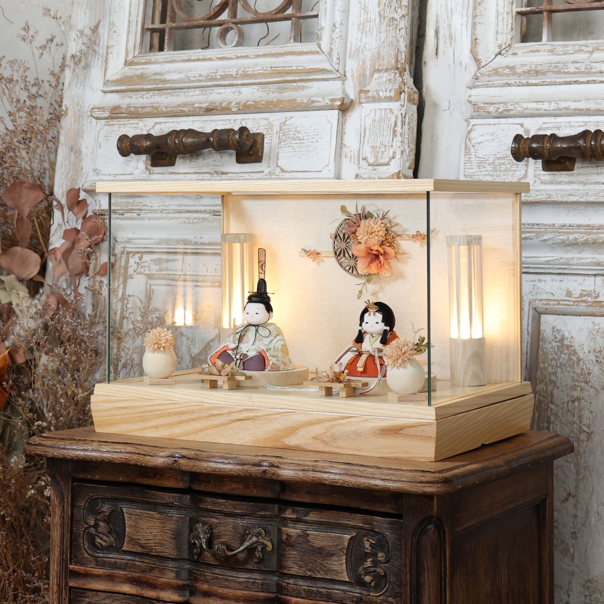 通常2mm厚が一般的な中、当店ではより高品質なAGC製3mmガラスを採用しています。厚みが増すことで強度と安全性が高まり、透明度の高いクリアな美しさを保ちます。大切な雛人形を守りながら、高級感のある見栄えを実現しています。