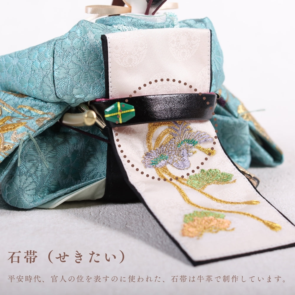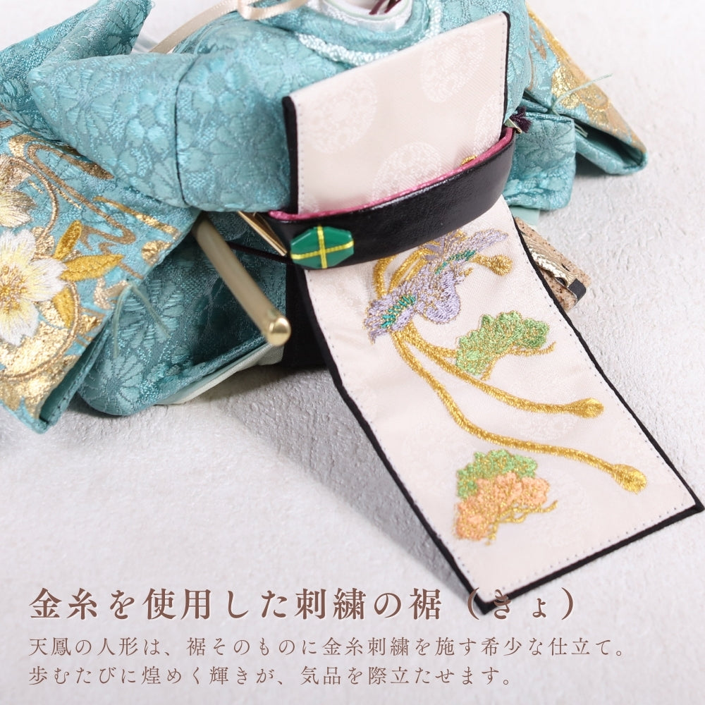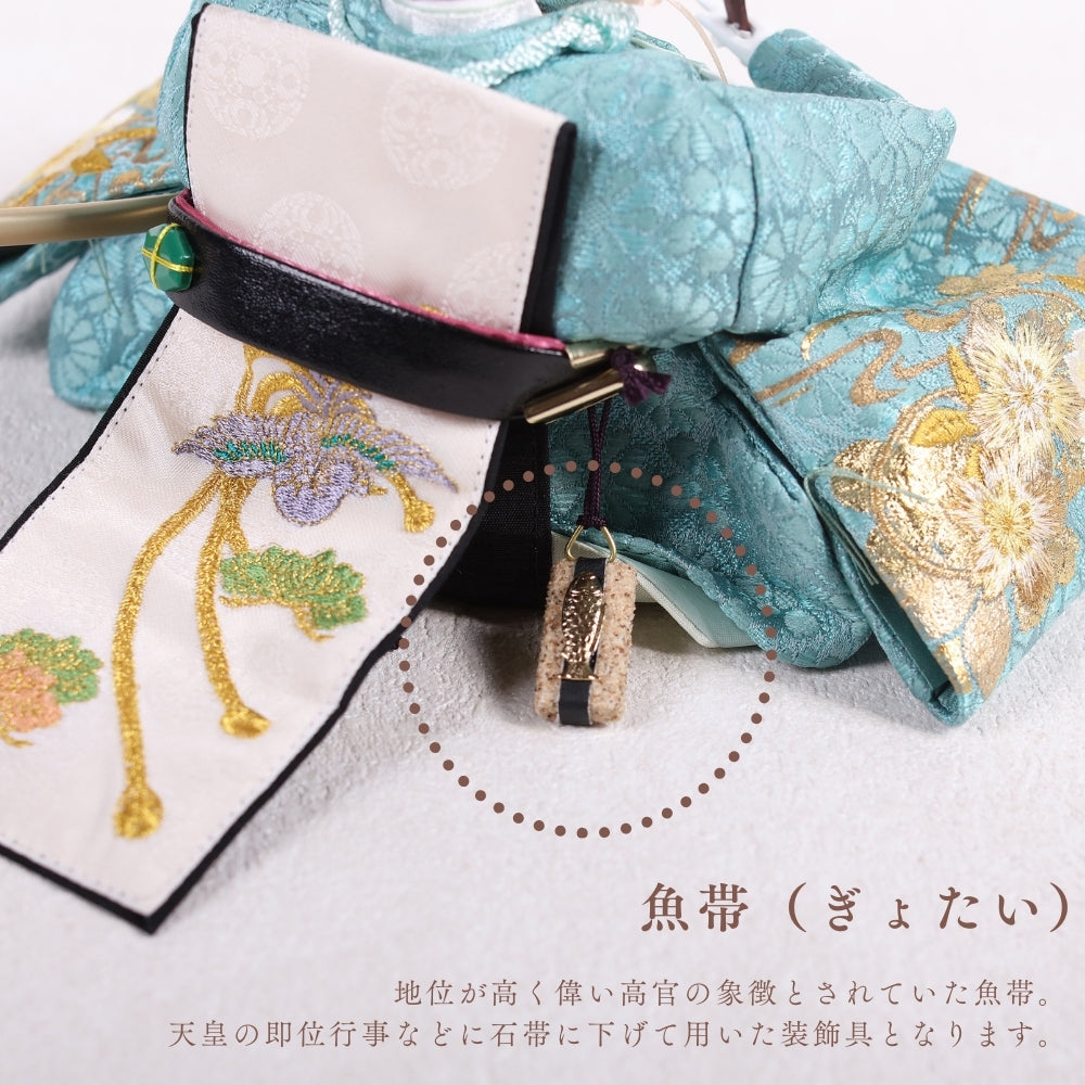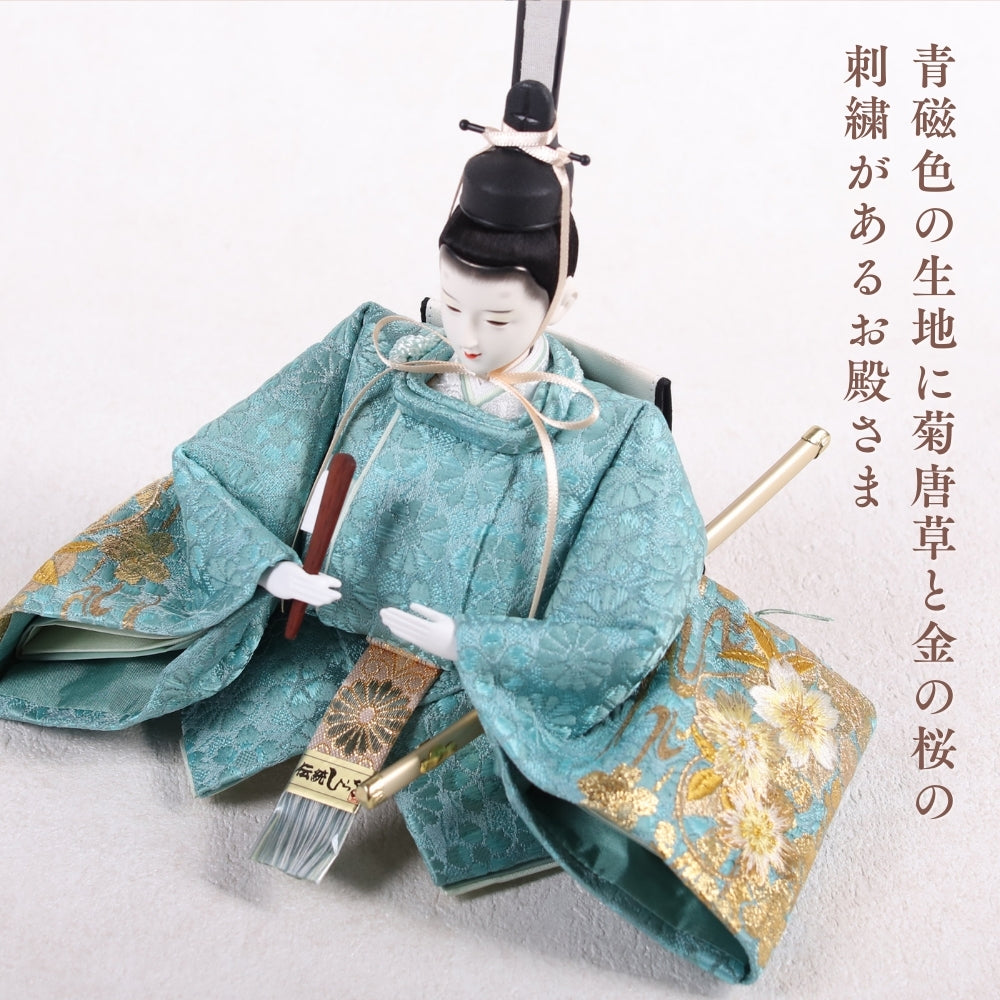 青磁色の生地に菊唐草と金の桜の刺繍が施されたお殿さまです。清らかで華やかな色合いが、子どもたちの成長と幸せを願います