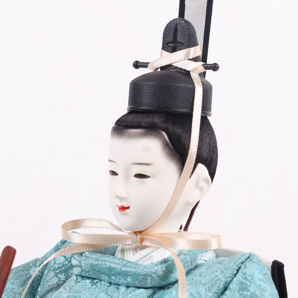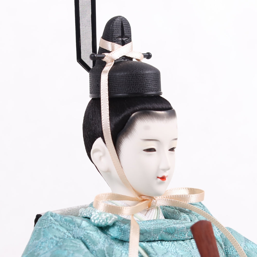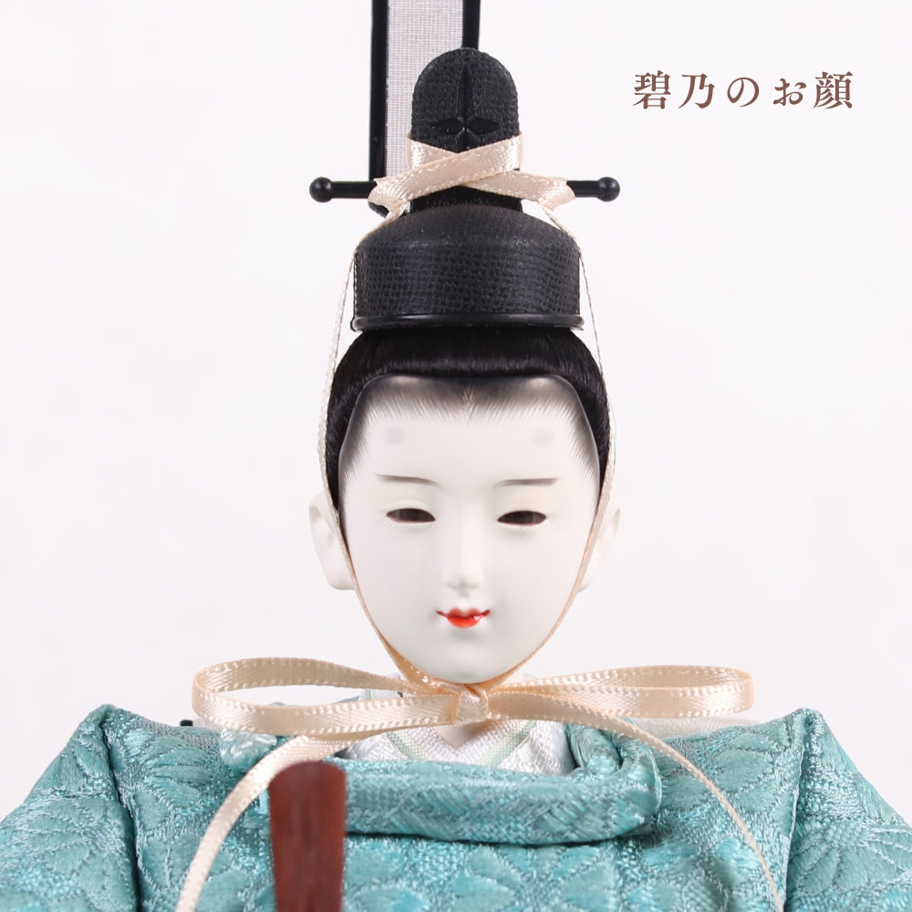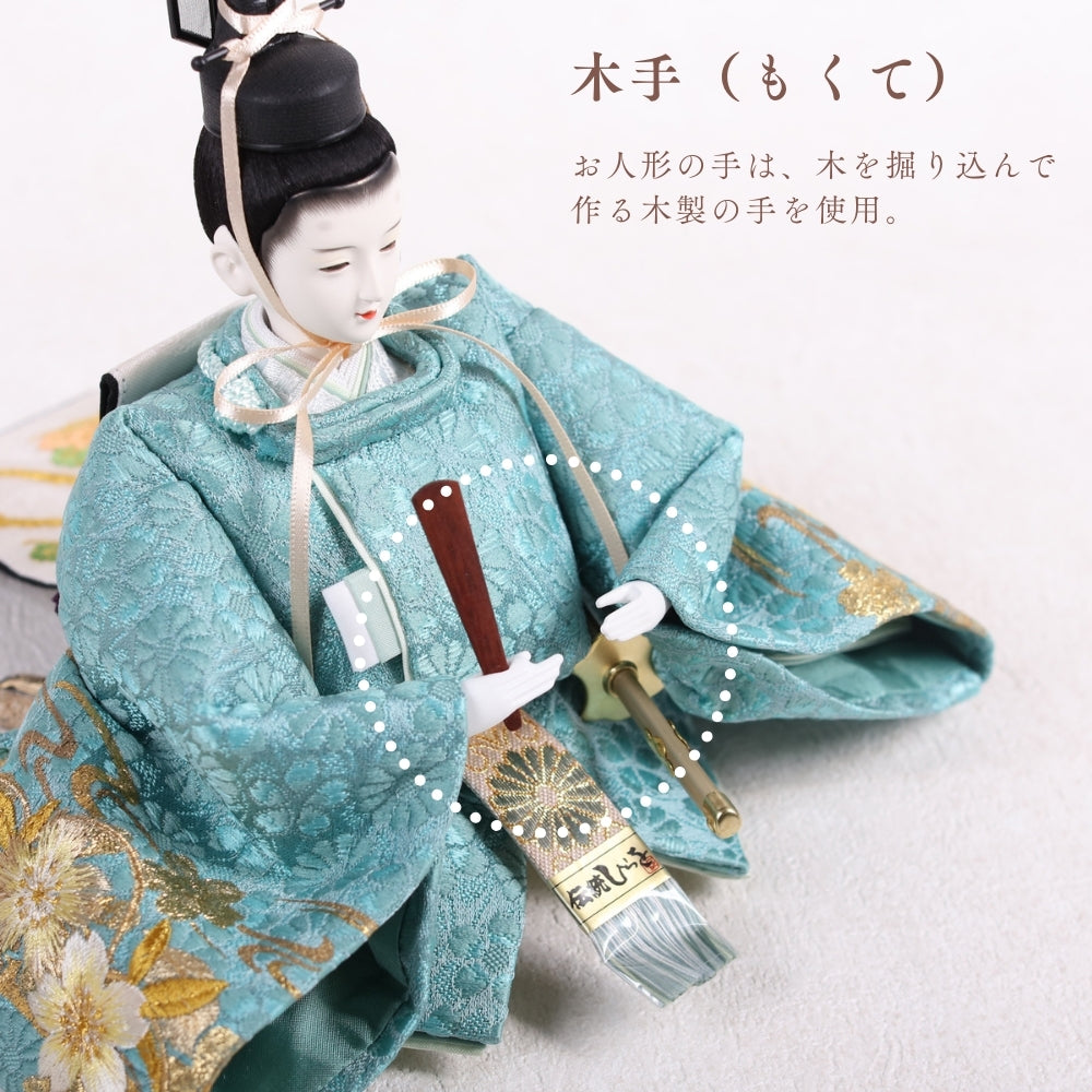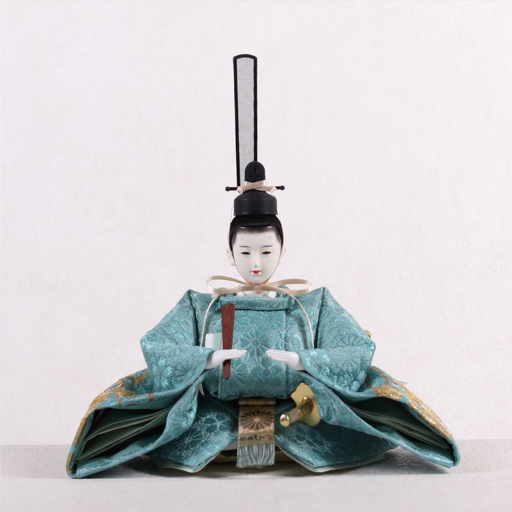 青磁色の生地に菊唐草と金の桜の刺繍が施されたお殿さまです。清らかで華やかな色合いが、子どもたちの成長と幸せを願います