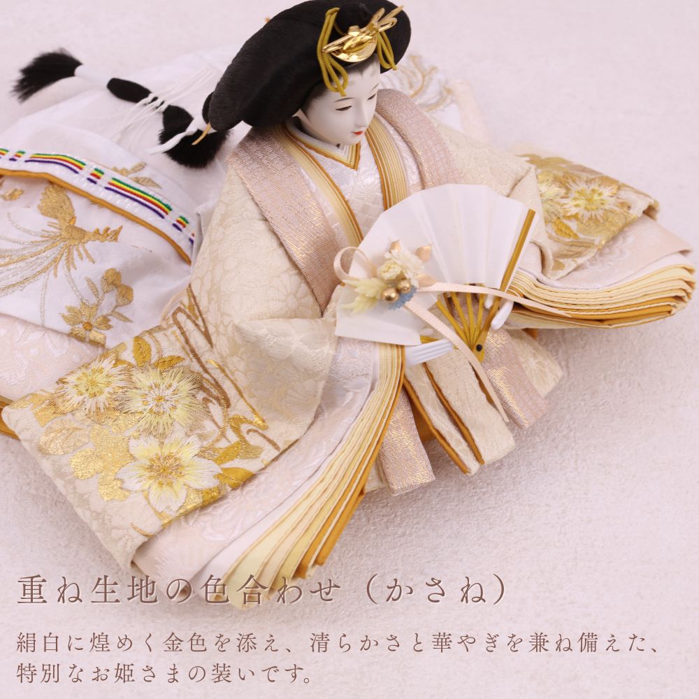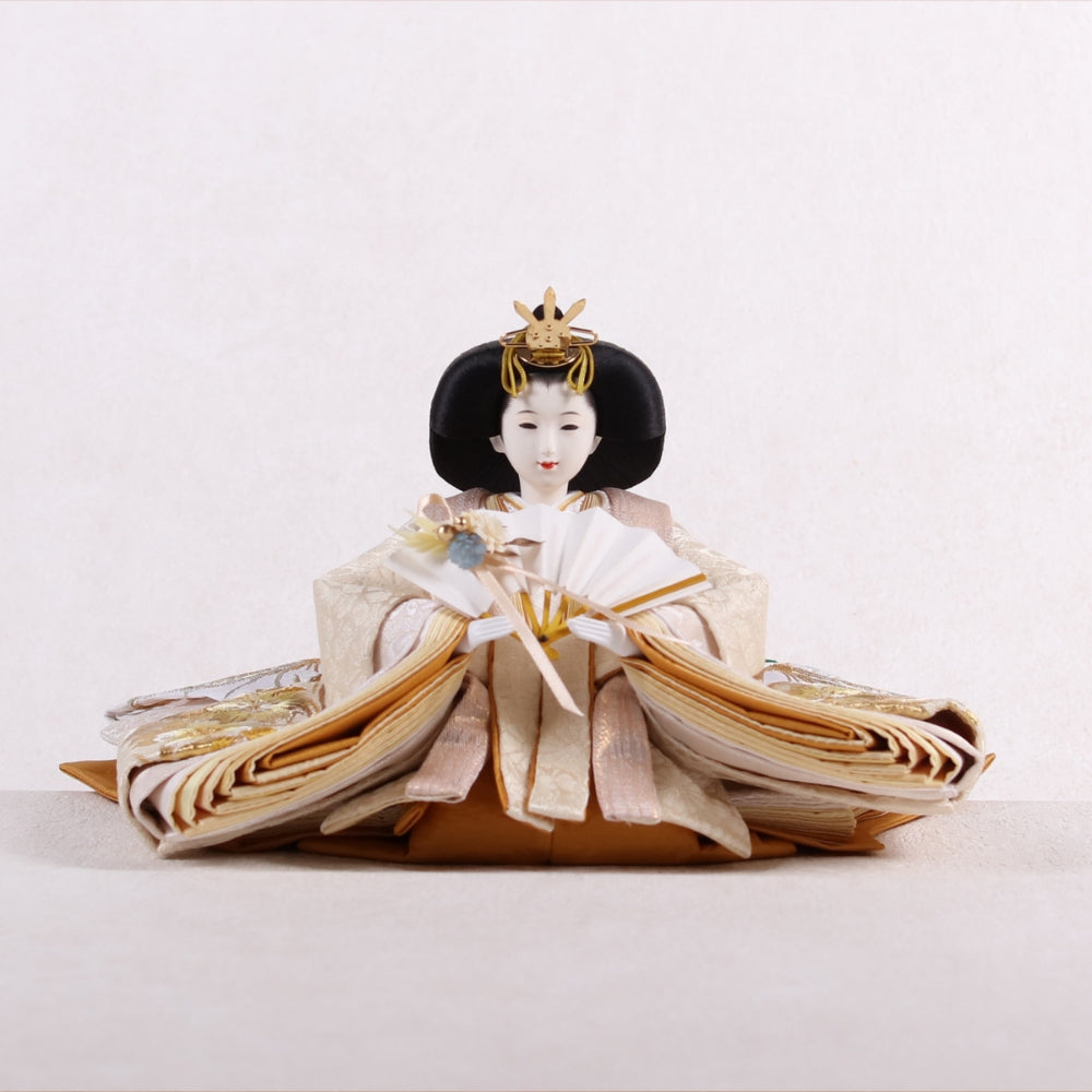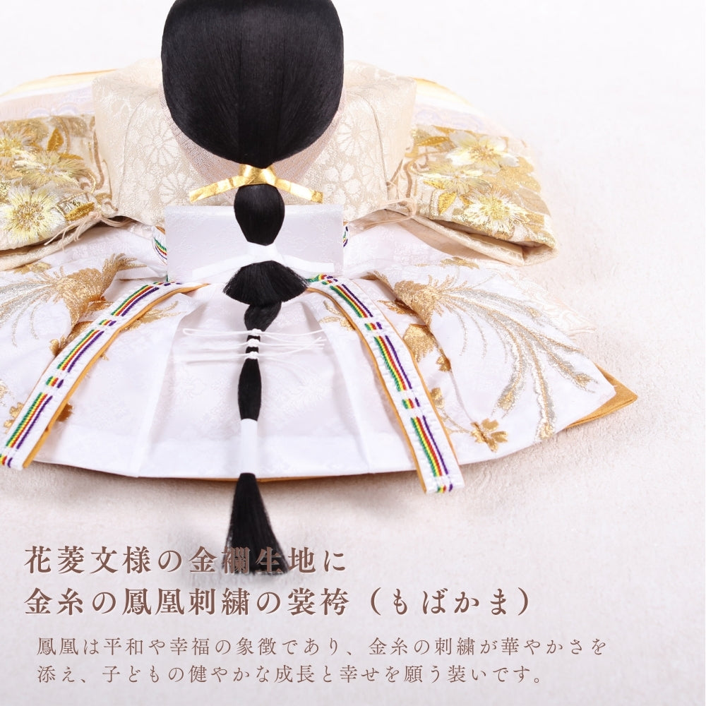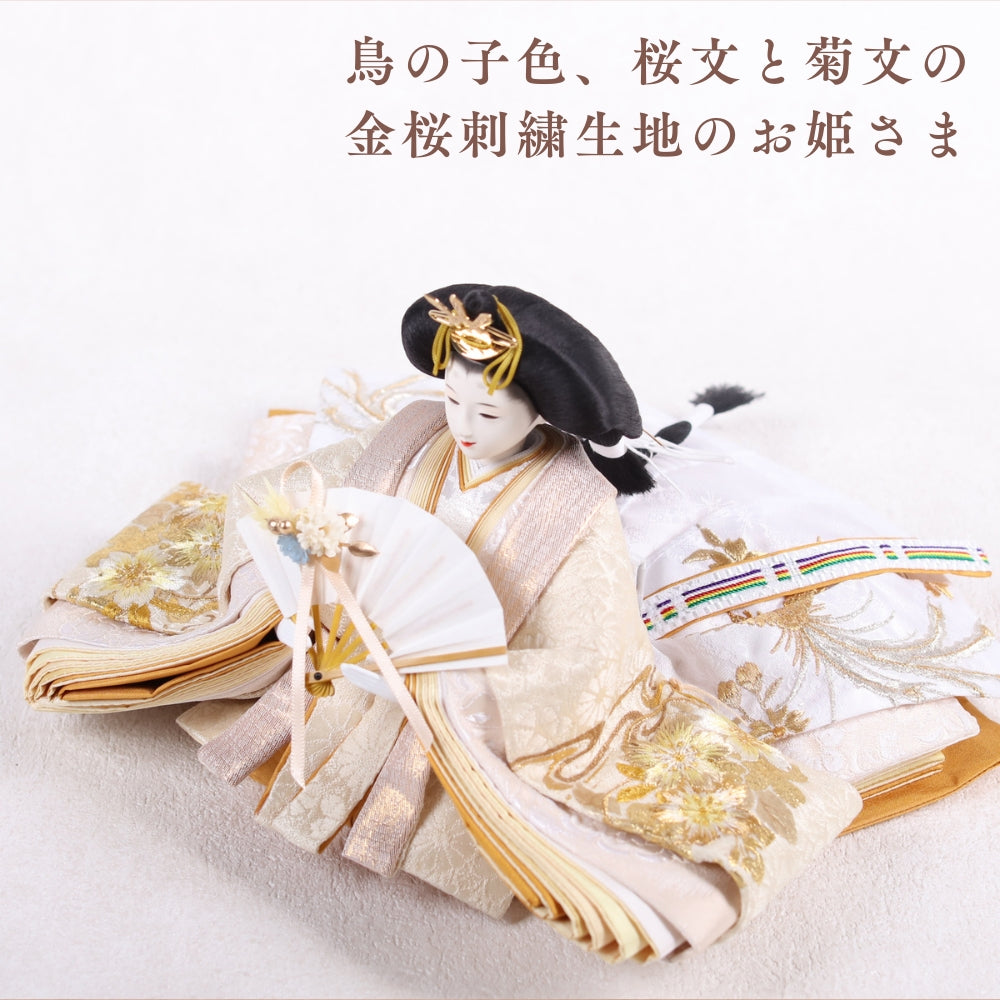 鳥の子色の金桜刺繍生地に桜と菊の模様が描かれたお姫さまです。清らかで優しい色合いが子どもたちの健康と幸せを祈ります