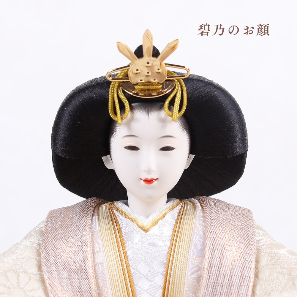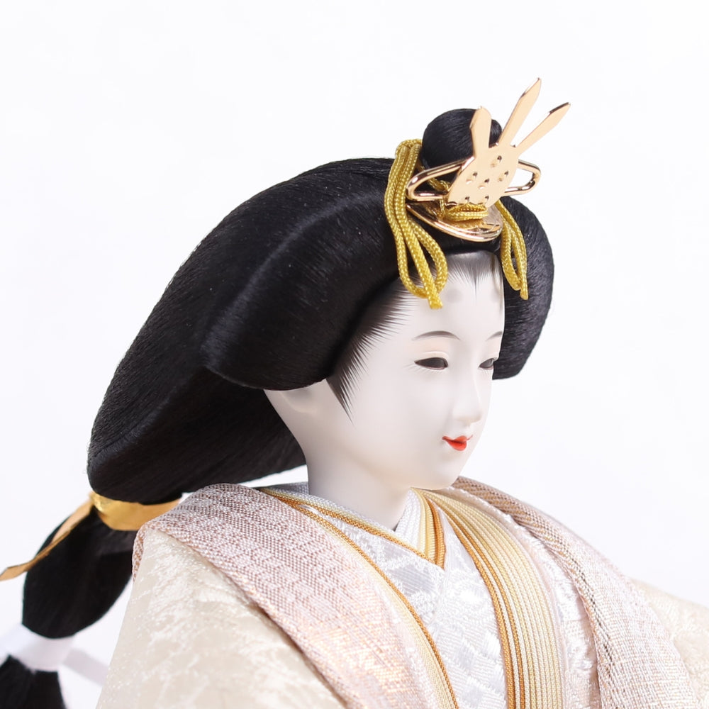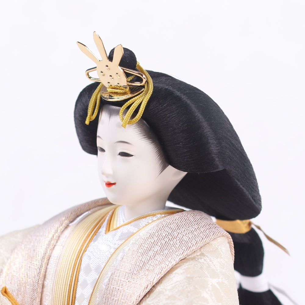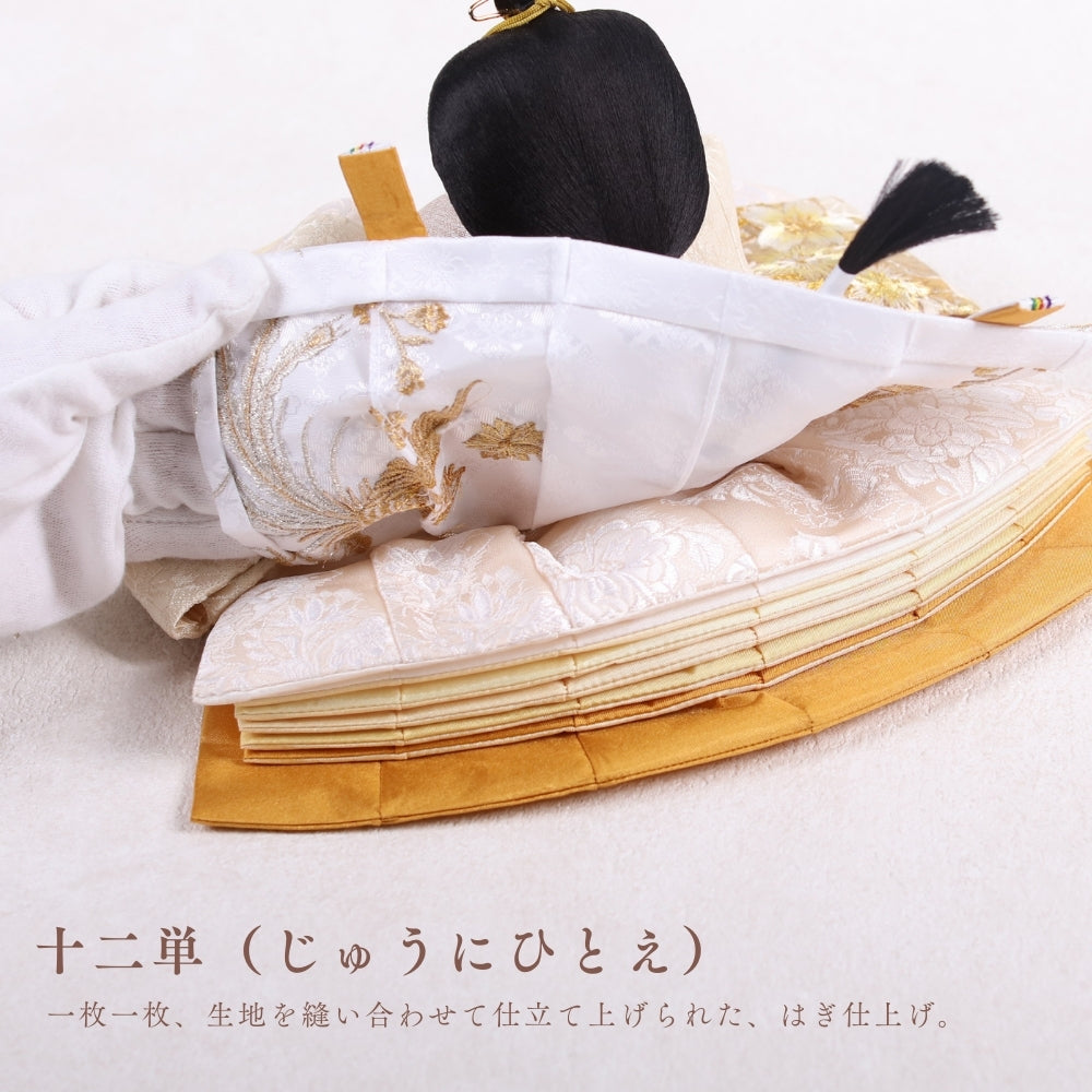 鳥の子色の金桜刺繍生地に桜と菊の模様が描かれたお姫さまです。清らかで優しい色合いが子どもたちの健康と幸せを祈ります