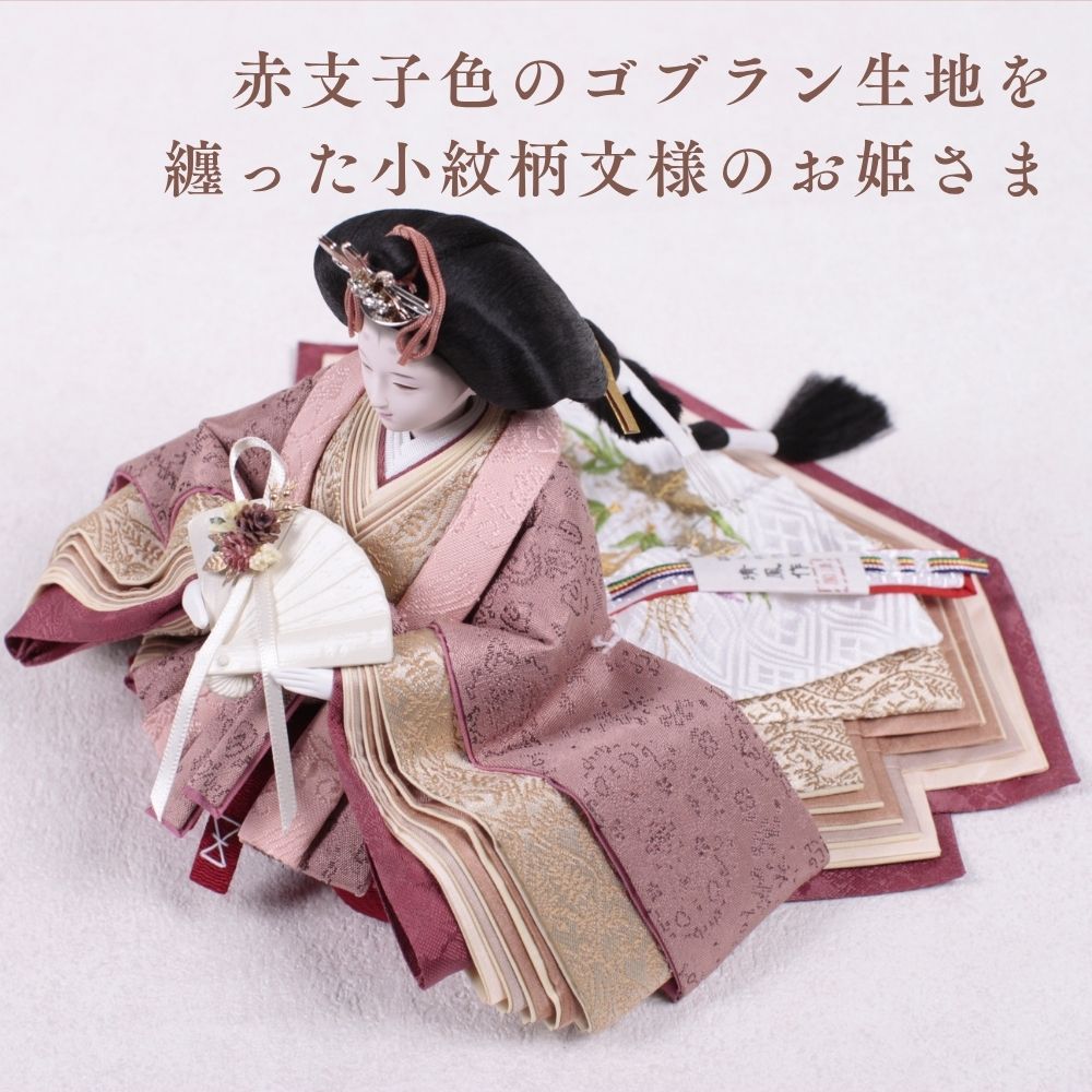 赤支子色のゴブラン生地を纏った小紋柄文様のお姫さま