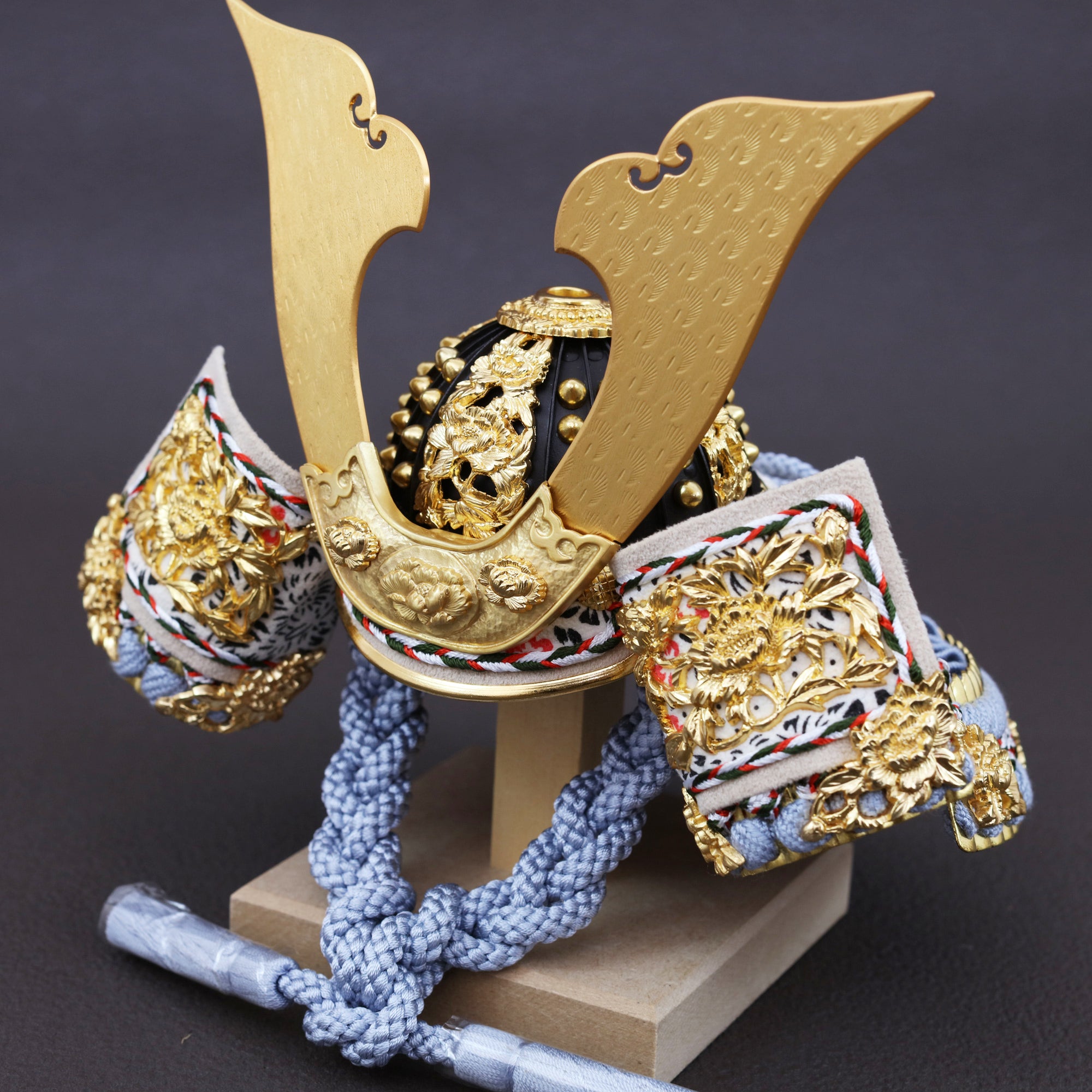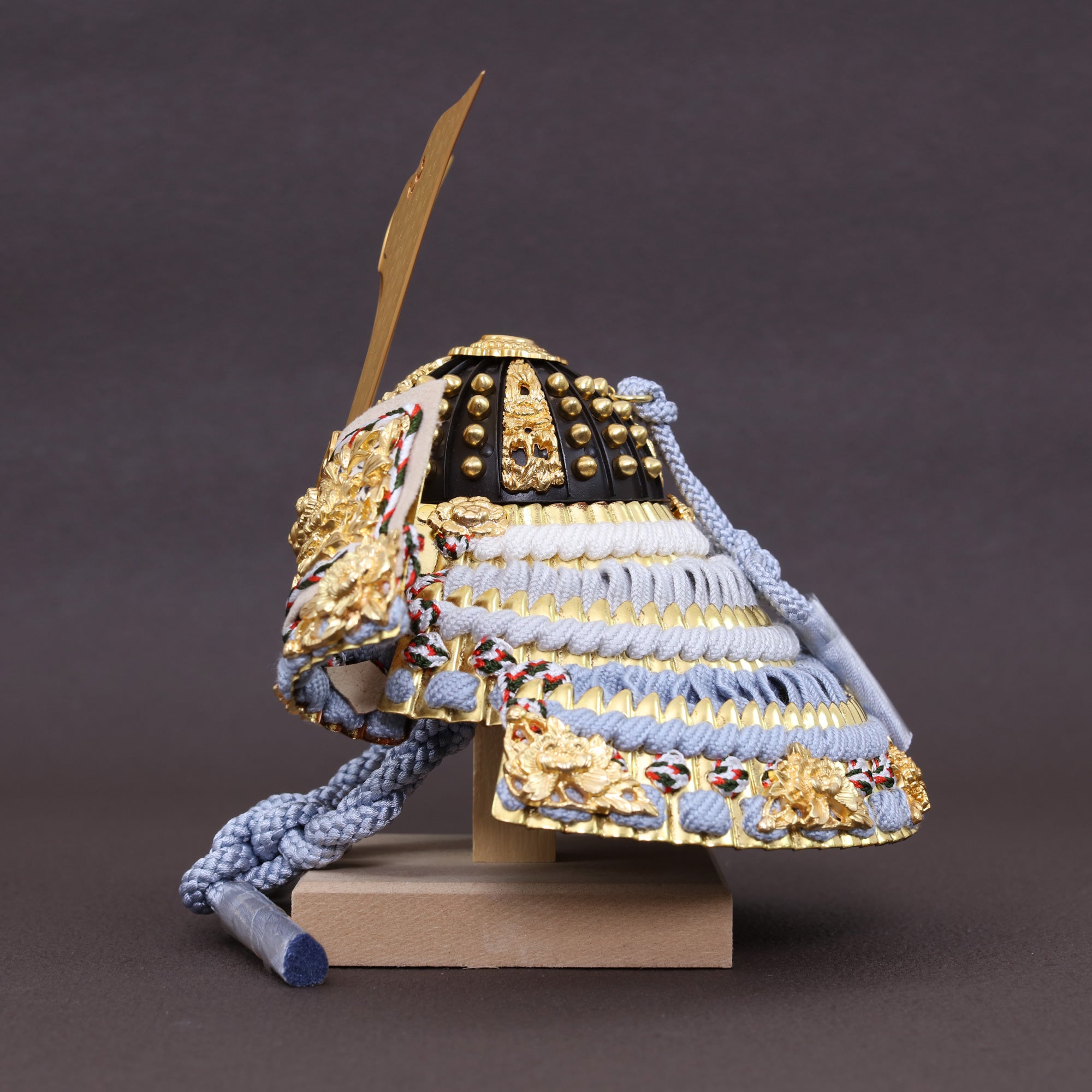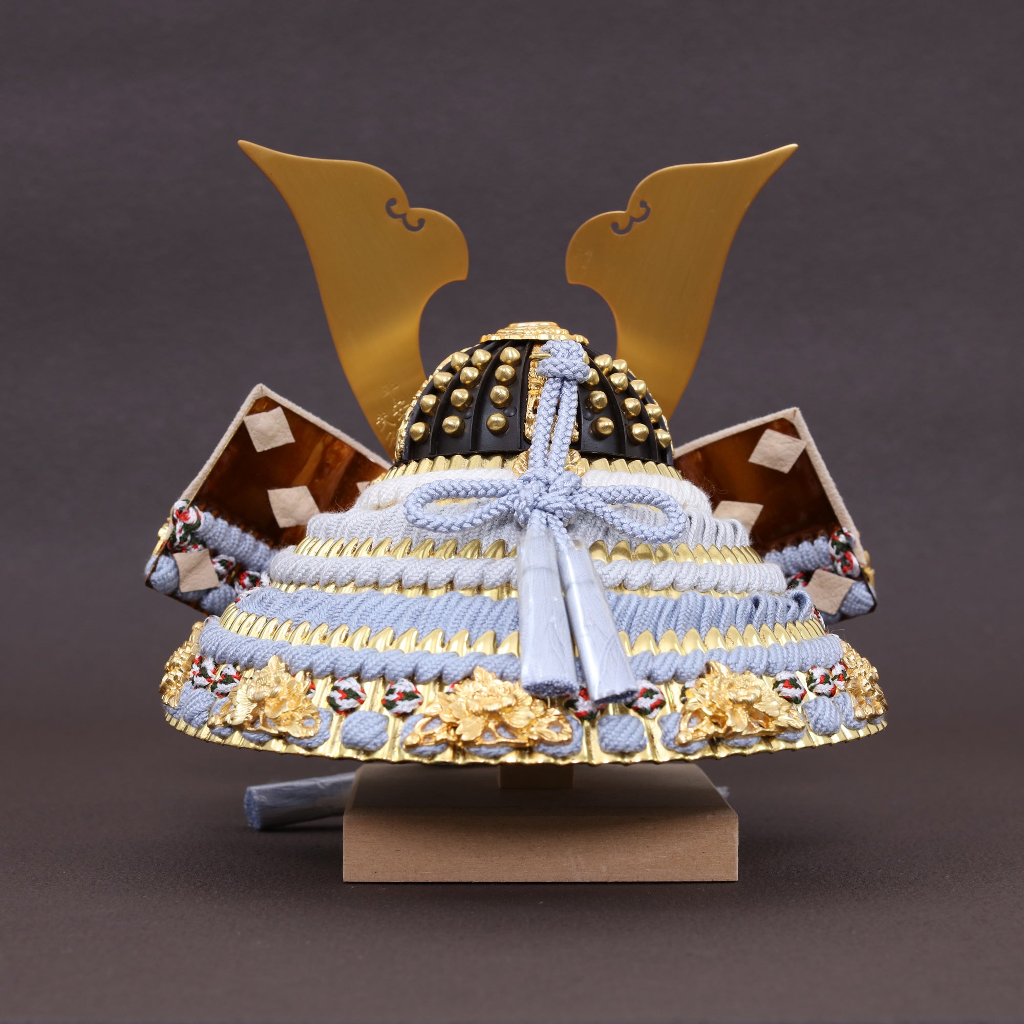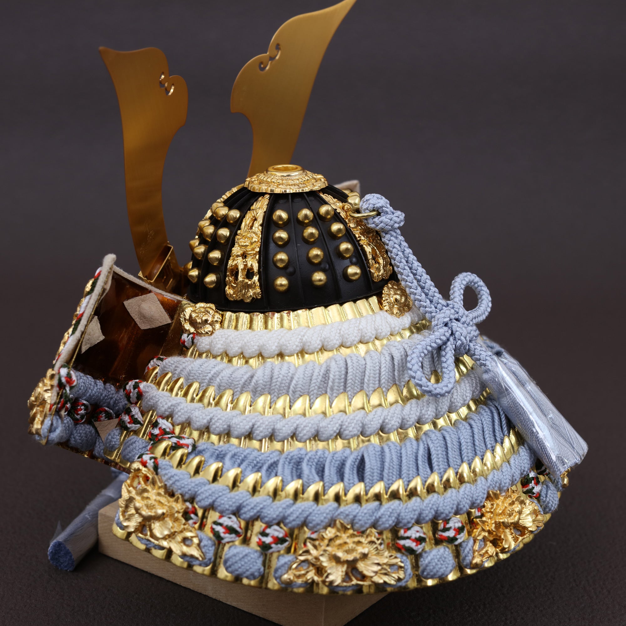 澄んだ青の組紐が、金鍬形の輝きをきりっと引き立てる兜飾り。