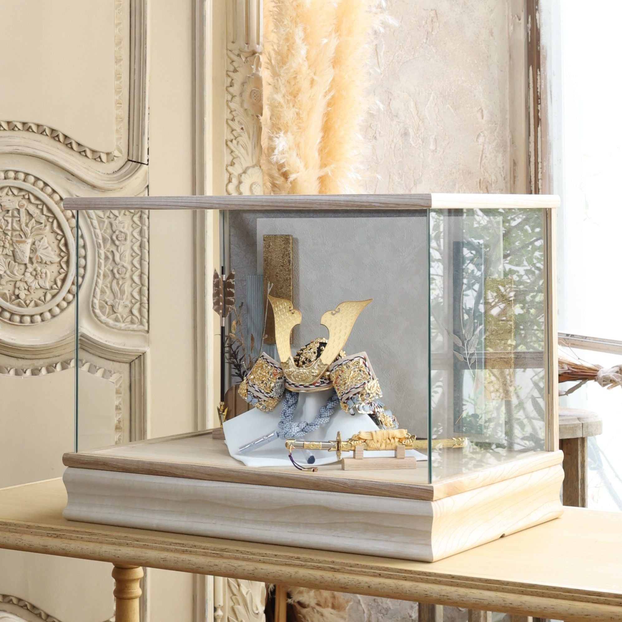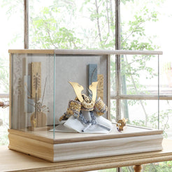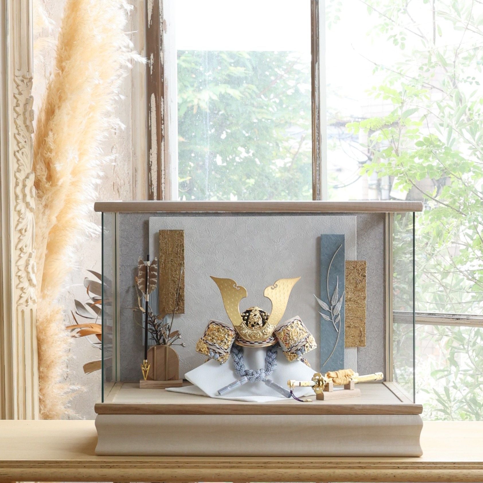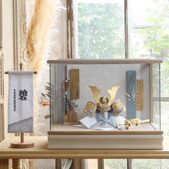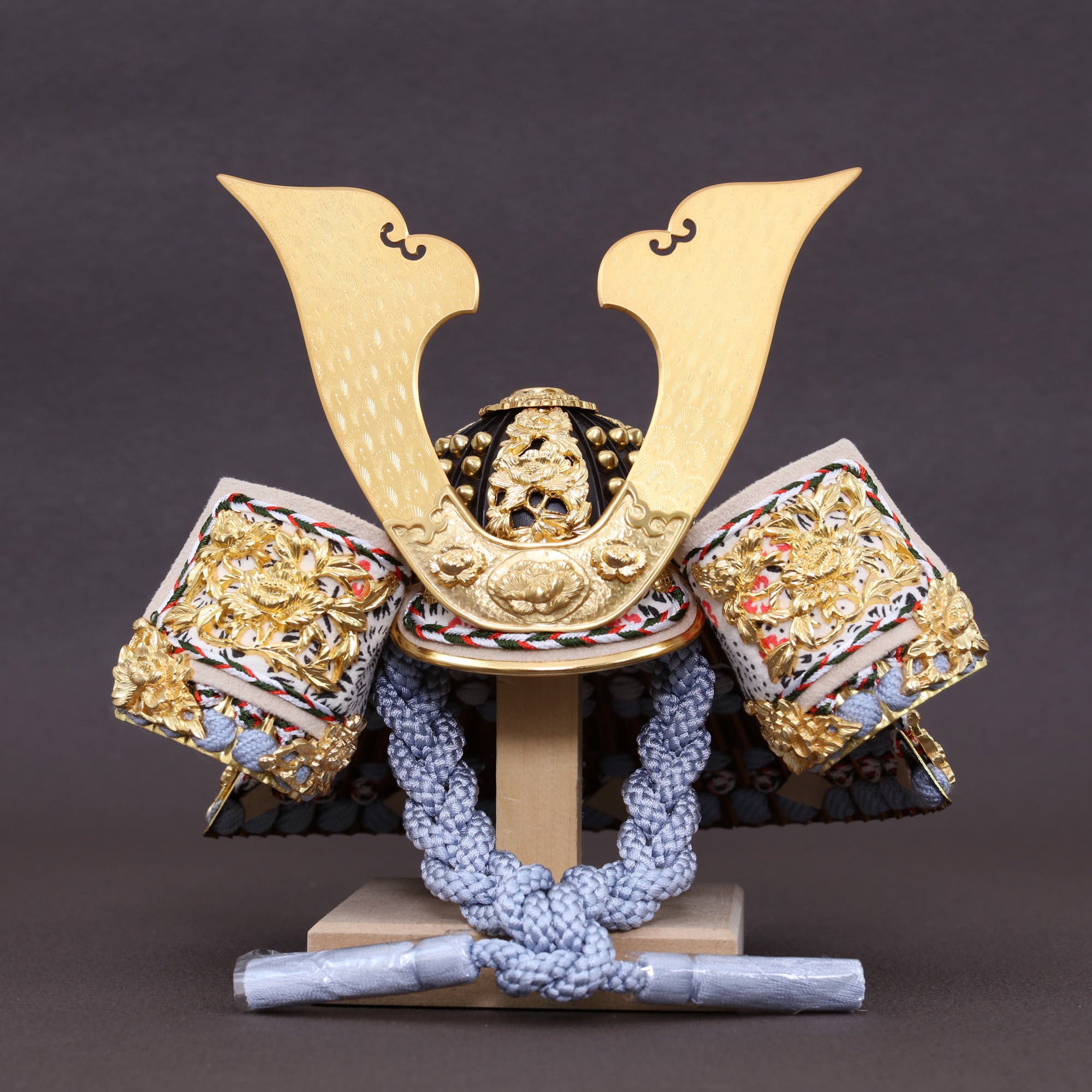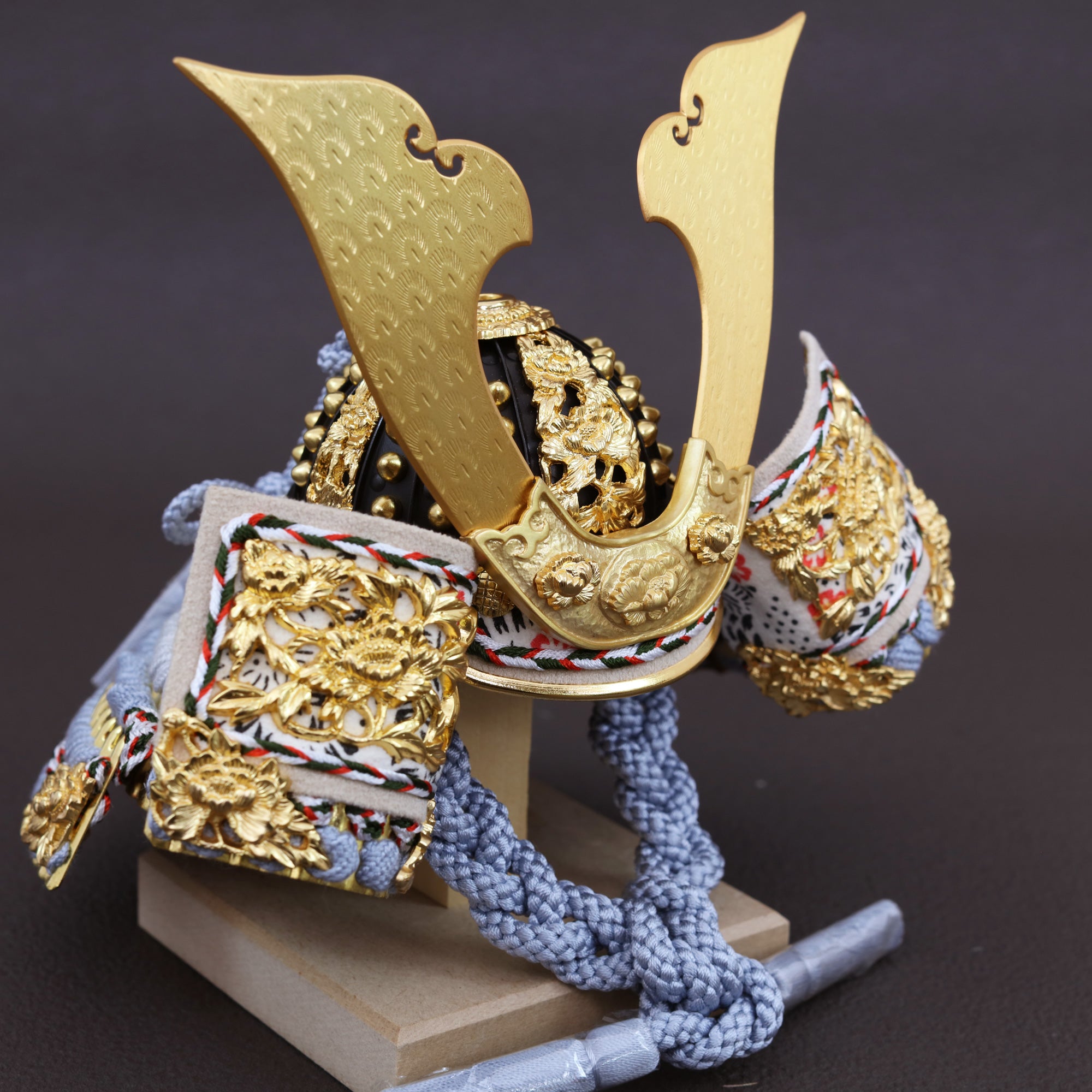 澄んだ青の組紐が、金鍬形の輝きをきりっと引き立てる兜飾り。