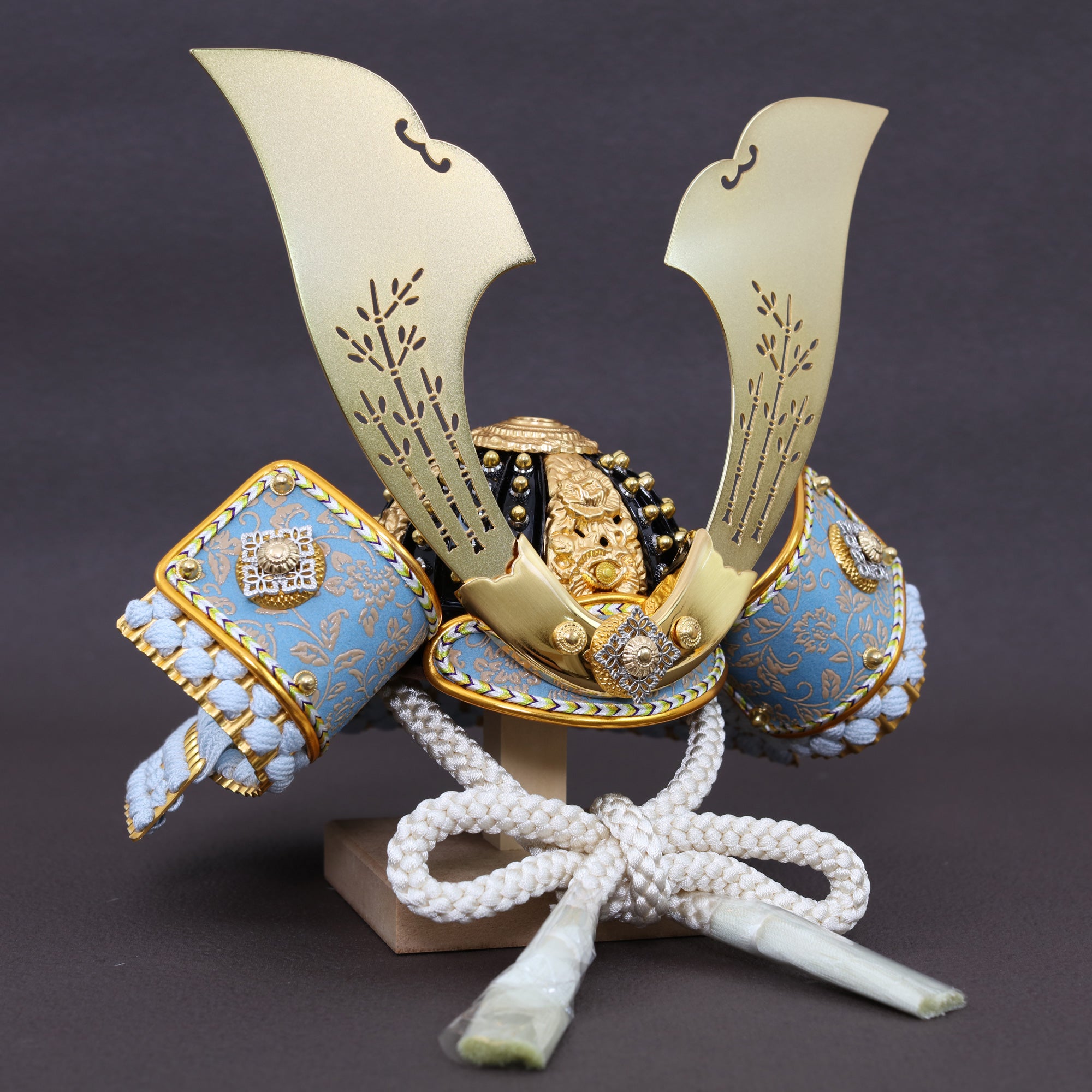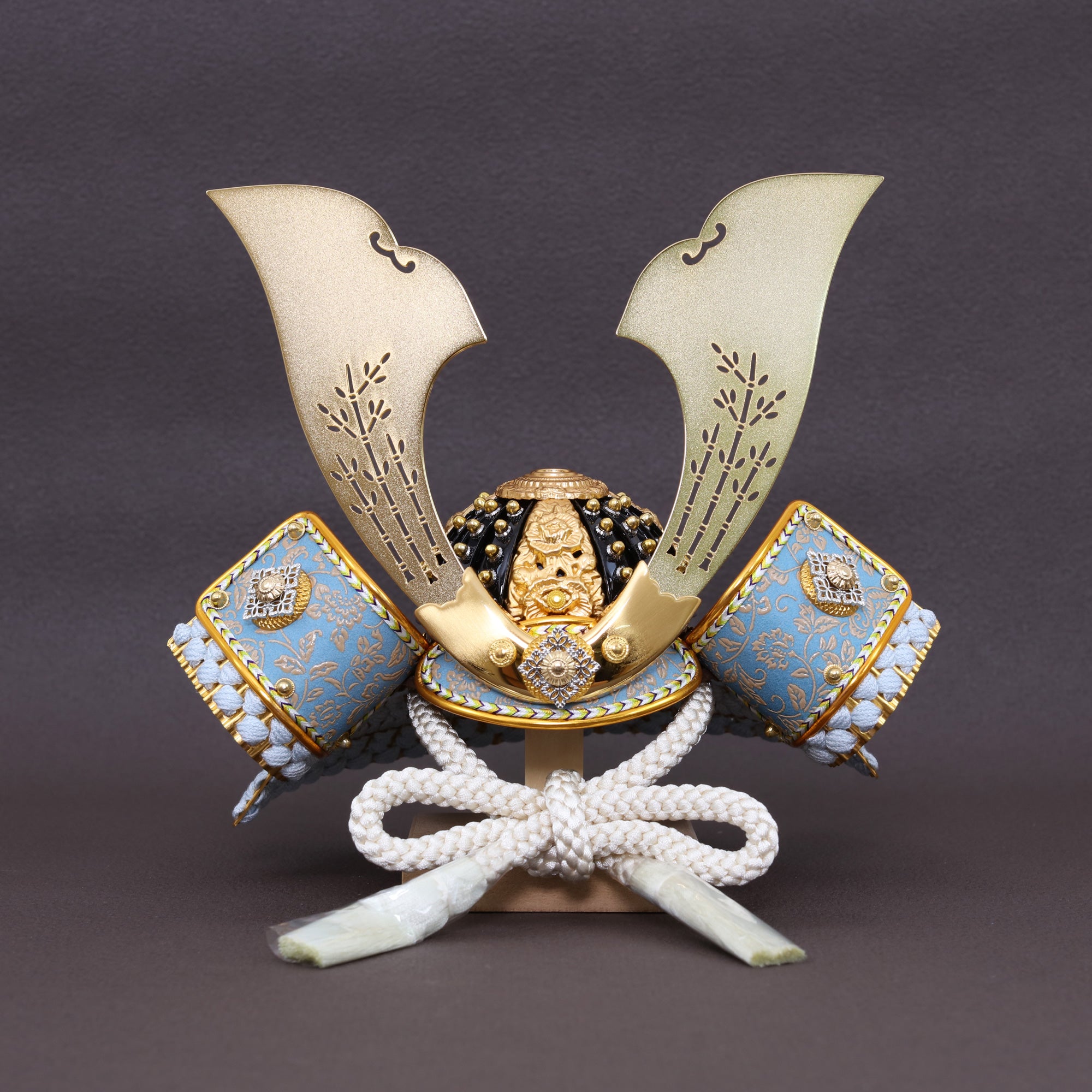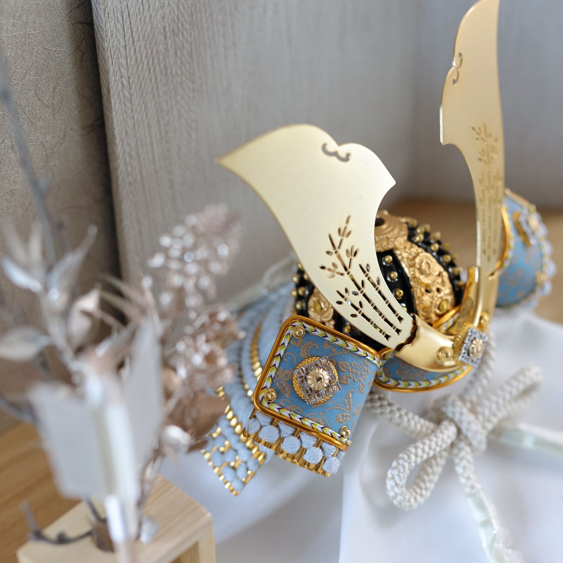 深い青緑の装いと金具の煌めきに寄り添い、上品で洗練された存在感を放つ鍬形です。