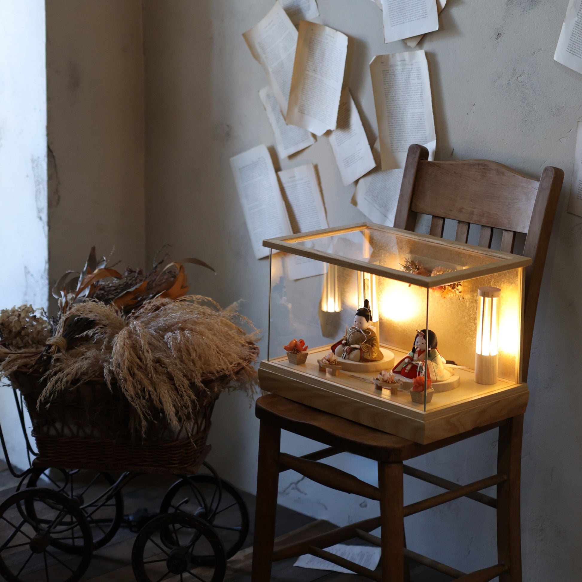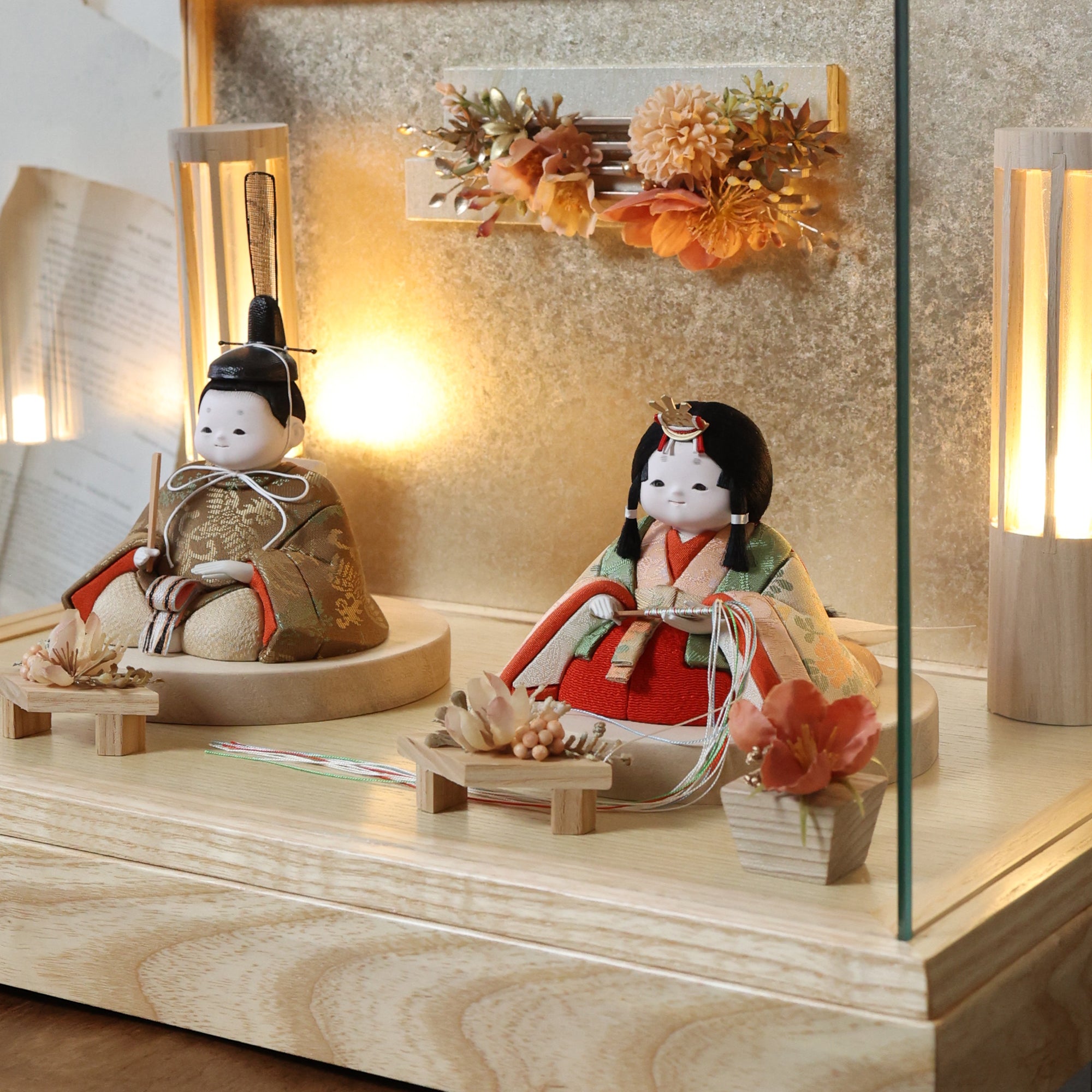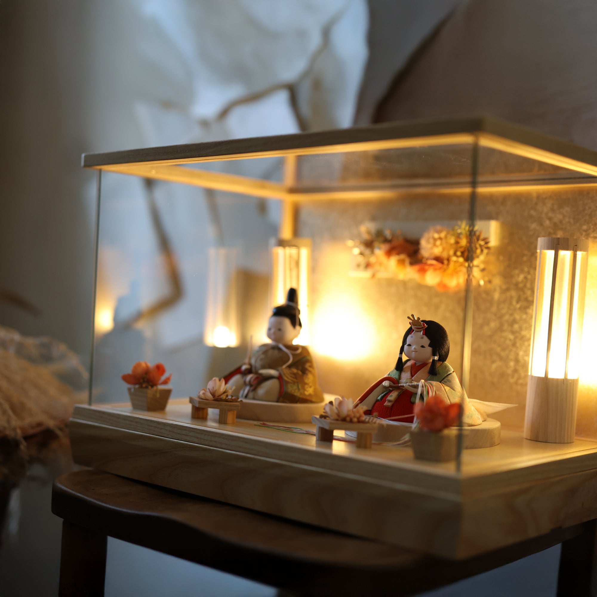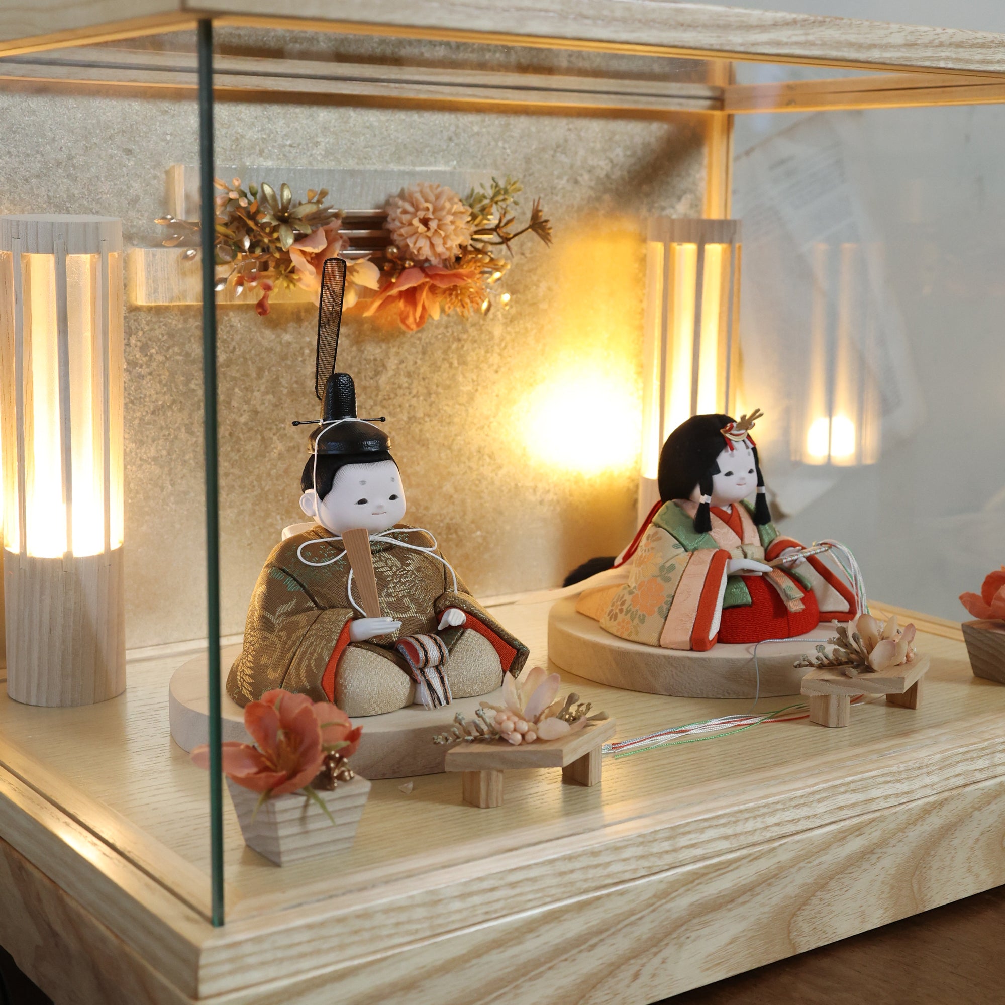 通常2mm厚が一般的な中、当店ではより高品質なAGC製3mmガラスを採用しています。厚みが増すことで強度と安全性が高まり、透明度の高いクリアな美しさを保ちます。大切な雛人形を守りながら、高級感のある見栄えを実現しています。