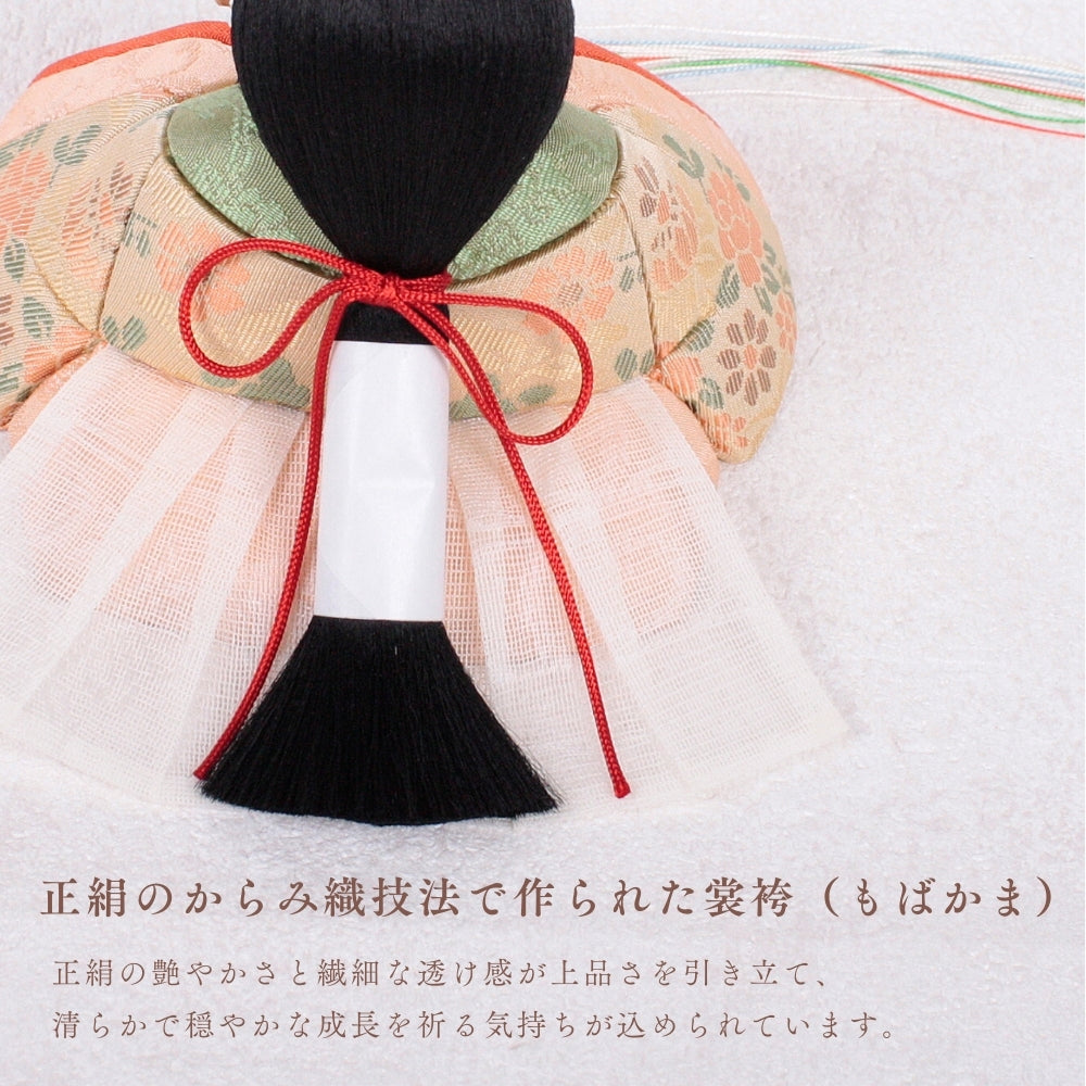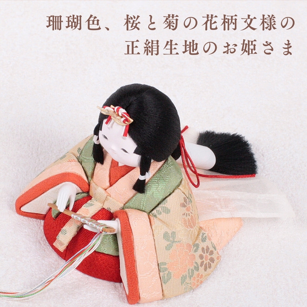 珊瑚色の正絹生地に桜と菊の花柄模様が描かれたお姫さまです。明るく華やかな色合いが子どもたちの健やかな成長を見守ります