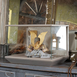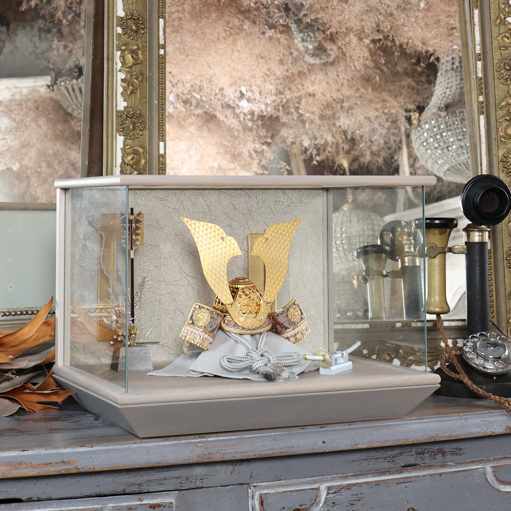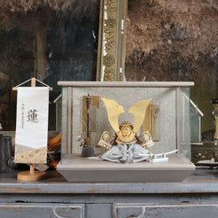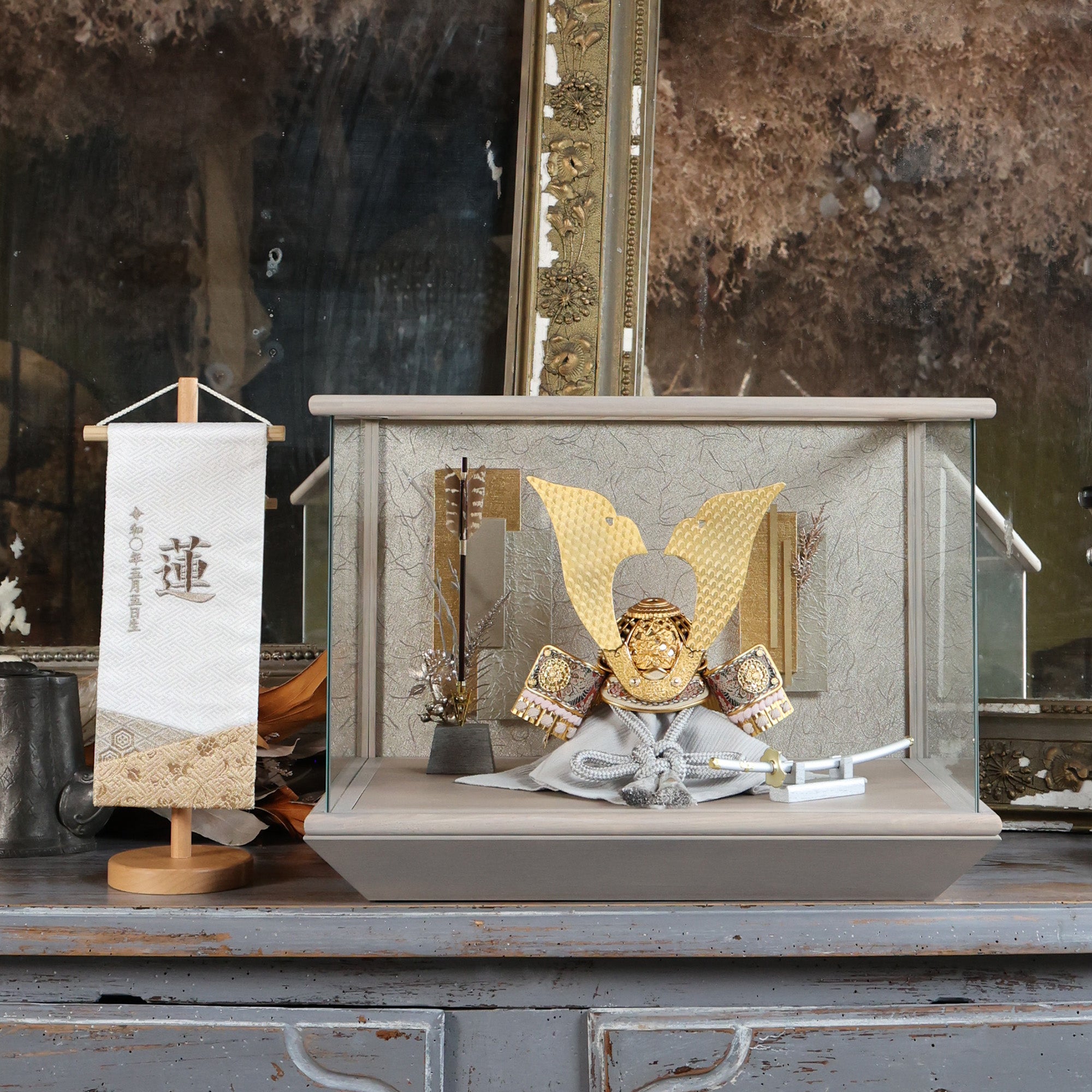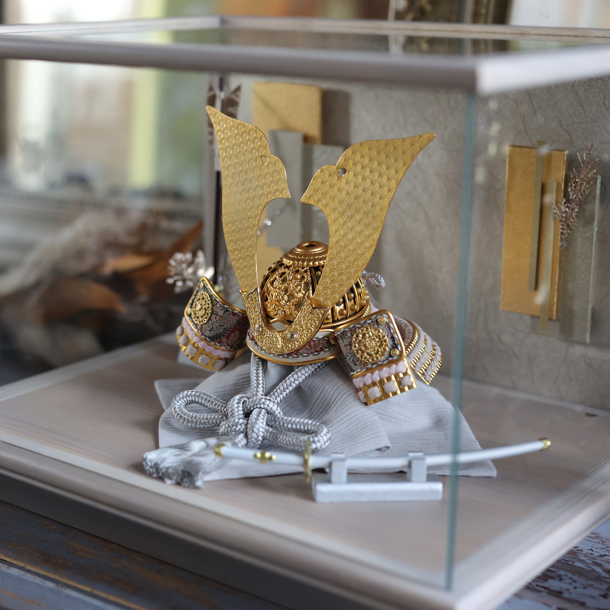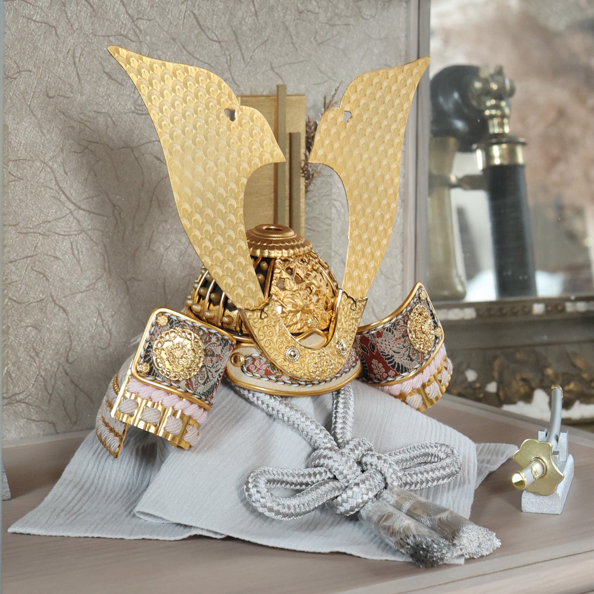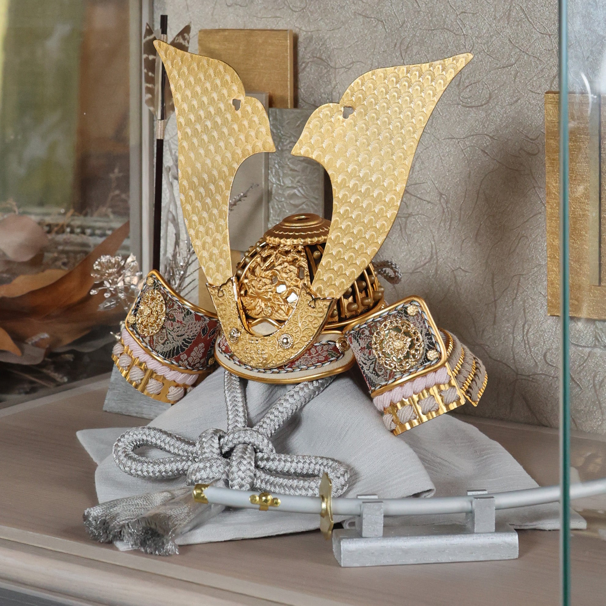 空間に溶け込みながら、確かな存在感を放つ兜飾りです。
