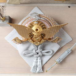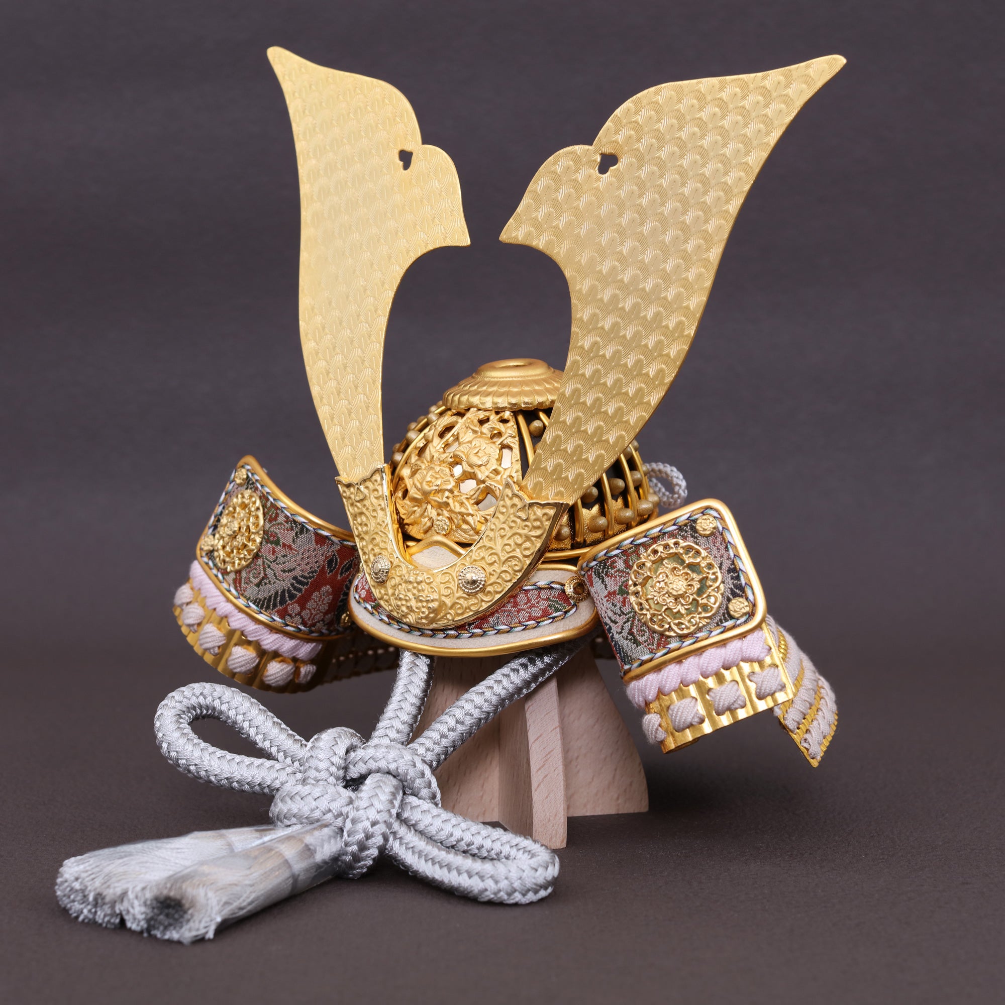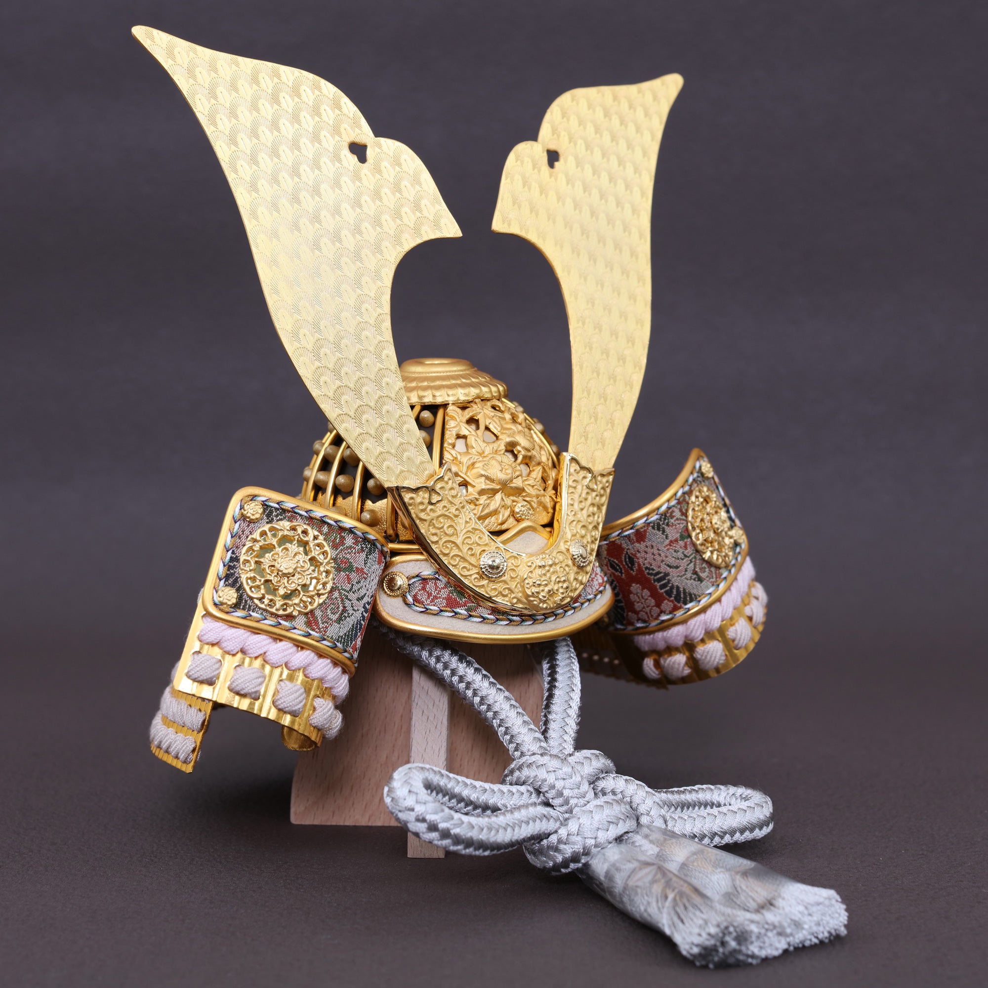 兜の金具は、光を集めて全体を引き締める“顔”の存在。画像の金具は、花弁が幾重にも重なる菊(きく)を思わせる意匠でまとめ、繊細な彫りと打ち出しで陰影を深く出しています。菊は古くから「長寿」「高貴」「邪気払い」の象徴。小さな兜に、凛とした気品とお祝いにふさわしい縁起を刻みました。