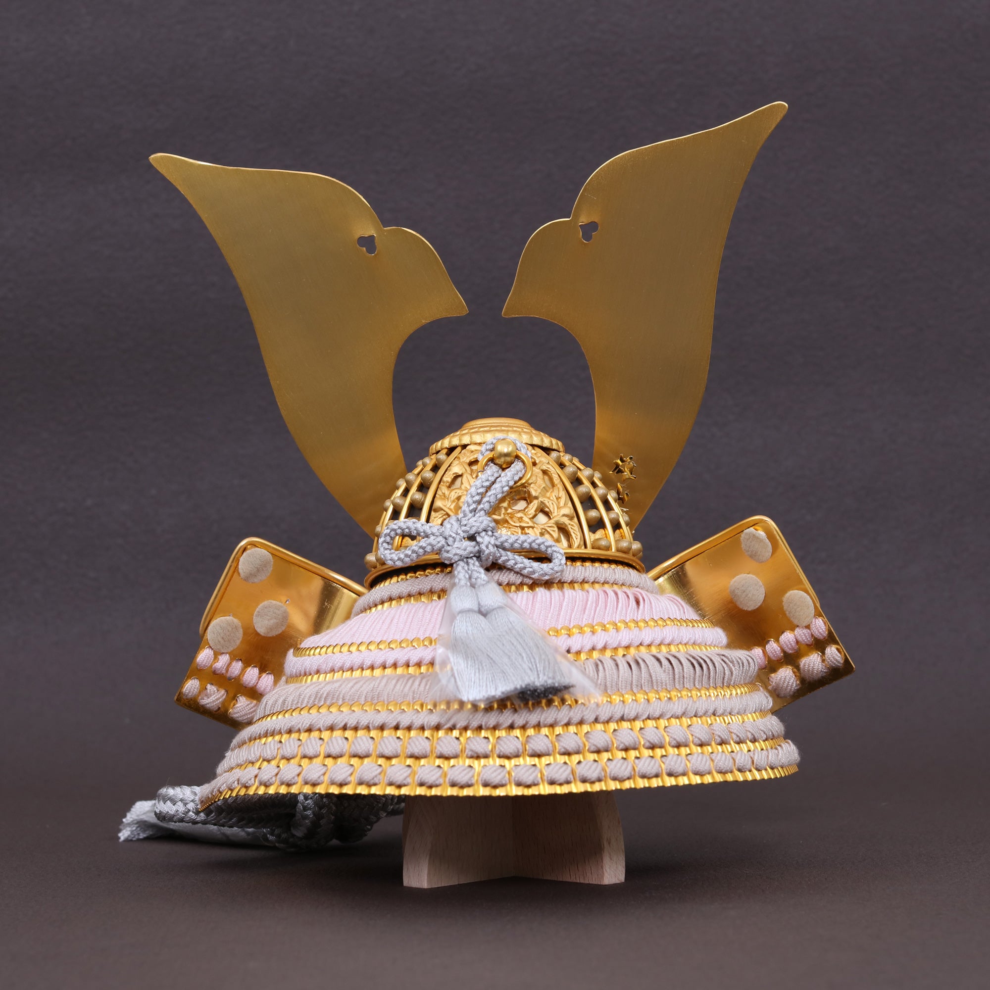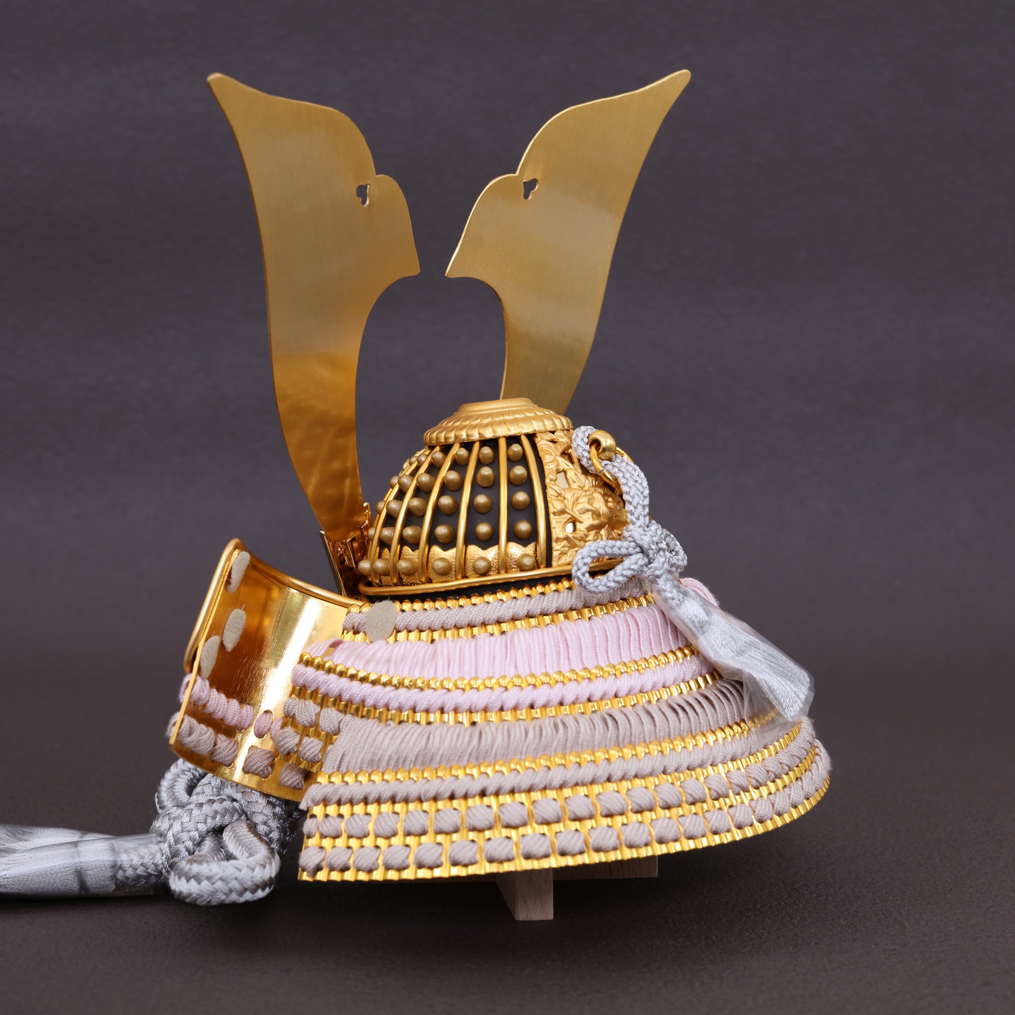 吹き返しは、兜の左右に張り出す“守り”の意匠。正面の迫力だけでなく、横から見たときの美しさを決める大切なパーツです。こちらは吹き返しに金襴生地を用い、光を受けて奥行きのある輝きを演出。織りの立体感と金のきらめきが、兜全体の格を静かに引き上げます。