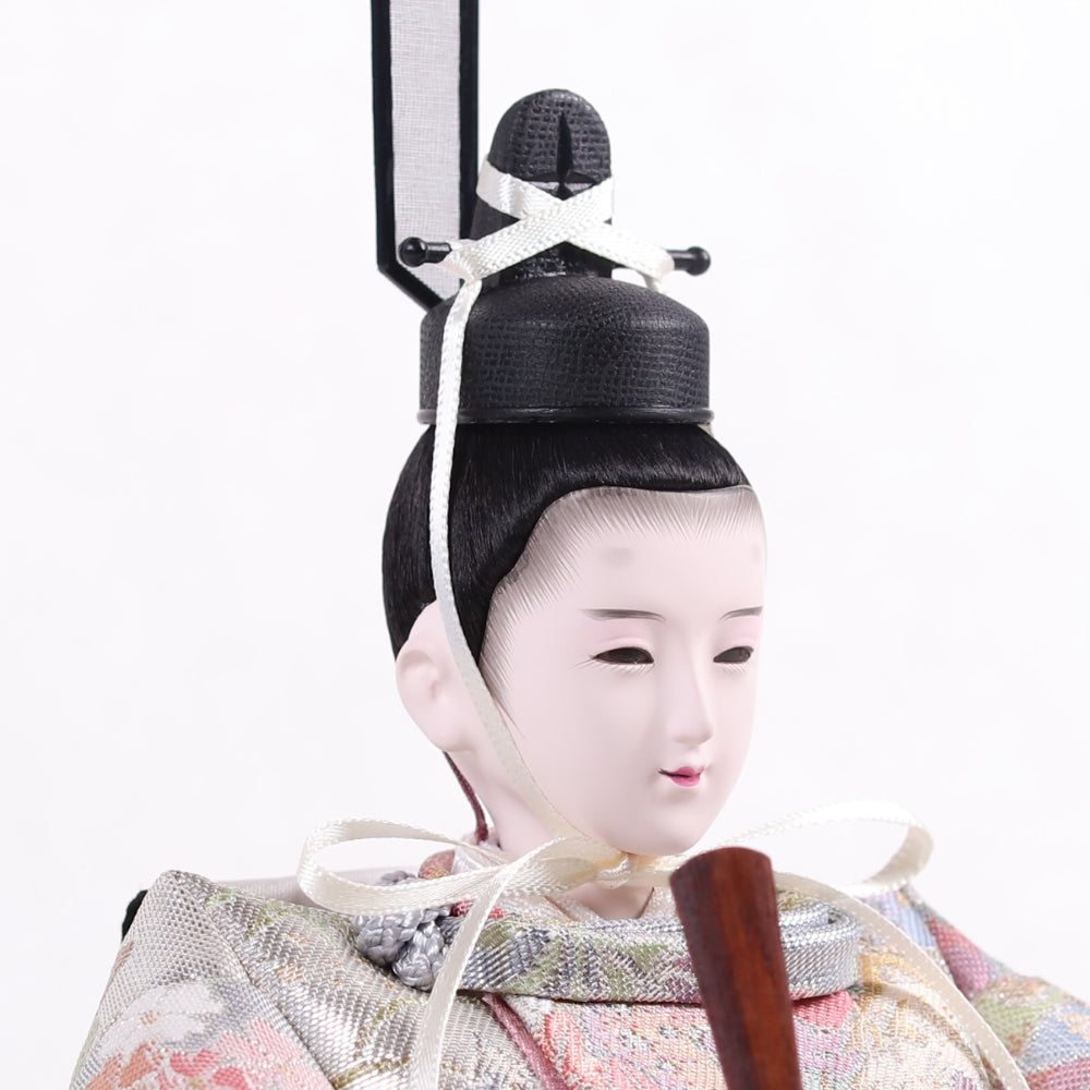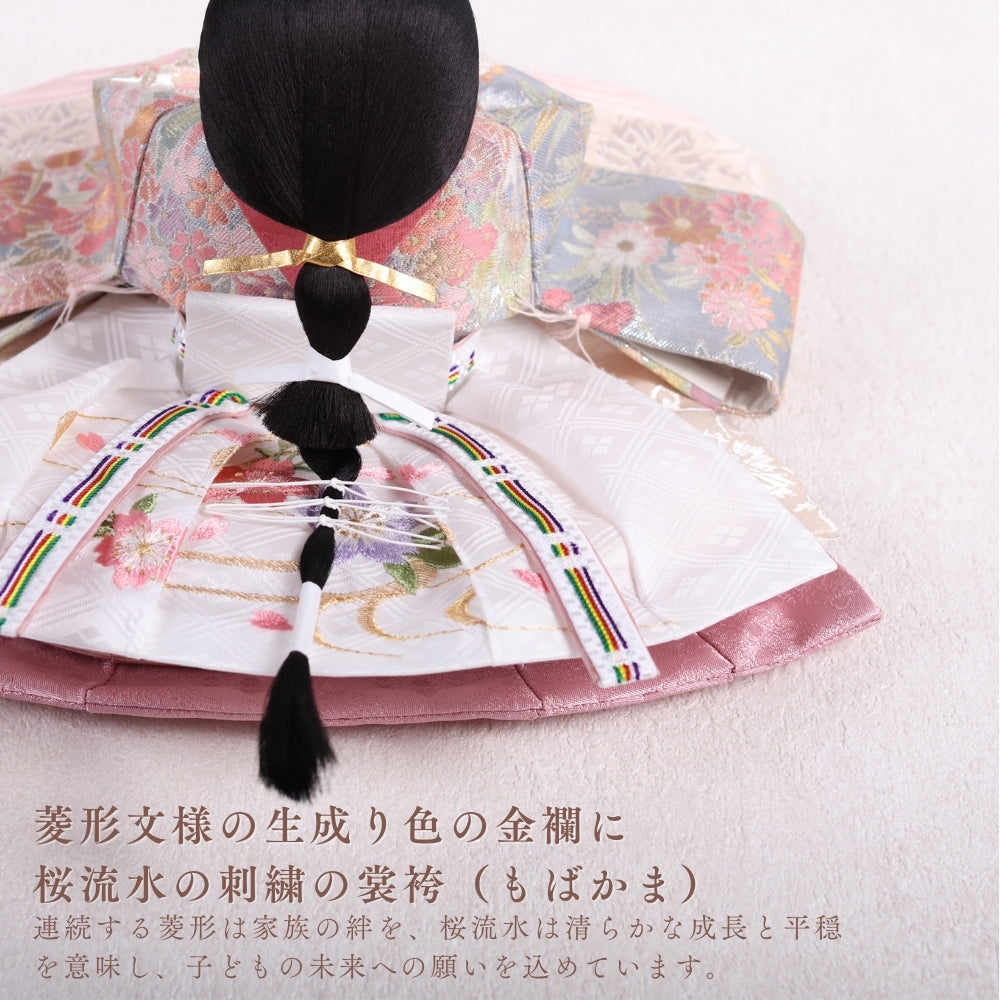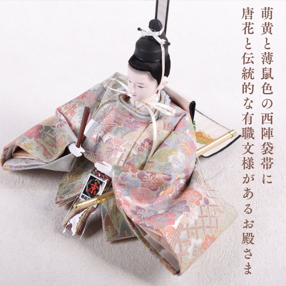 萌黄と薄鼠色の西陣袋帯に唐花と有職文様が施されたお姫さまです。優雅で穏やかな色合いが子どもたちの健康と幸せを祈ります