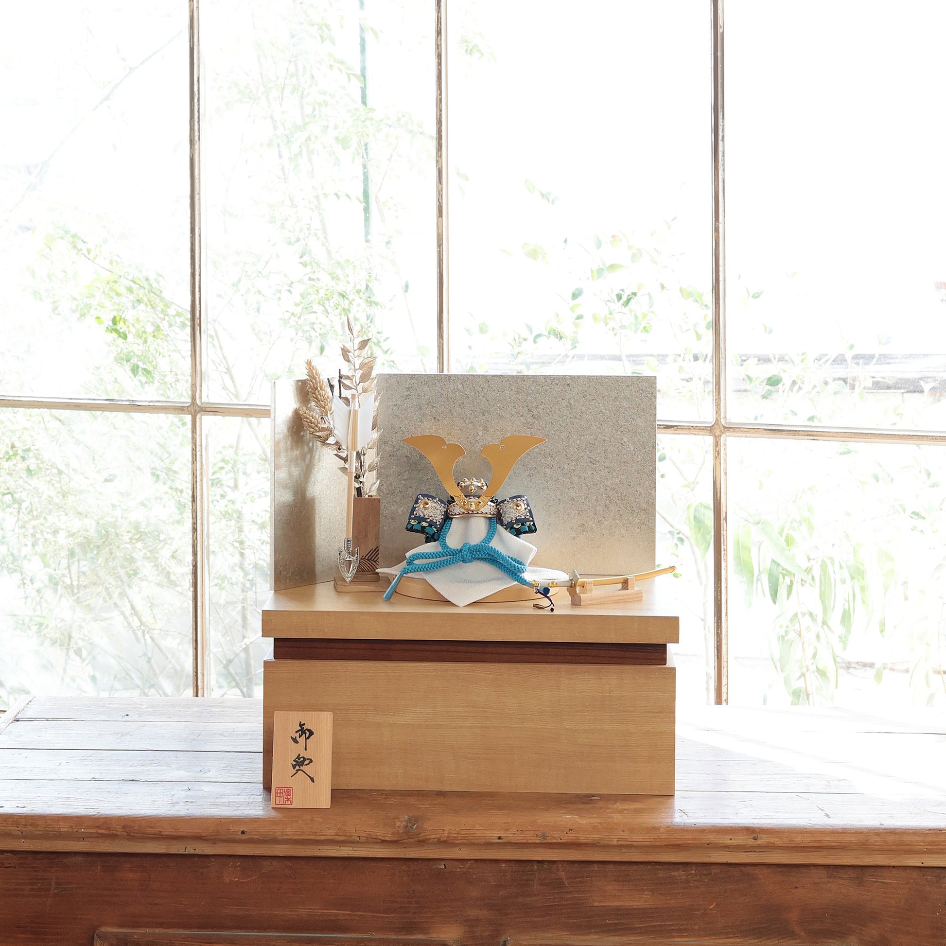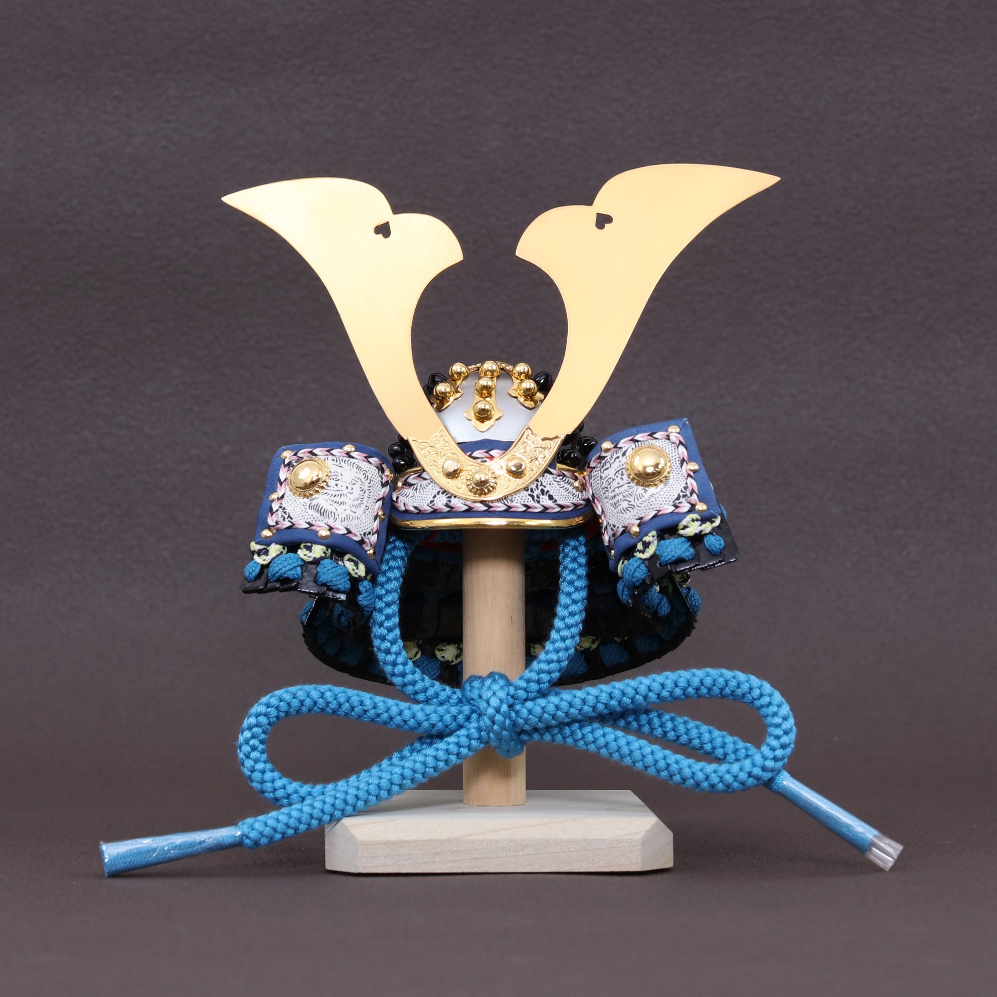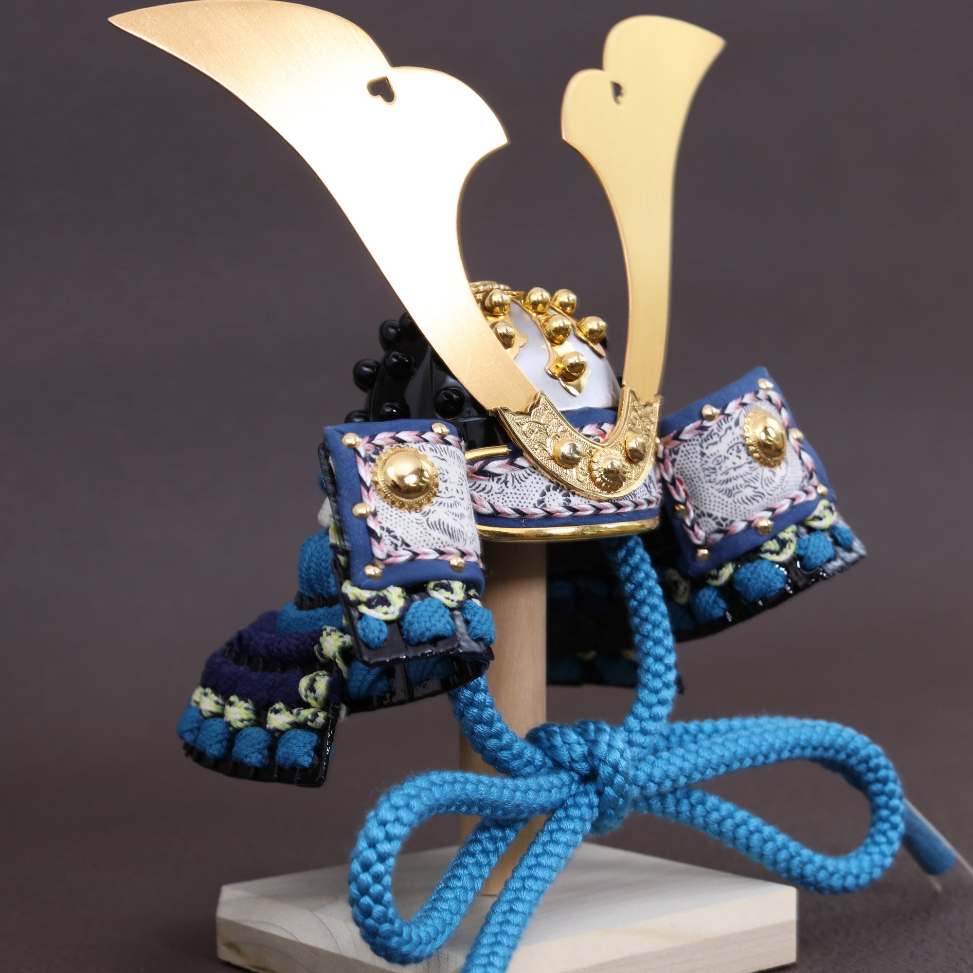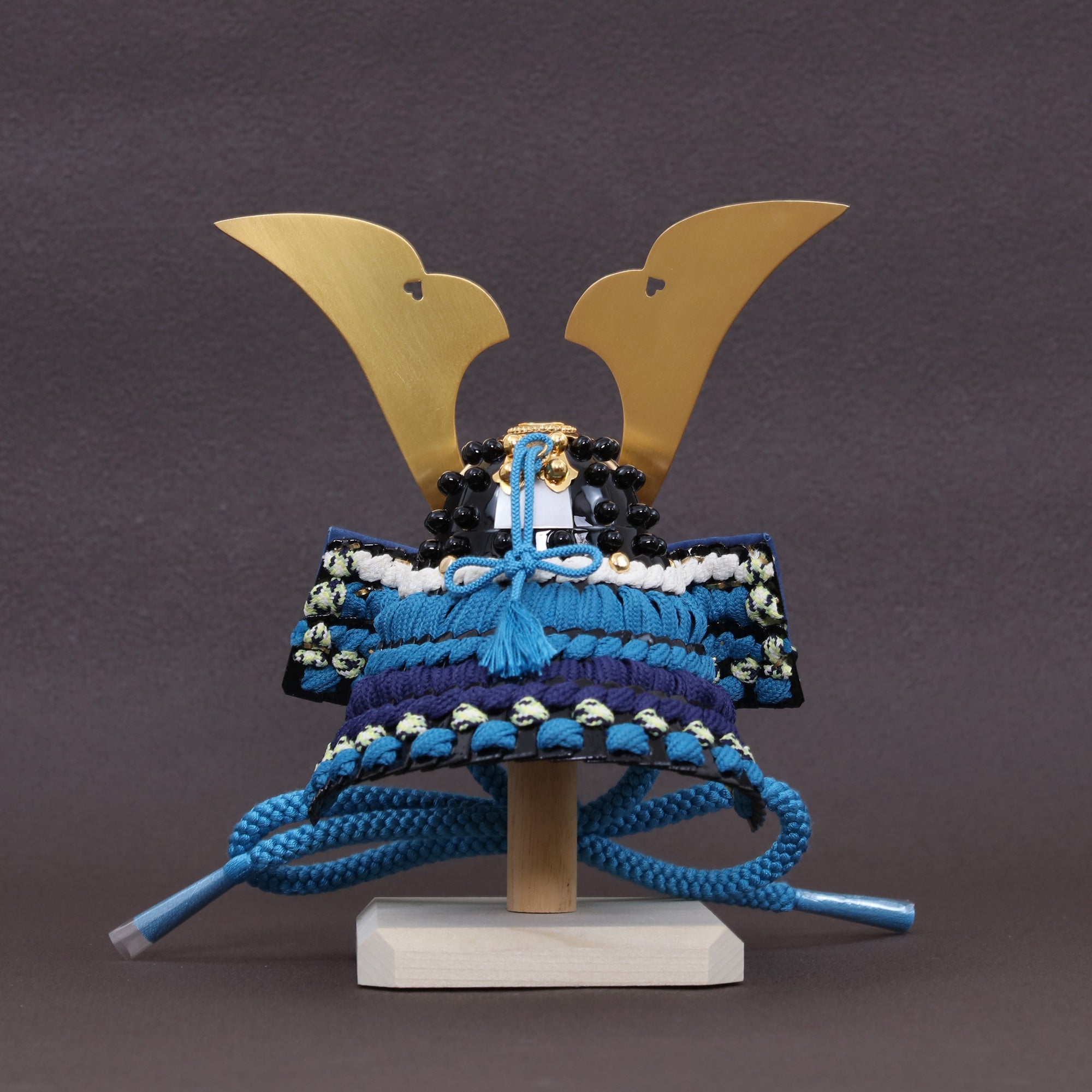 黒と青の引き締まった配色を格上げし、飾った瞬間に格式が伝わる鍬形です。