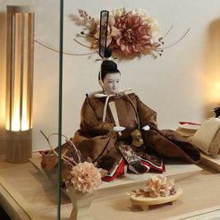 熊倉基安の作品「sakura」は、優しいピンクの化粧が愛らしさを引き立て、純粋な美しさで心を和ませてくれます。「お人形は顔がいのち」という言葉にふさわしく、匠の技術と感性が余すことなく注がれた一品です。伝統の尊さを大切にしつつも、新しい美の追求を怠らないその姿勢が、作品のさらなる魅力を引き立てています。