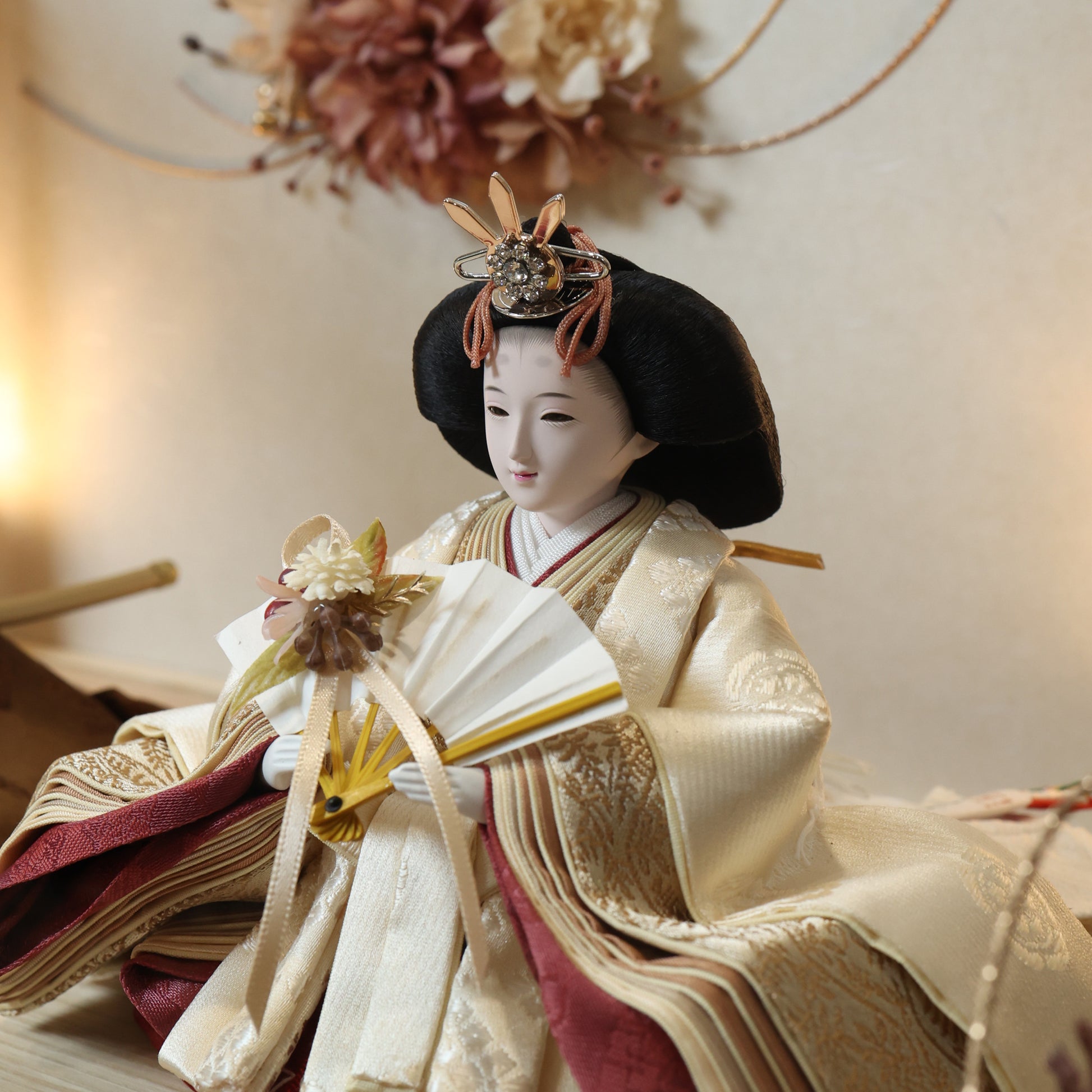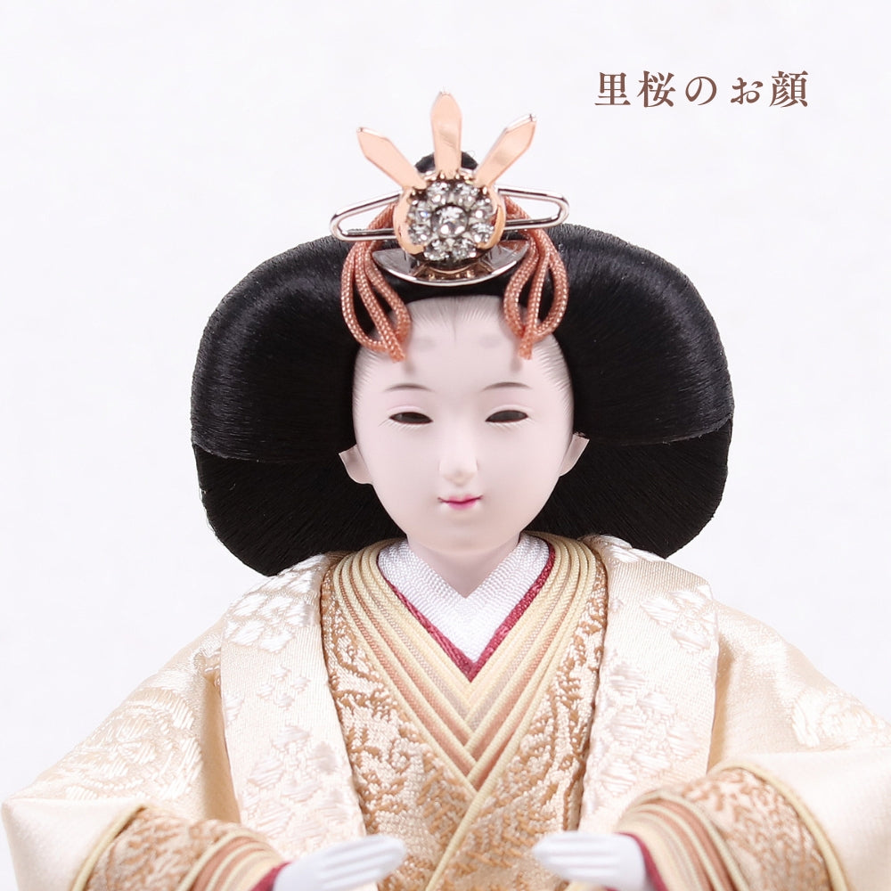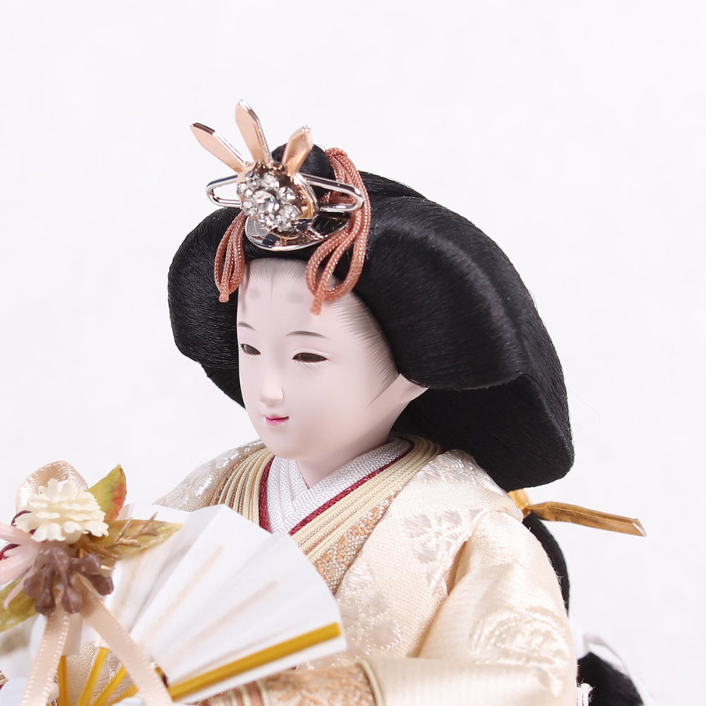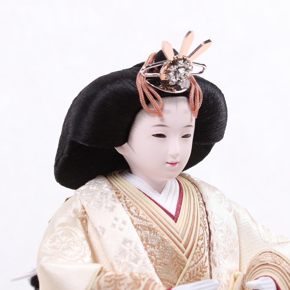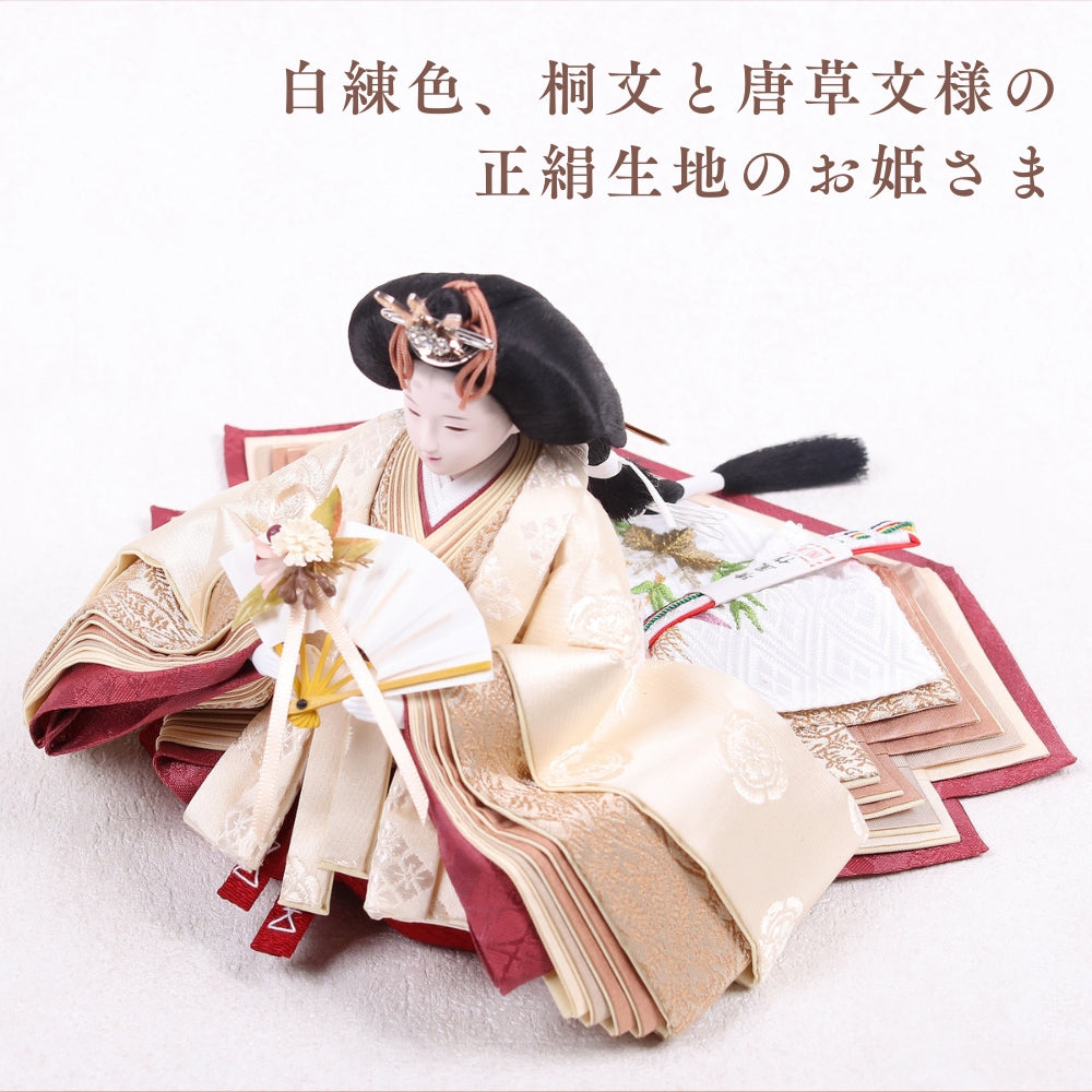 白練色の正絹に桐と唐草の模様が施されたお姫さまです。清らかな色合いが子どもたちの健やかな成長を見守ります