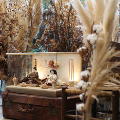 祈ドールお手入れセット。 大切なお人形を美しく保つための必需品です。柔らかな羽のはたきは繊細な表面のホコリをやさしく払いつつ、白手袋とクロスが丁寧な仕上げをサポート。大切なお人形の美しさを長くを保ちます。