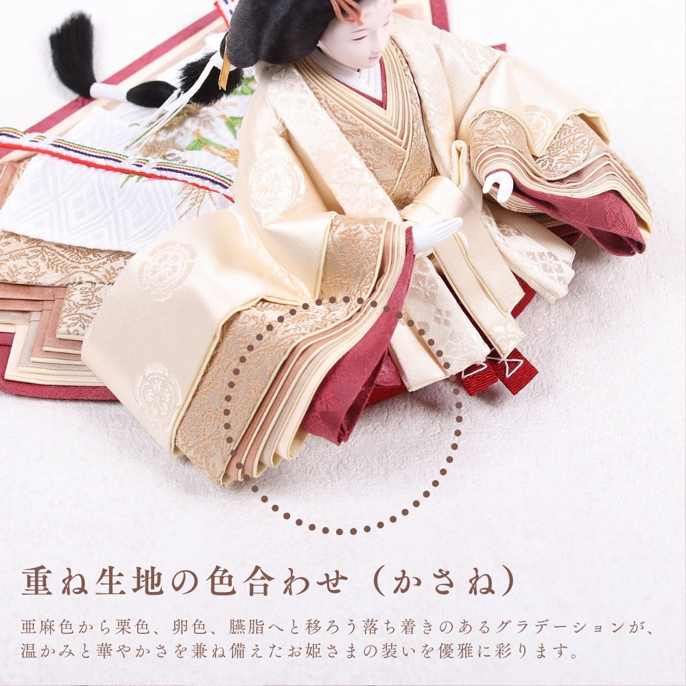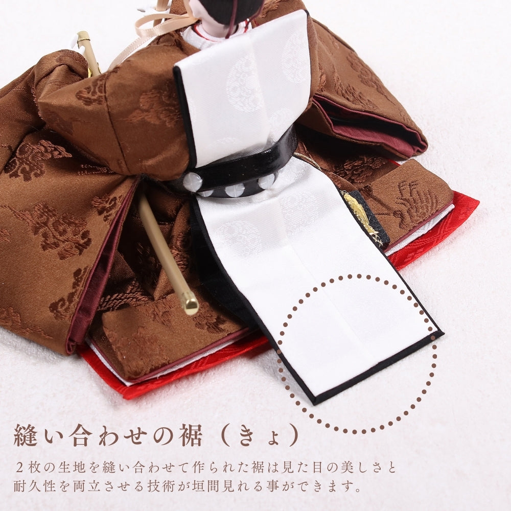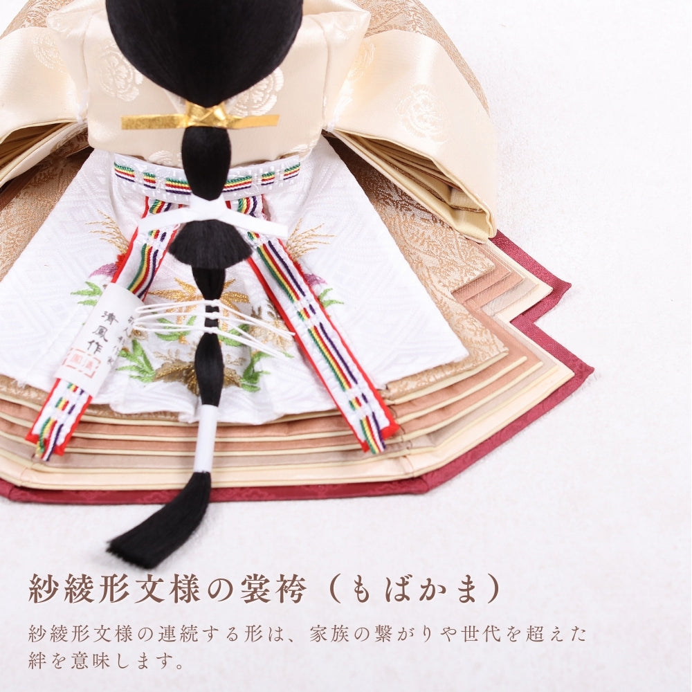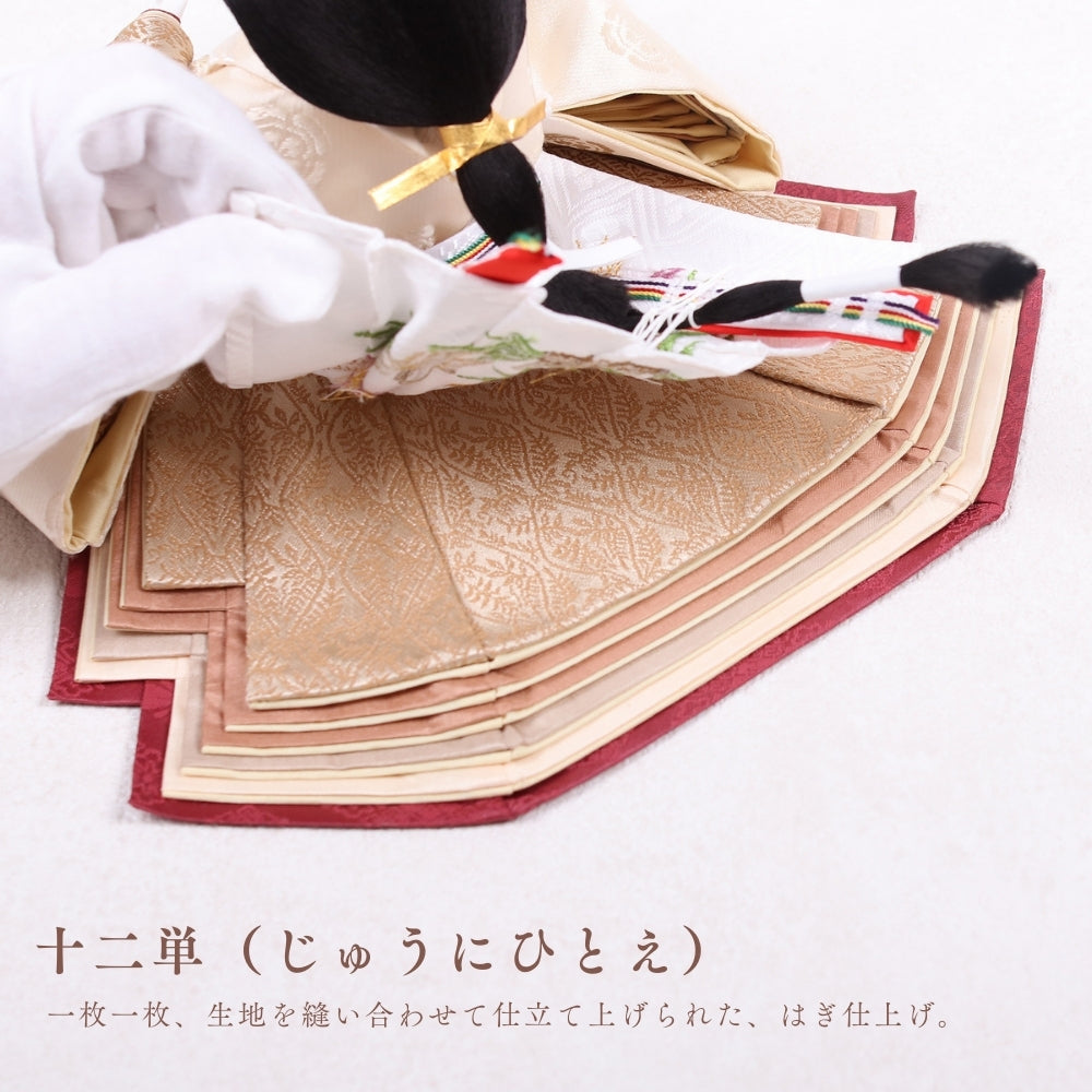 生地のこだわり 正絹(しょうけん) 正絹は、100%絹から作られた生地で、「本絹」とも呼ばれます。蚕の繭を原料にし、複雑な工程を経て製造されます。絹糸を織って生地に仕上げることで、独特の光沢と滑らかな質感が生まれ、高級感のあるお人形...