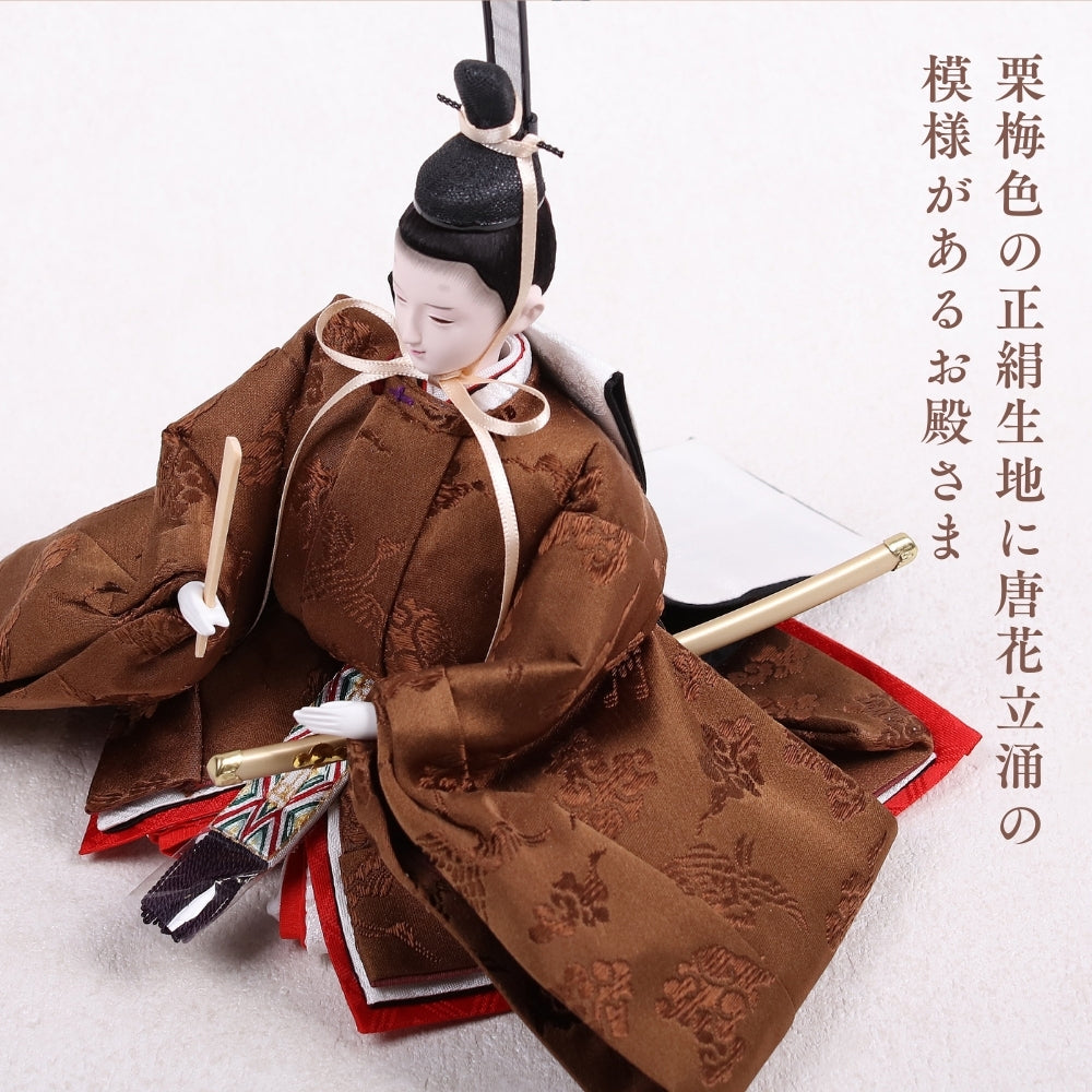 栗梅色の正絹生地に唐花立涌が描かれたお殿さまです。温かみのある色合いが安心感を与え、子どもたちの健康を見守ります