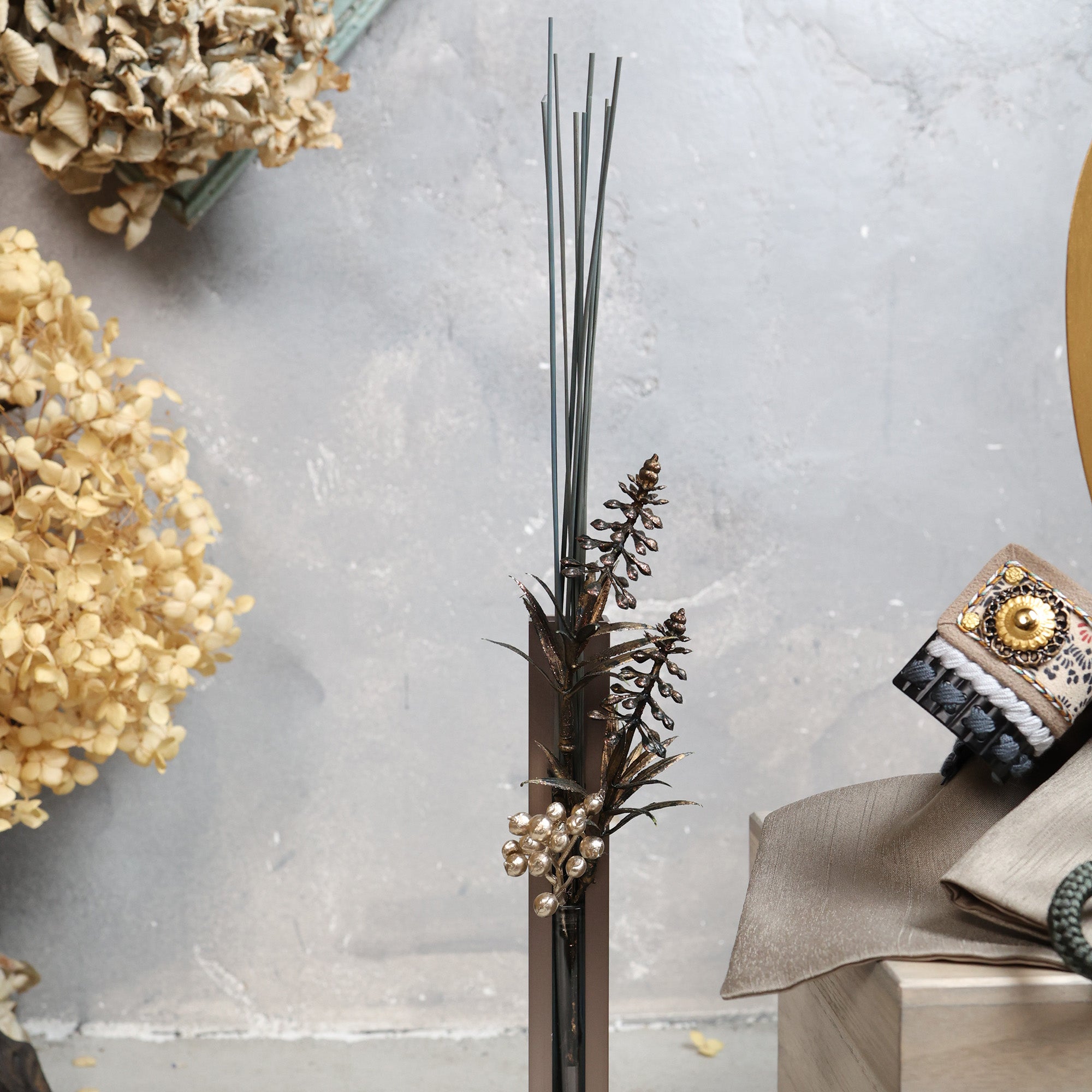金具の重厚感と深い緑の組紐が引き立つよう、華やぎは控えめに、品格を丁寧に整えています。