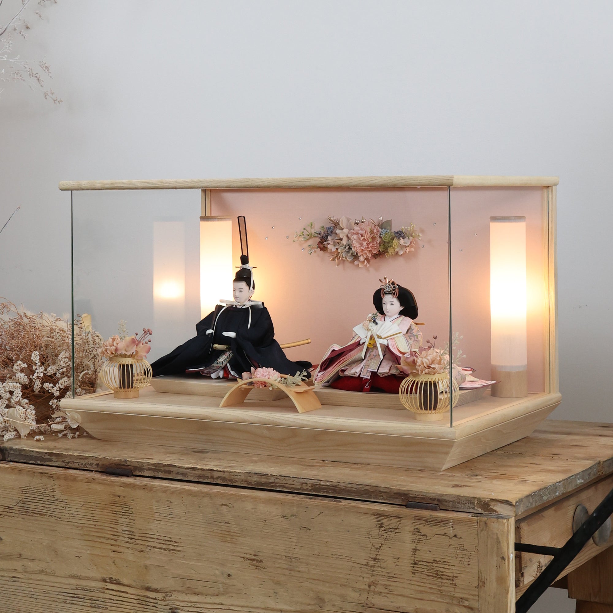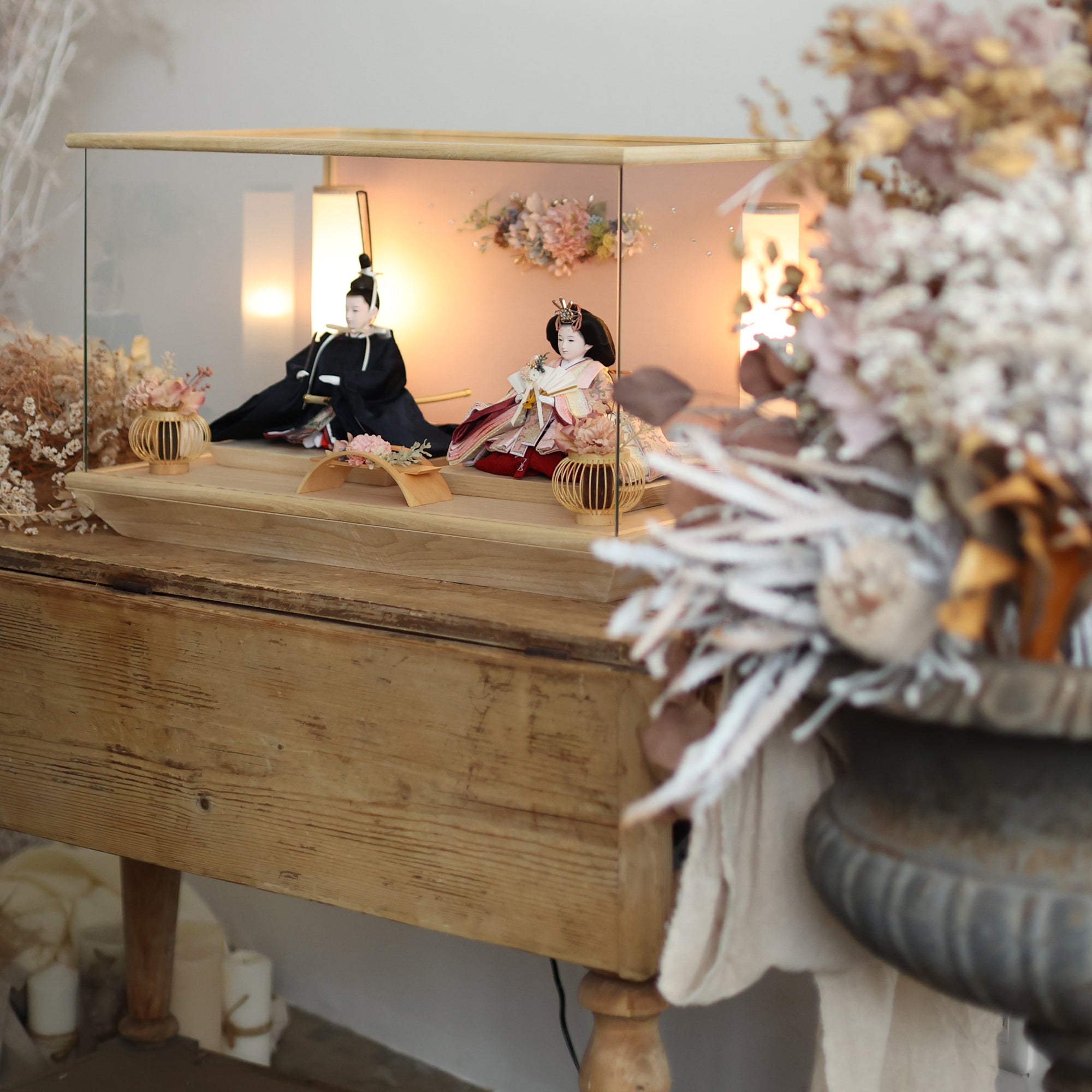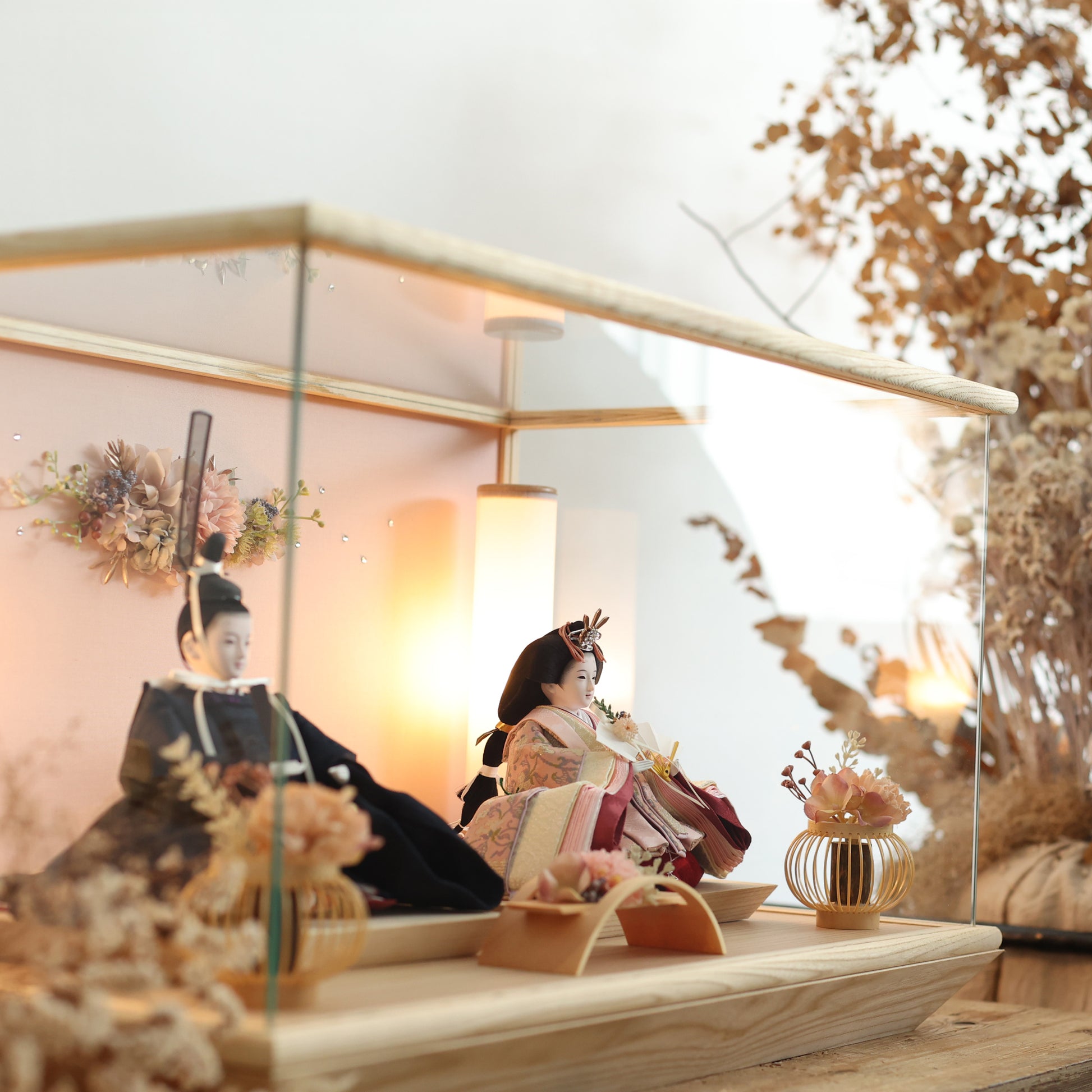 通常2mm厚が一般的な中、当店ではより高品質なAGC製3mmガラスを採用しています。厚みが増すことで強度と安全性が高まり、透明度の高いクリアな美しさを保ちます。大切な雛人形を守りながら、高級感のある見栄えを実現しています。