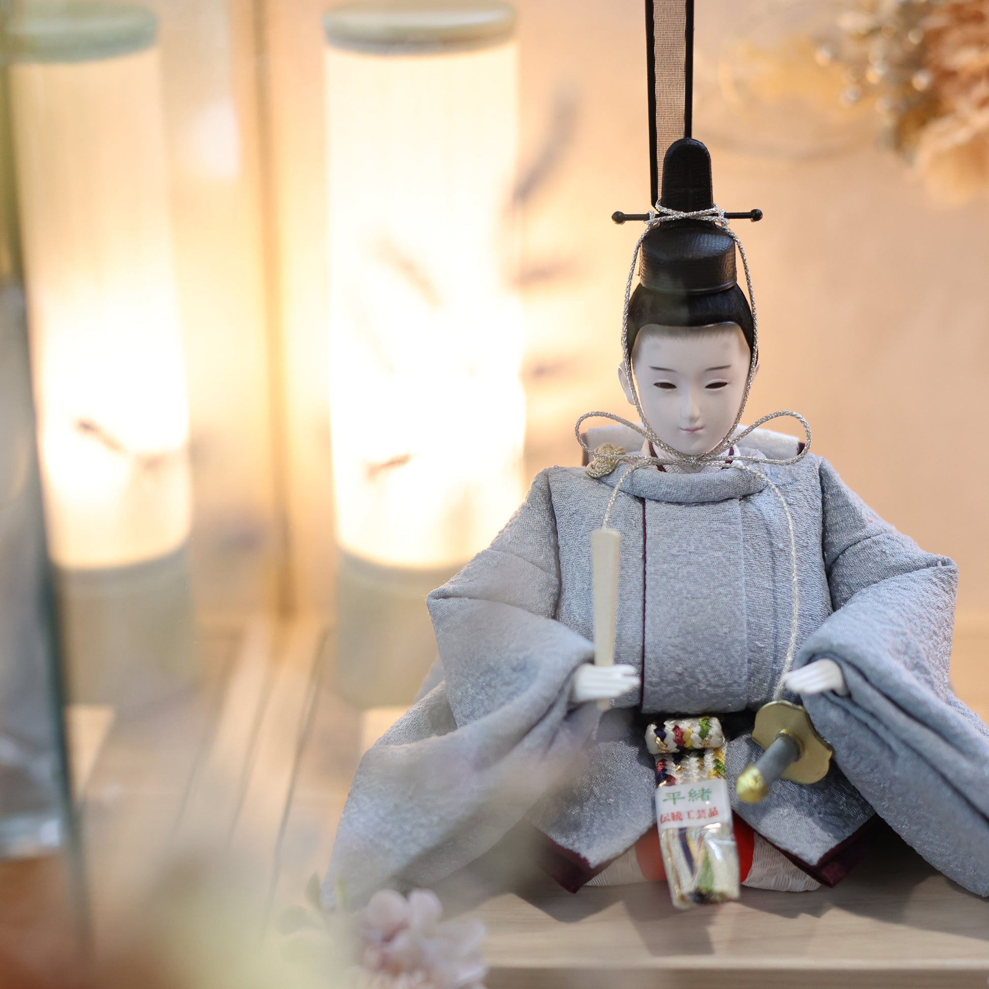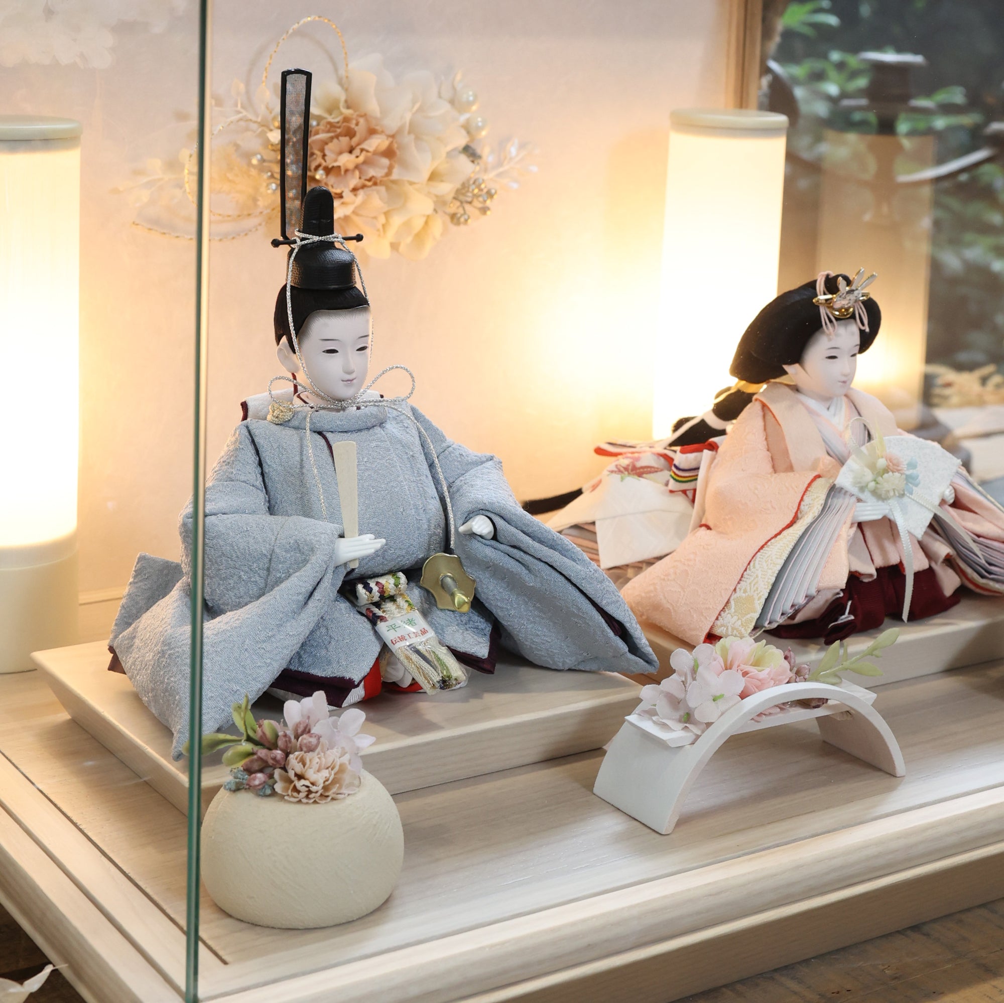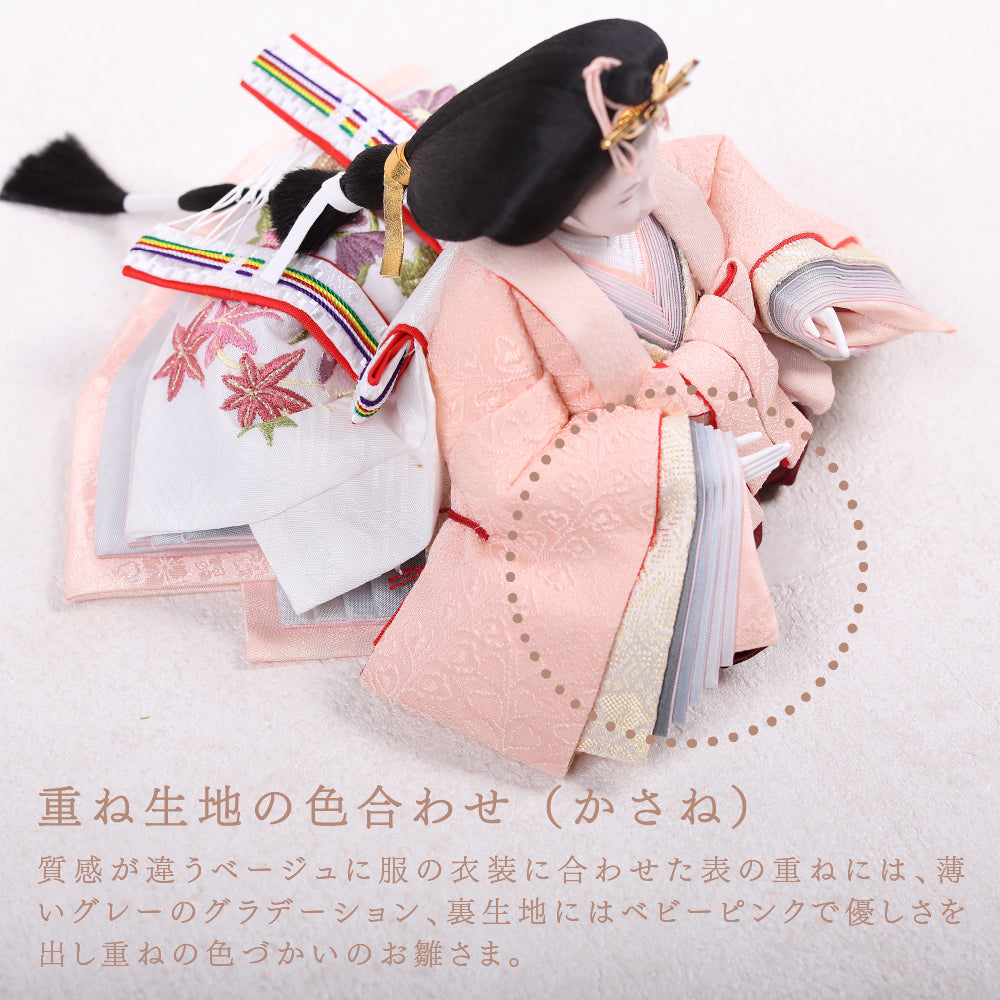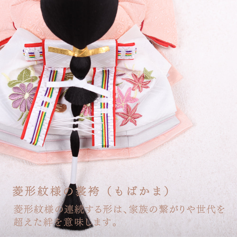 藤地模様の正絹生地を用いたお雛様。藤は繁栄と絆を象徴し、赤ちゃんの成長と家族の繁栄を願う意味が込められています。