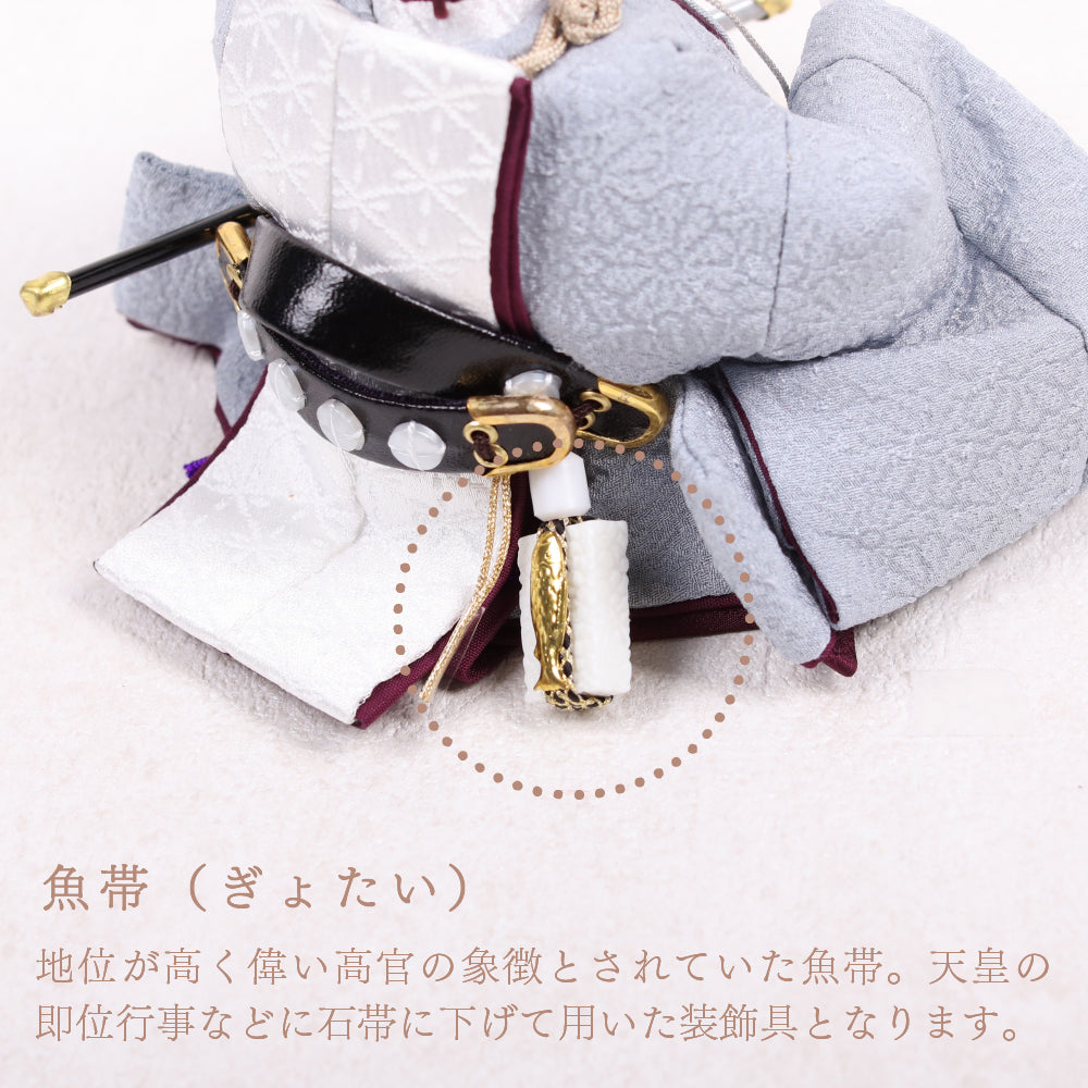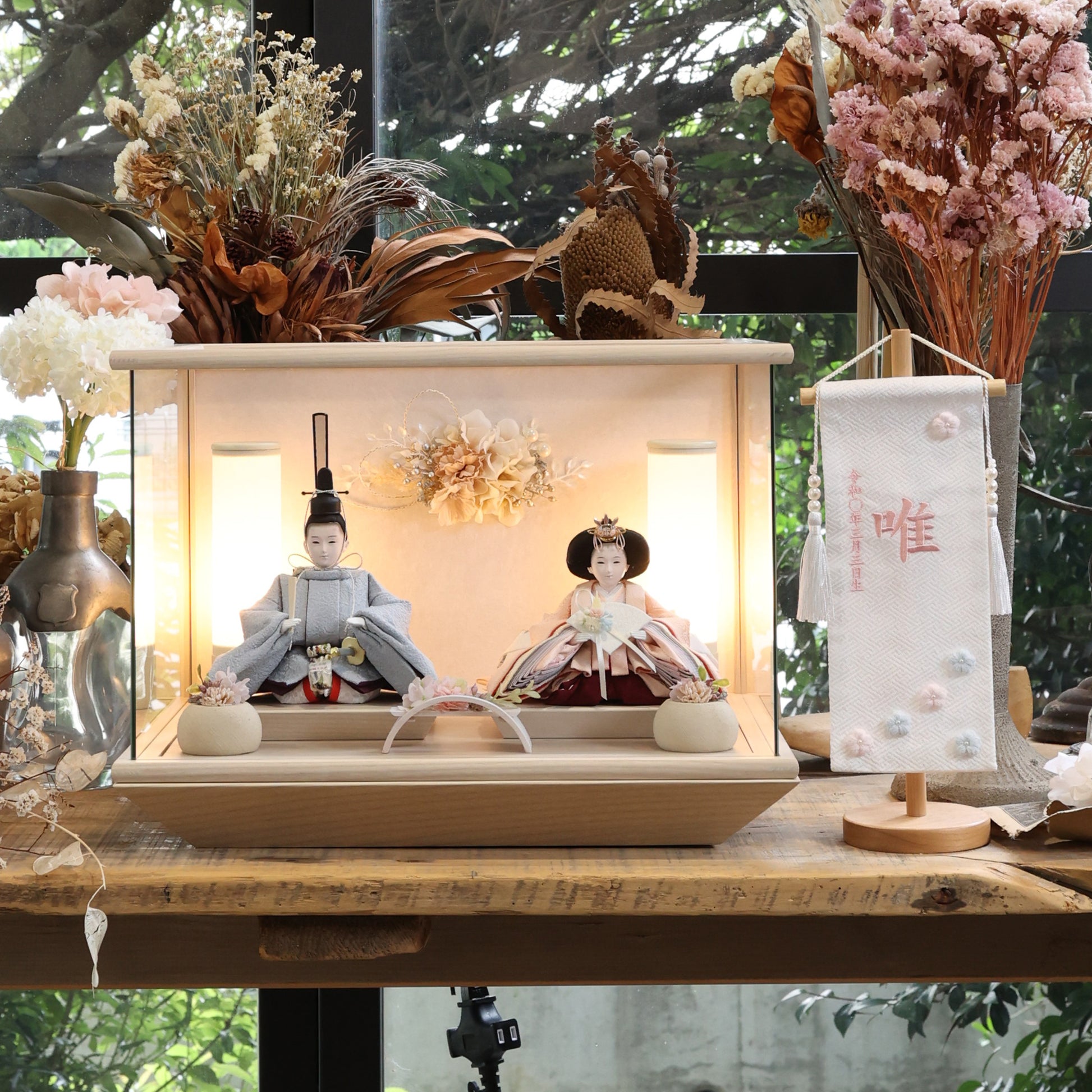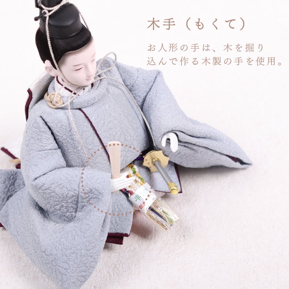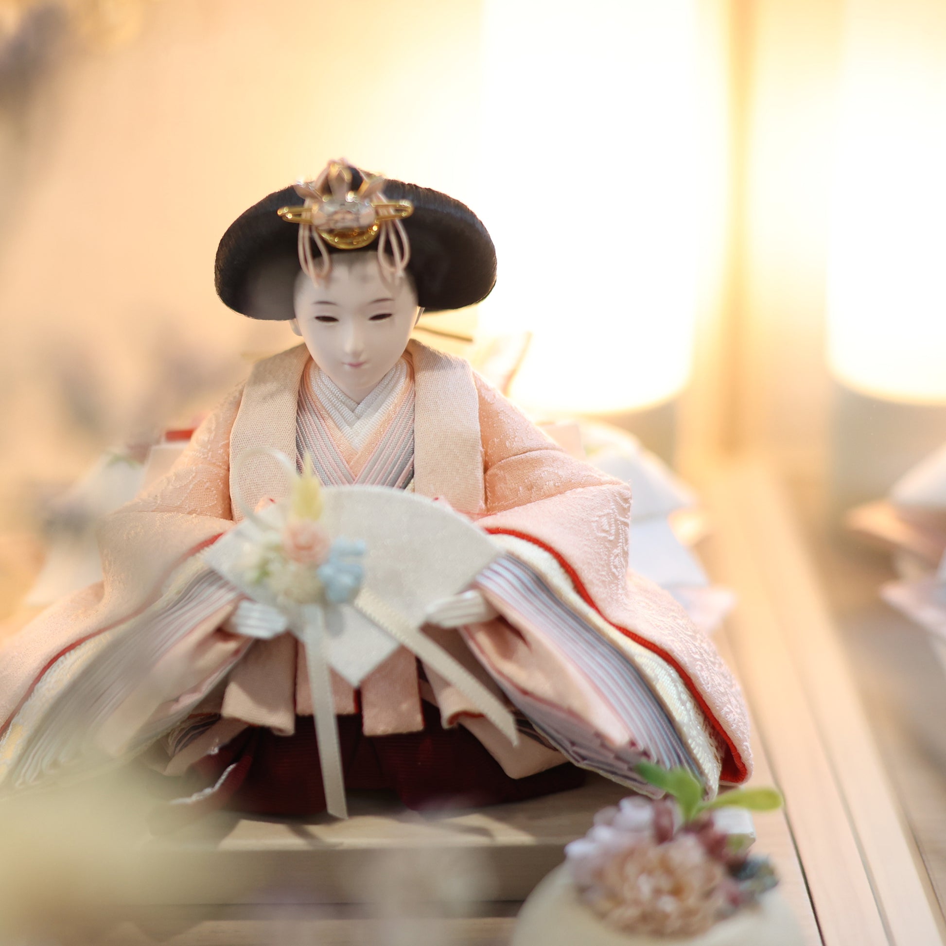藤地模様の正絹生地を用いたお雛様。藤は繁栄と絆を象徴し、赤ちゃんの成長と家族の繁栄を願う意味が込められています。