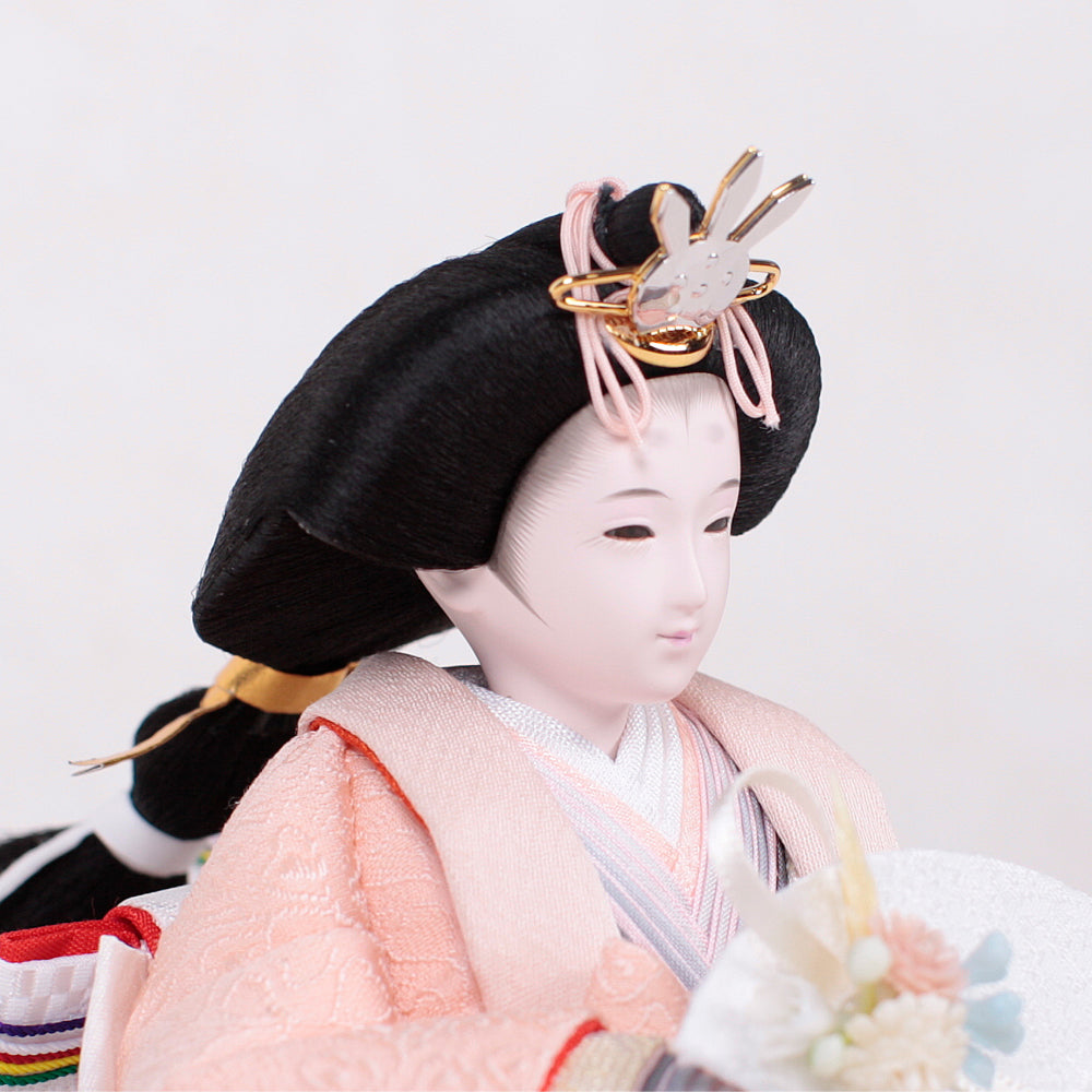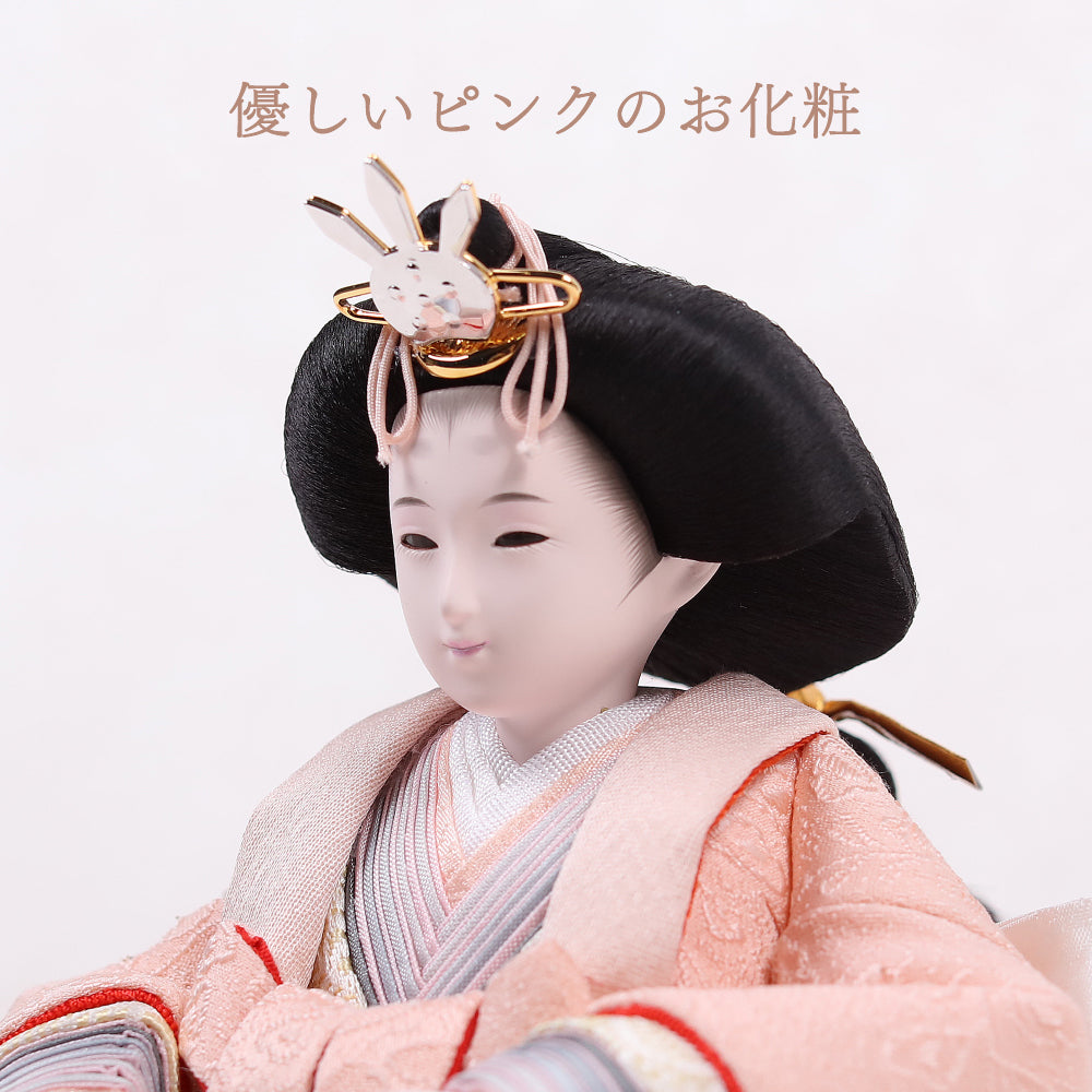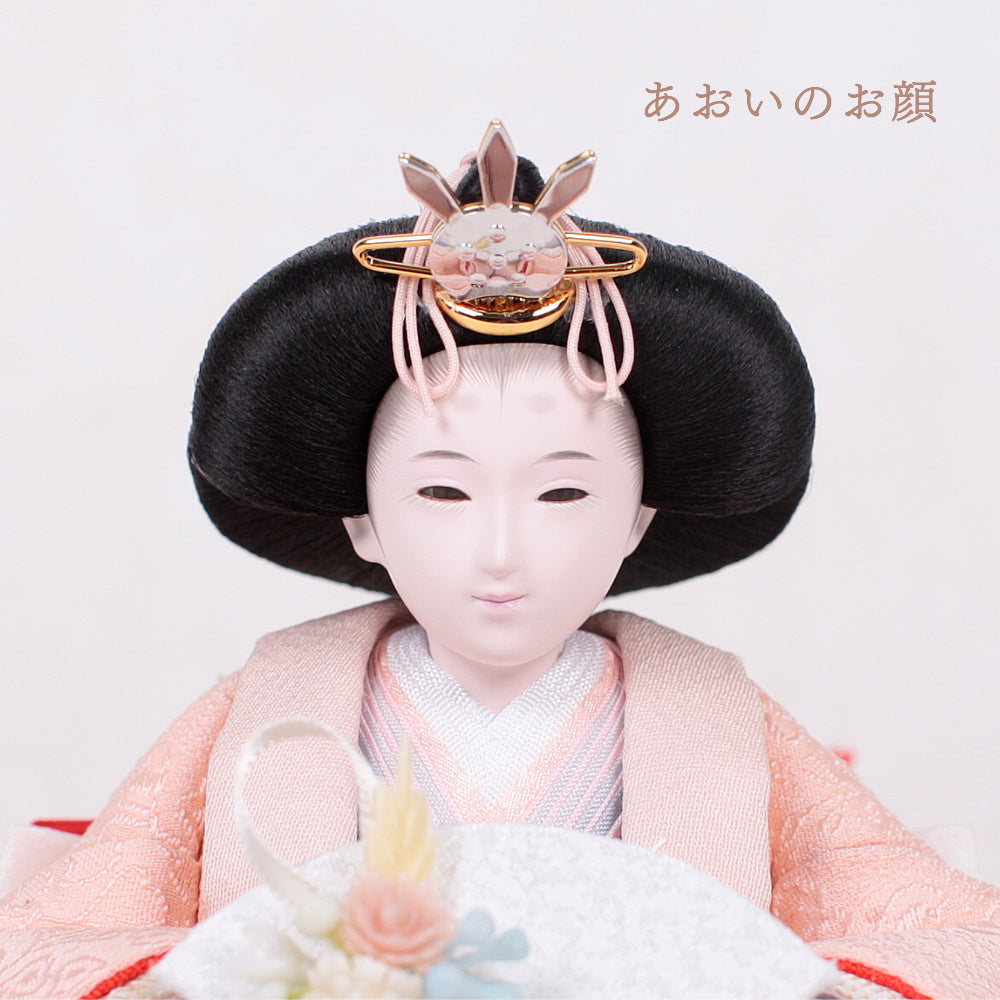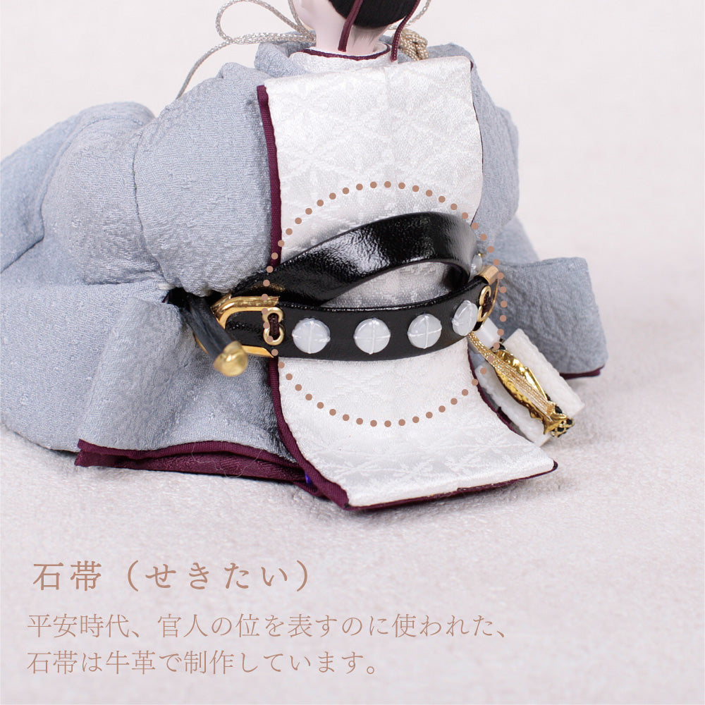 藤地模様の正絹生地を用いたお雛様。藤は繁栄と絆を象徴し、赤ちゃんの成長と家族の繁栄を願う意味が込められています。