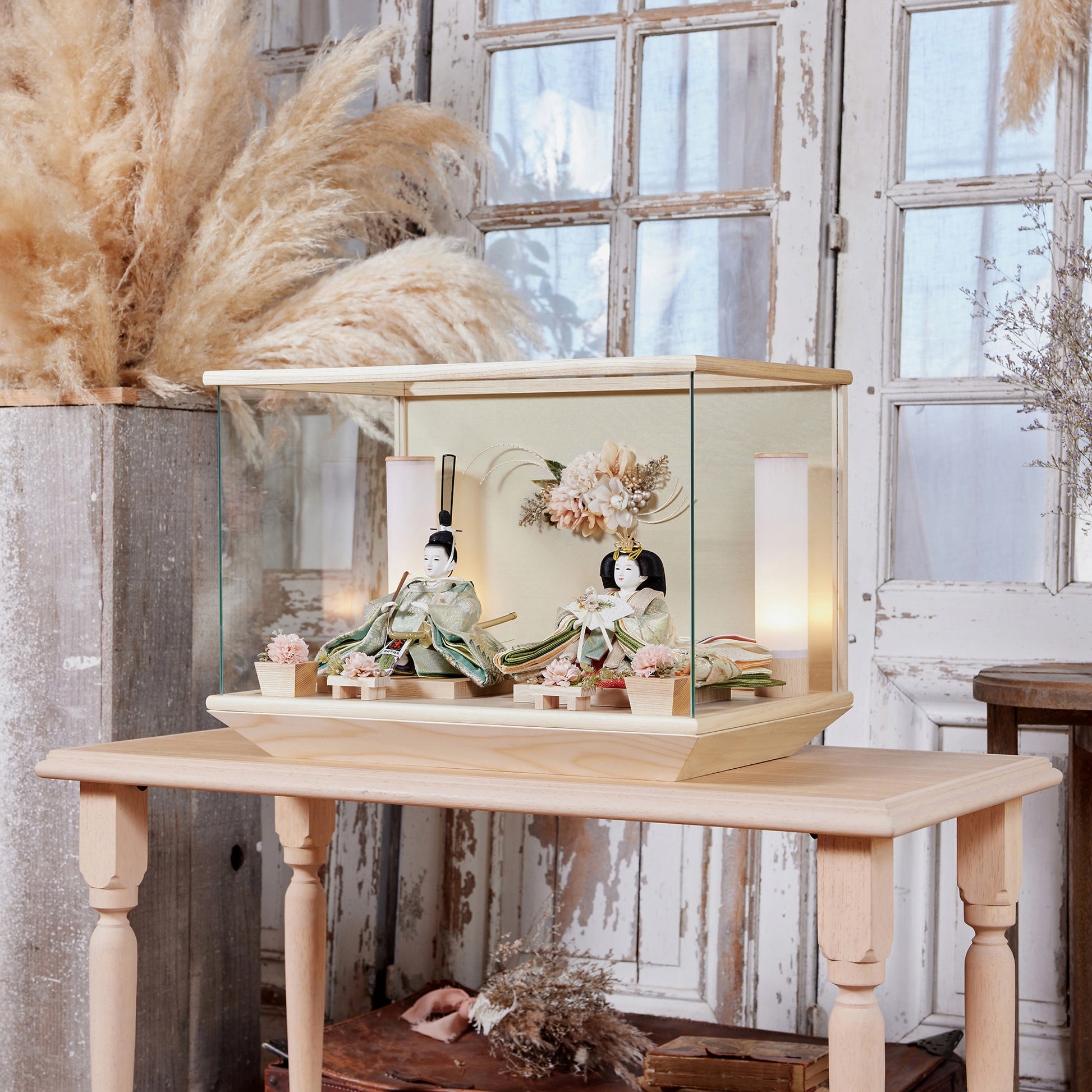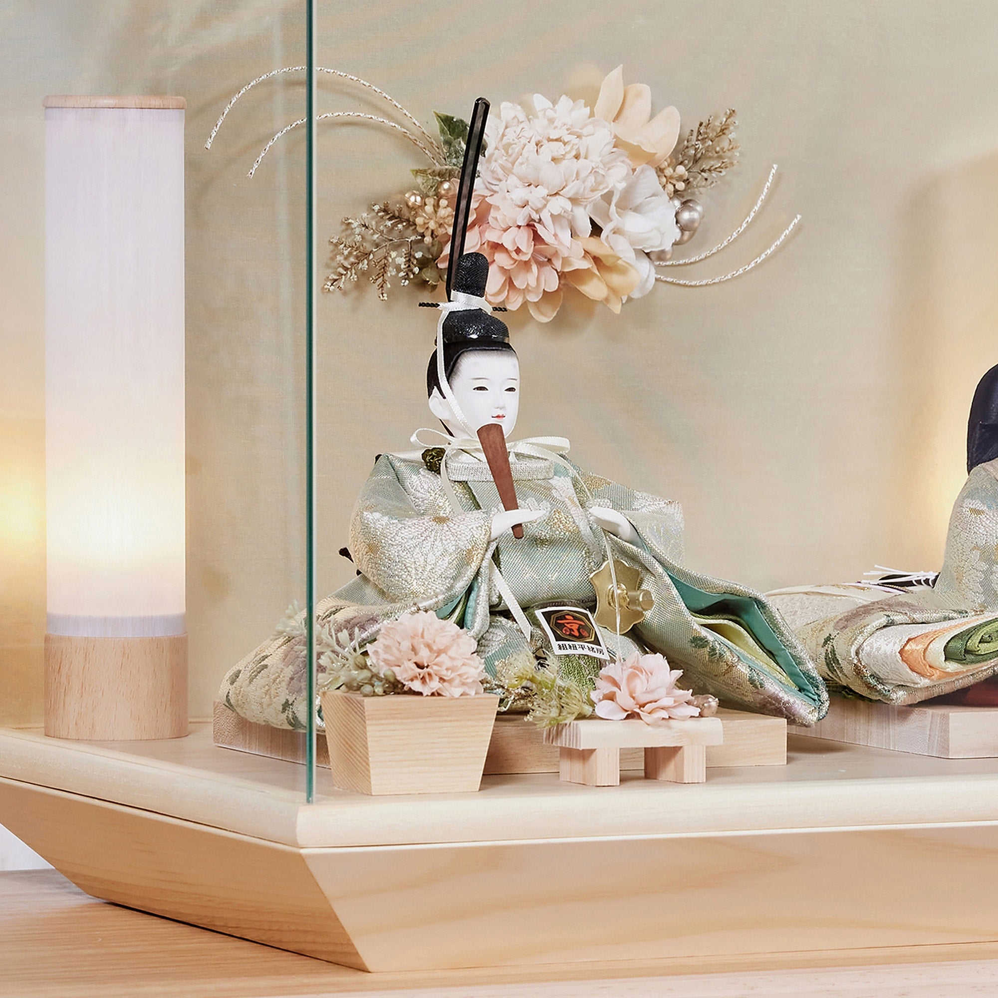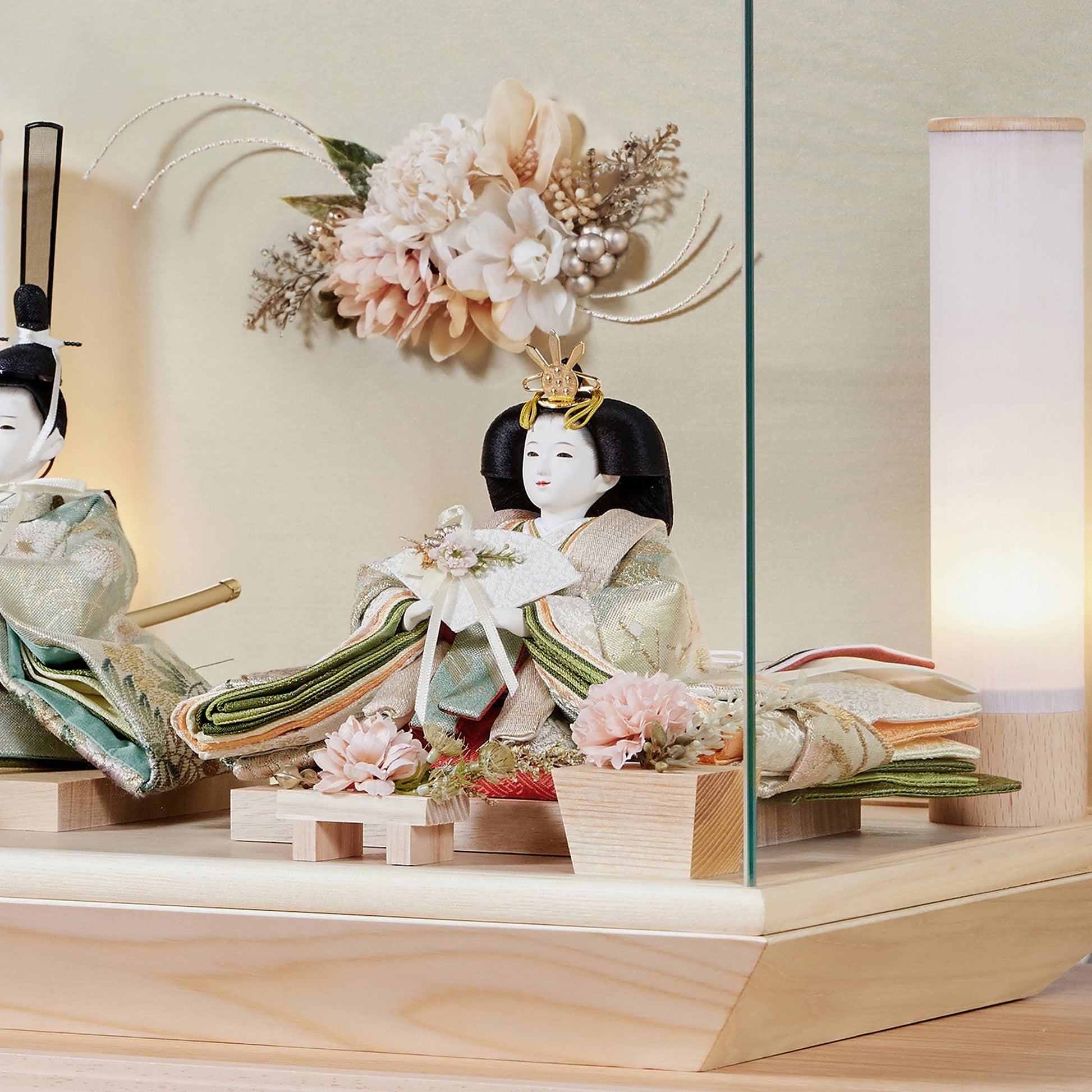 通常2mm厚が一般的な中、当店ではより高品質なAGC製3mmガラスを採用しています。厚みが増すことで強度と安全性が高まり、透明度の高いクリアな美しさを保ちます。大切な雛人形を守りながら、高級感のある見栄えを実現しています。