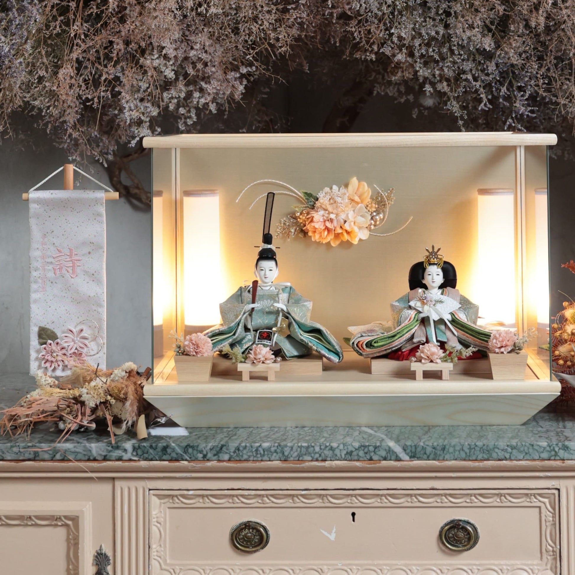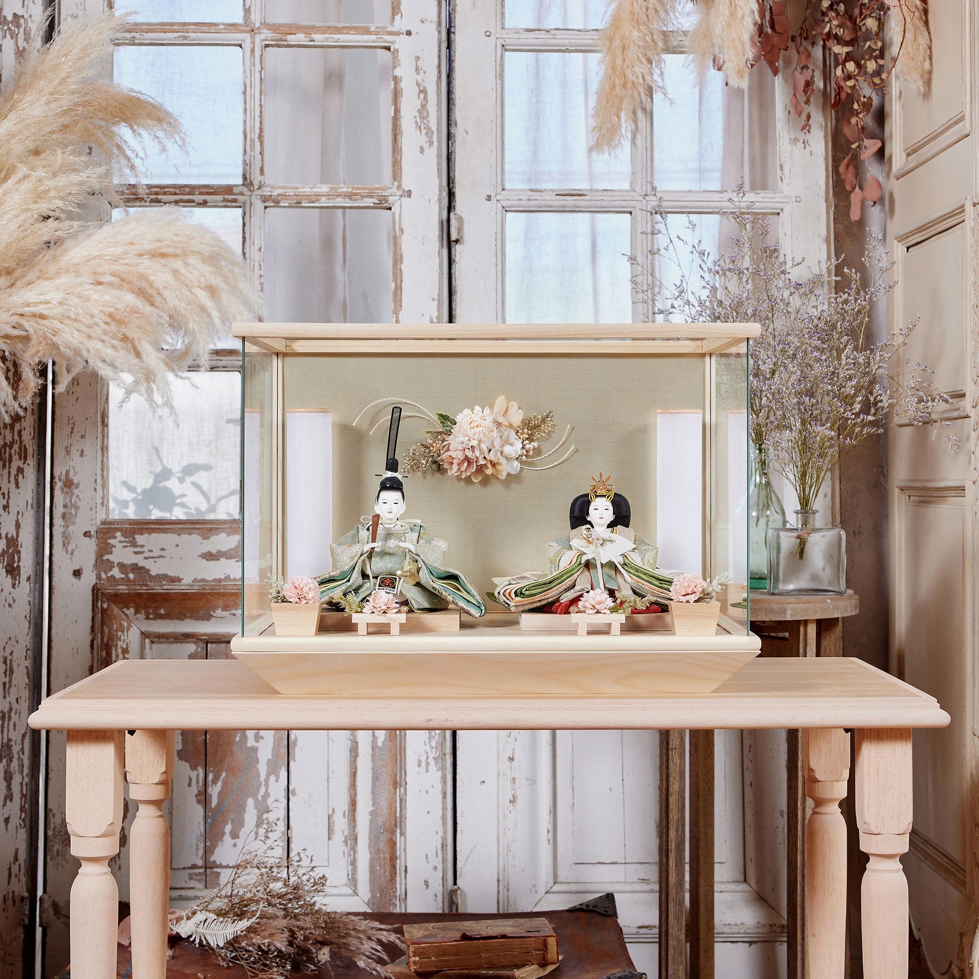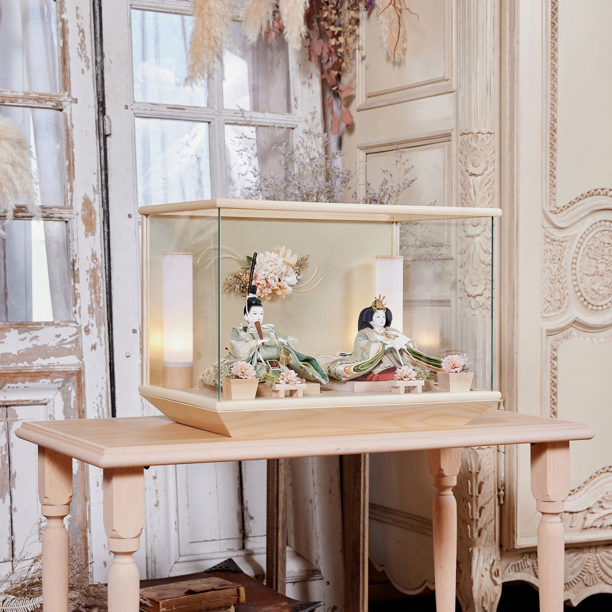 通常2mm厚が一般的な中、当店ではより高品質なAGC製3mmガラスを採用しています。厚みが増すことで強度と安全性が高まり、透明度の高いクリアな美しさを保ちます。大切な雛人形を守りながら、高級感のある見栄えを実現しています。