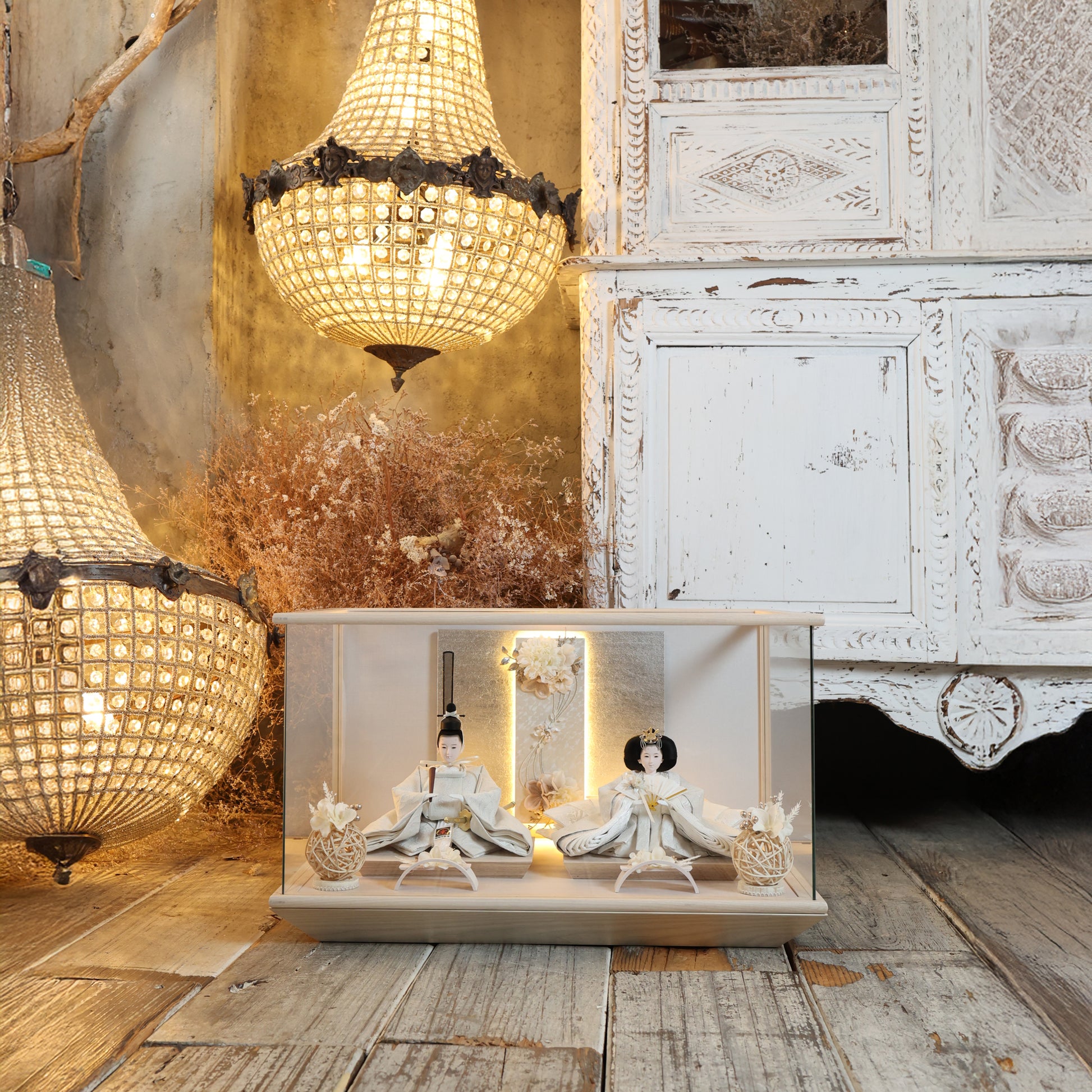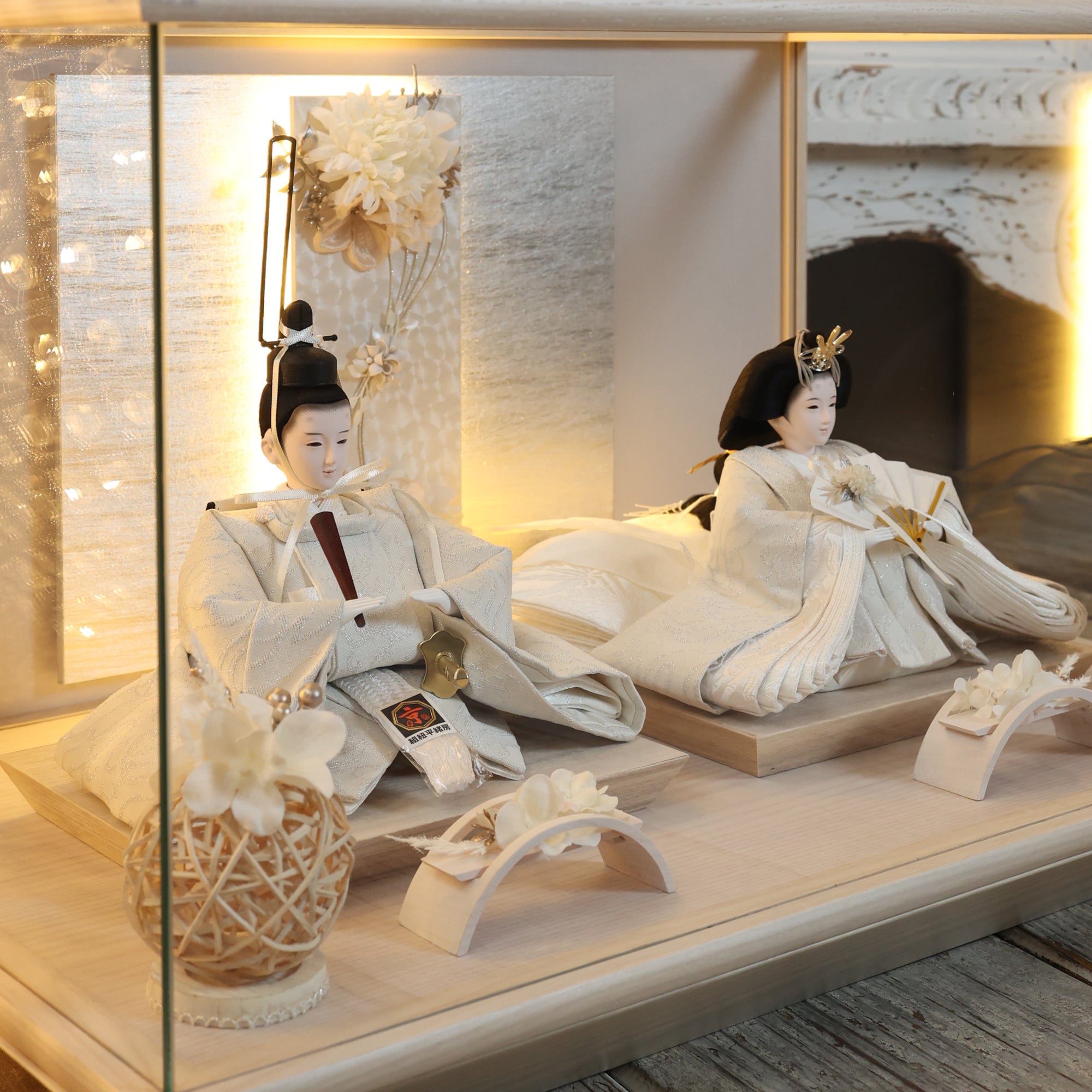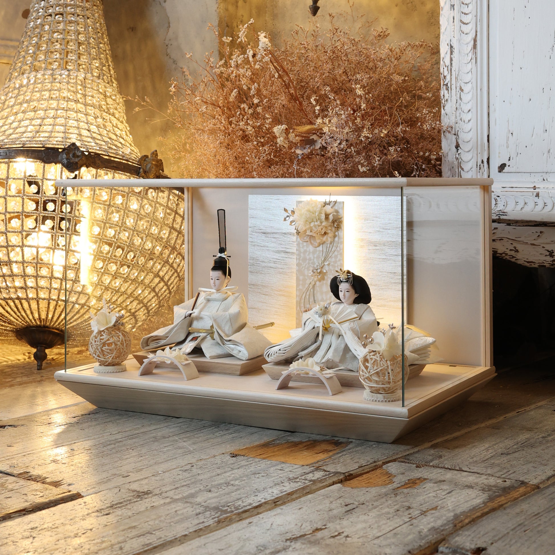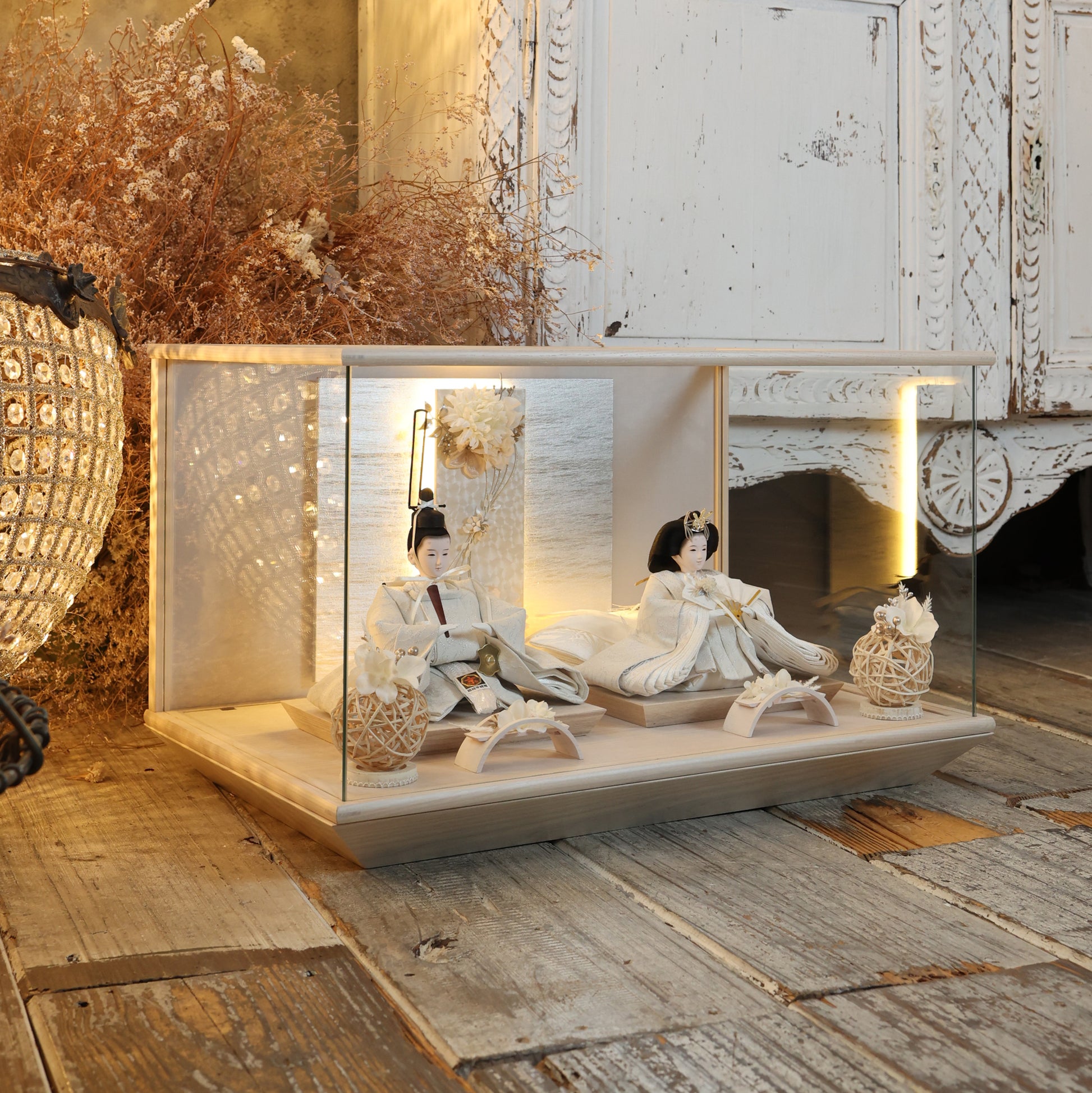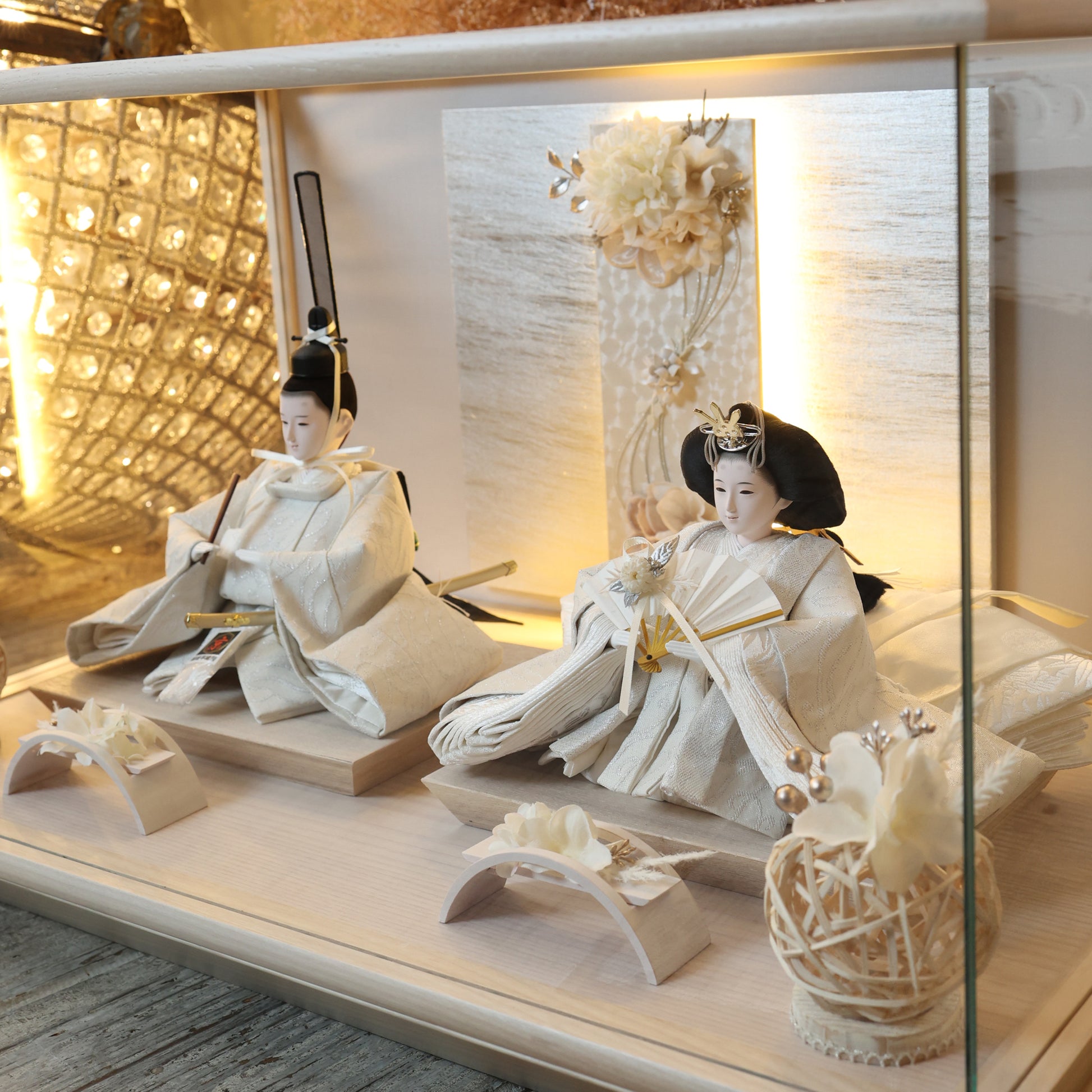 通常2mm厚が一般的な中、当店ではより高品質なAGC製3mmガラスを採用しています。厚みが増すことで強度と安全性が高まり、透明度の高いクリアな美しさを保ちます。大切な雛人形を守りながら、高級感のある見栄えを実現しています。