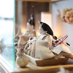 熊倉基安の作品「sumire」は、パールのような上品な輝きと、優雅さを演出しています。洗練された表情と品格ある佇まいが、空間全体を格調高く彩ります。「お人形は顔がいのち」と言われるように、熊倉基安の技術と感性が一体となった逸品で、伝統を大切にしながらも新しい美しさを追求するその姿勢が、ひときわの魅力を放っています。