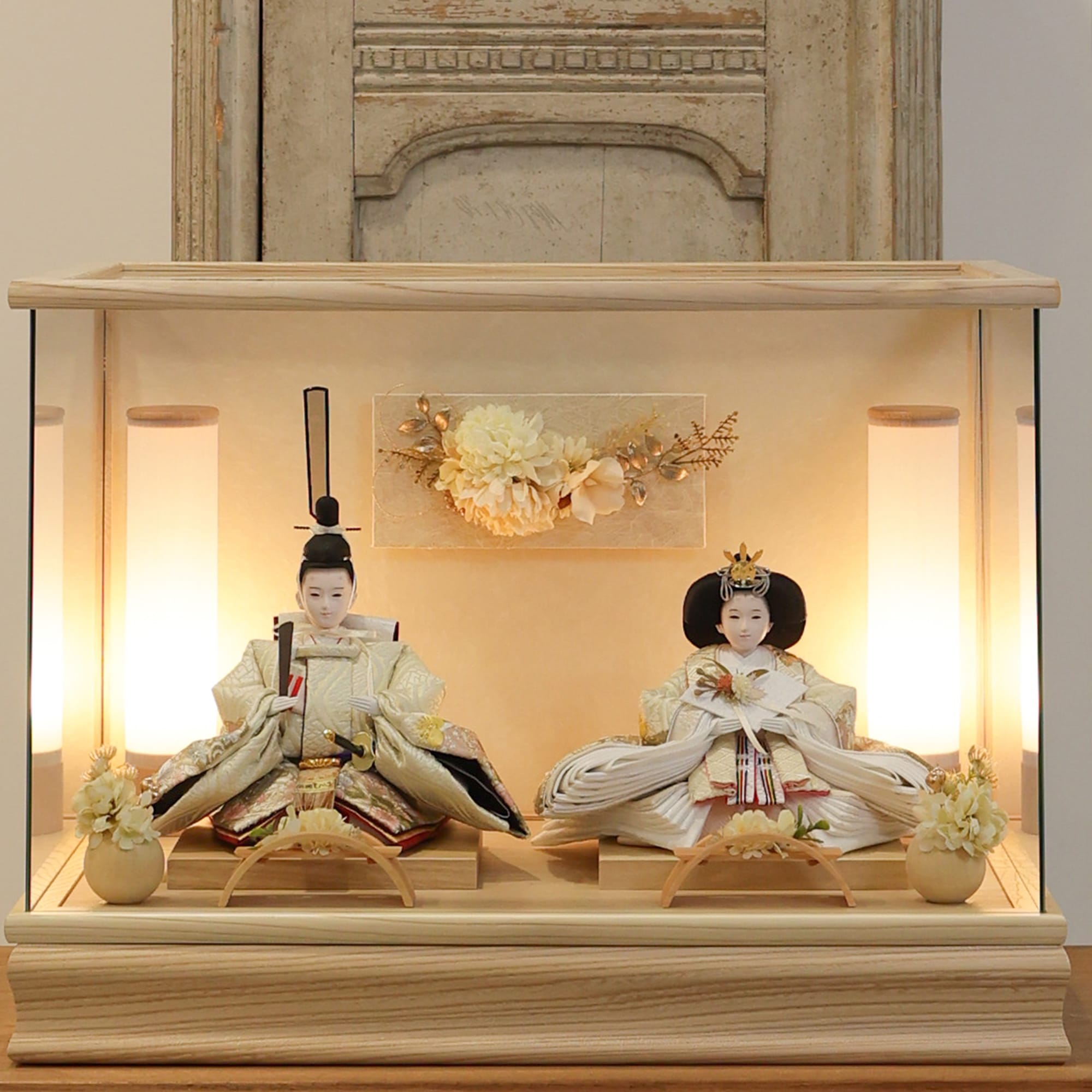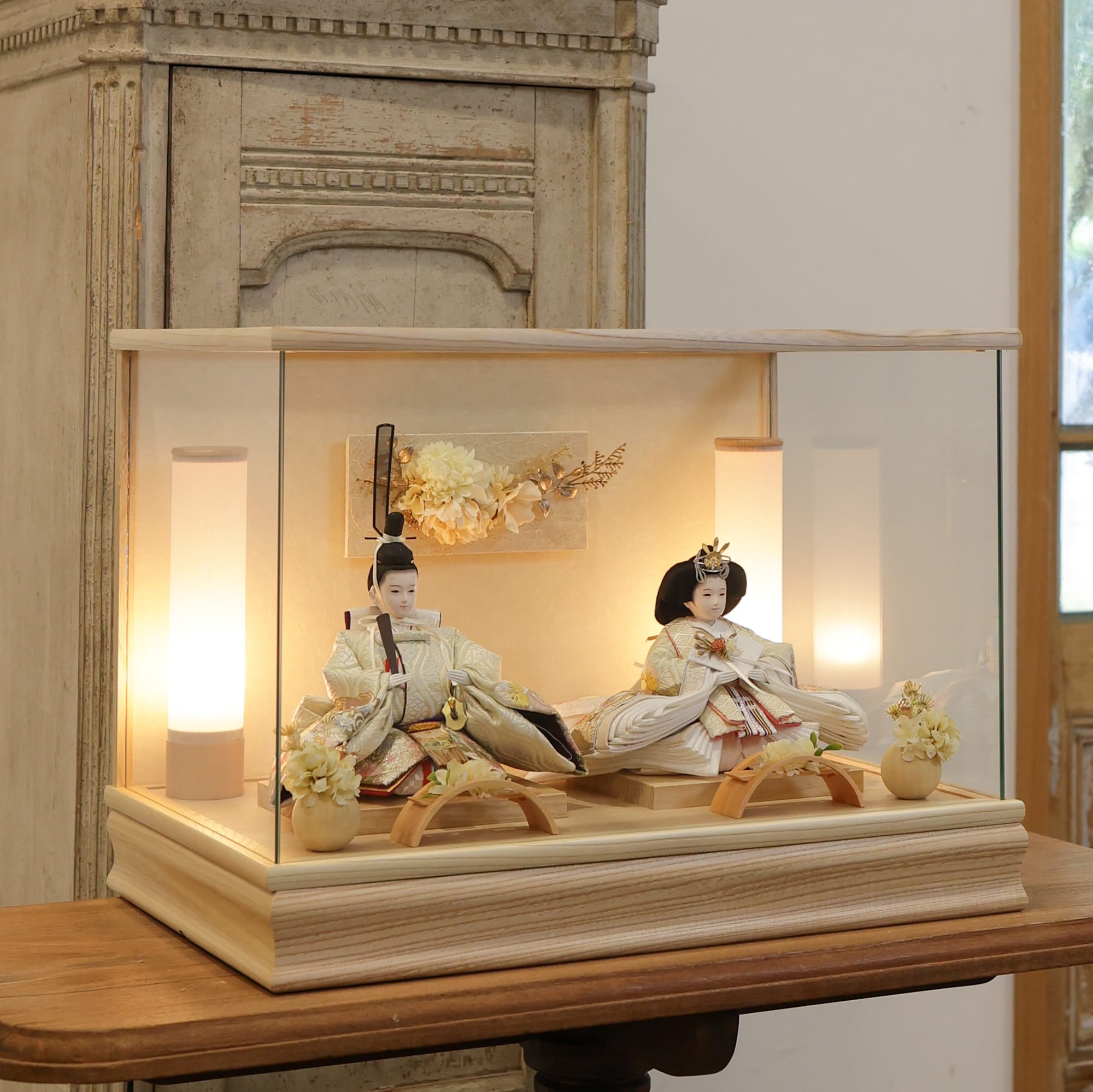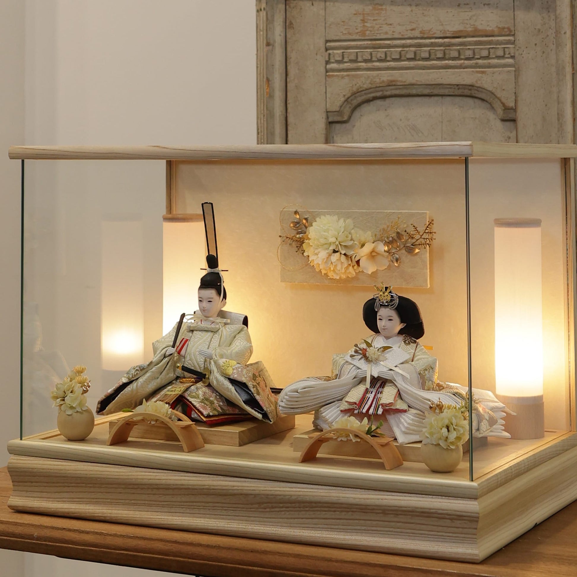 通常2mm厚が一般的な中、当店ではより高品質なAGC製3mmガラスを採用しています。厚みが増すことで強度と安全性が高まり、透明度の高いクリアな美しさを保ちます。大切な雛人形を守りながら、高級感のある見栄えを実現しています。