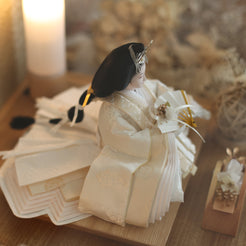 このアレンジメントの主役は、アイボリー色のブランマム。柔らかな色合いは赤ちゃんの純粋さを象徴し、花言葉「真心」が愛や希望を感じさせます。ベースには阿波紙のシャンパンゴールドを使用し、華やかさと上品さをプラス。アイボリーとゴールドの調和が軽やかで優美な印象を与え、このデザインは赤ちゃんの誕生や特別な祝い事にぴったりの贈り物です。愛と希望が詰まったこのアレンジメントは、心に残る感動を届けます。
