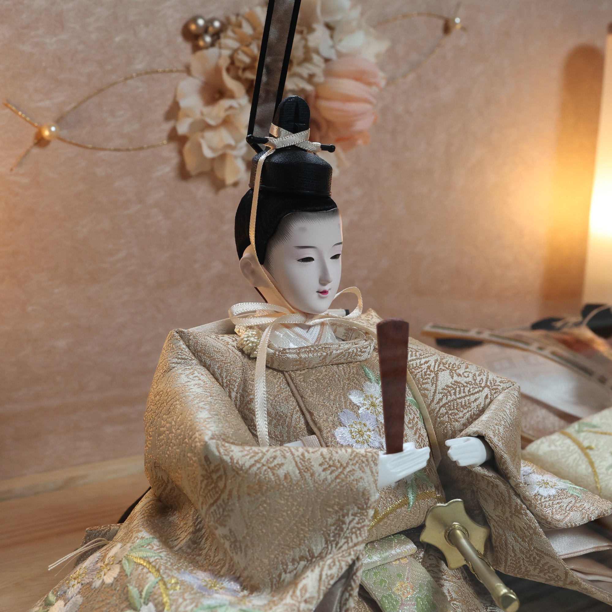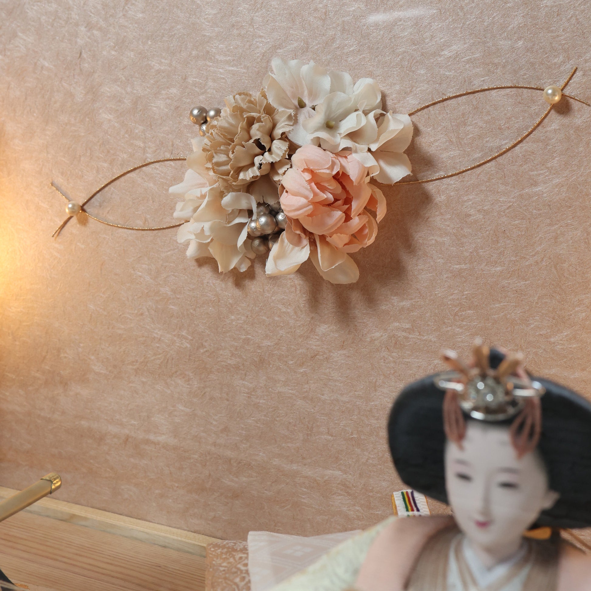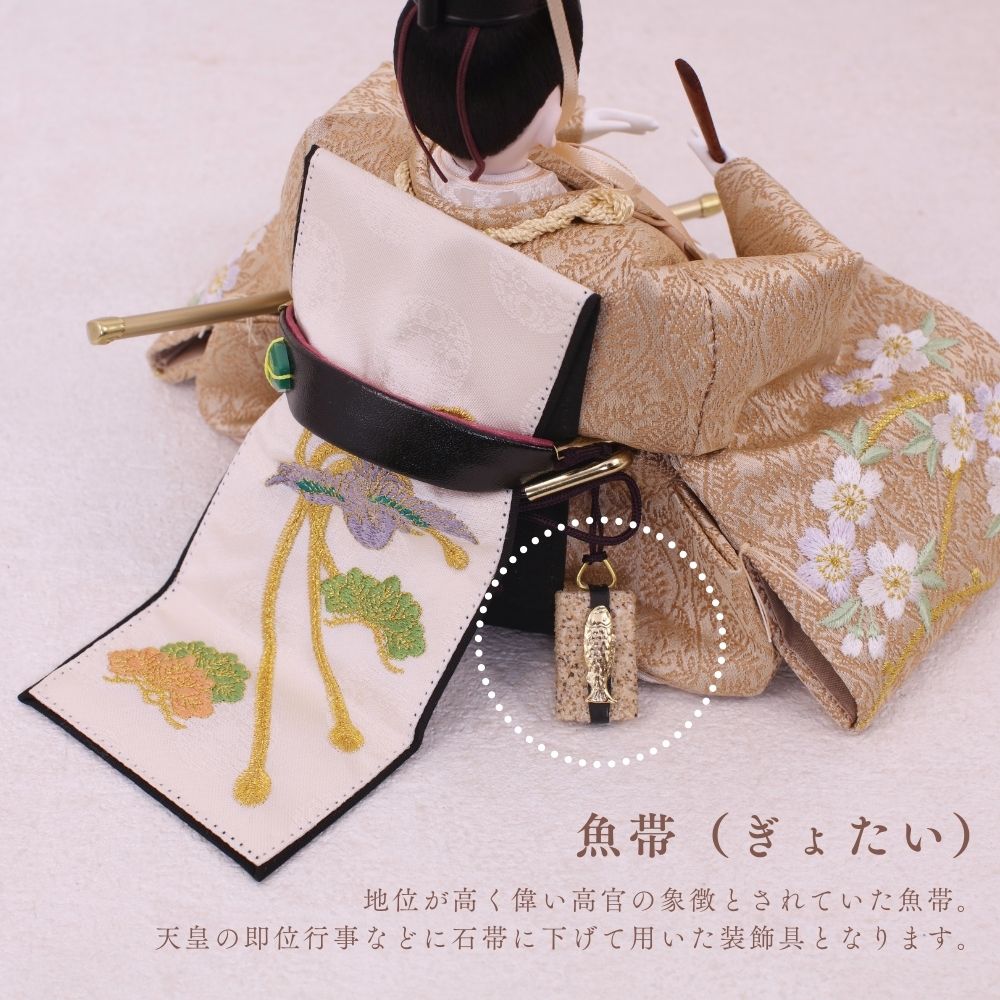 国産の栓(せん)は、美しい木目と温もりある質感が魅力の天然木です。耐久性に優れ、経年とともに味わいを深めます。台座や屏風などに使用することで、自然素材ならではの落ち着いた風合いと上質感を演出し、雛人形全体をより品格ある印象に仕上げます。