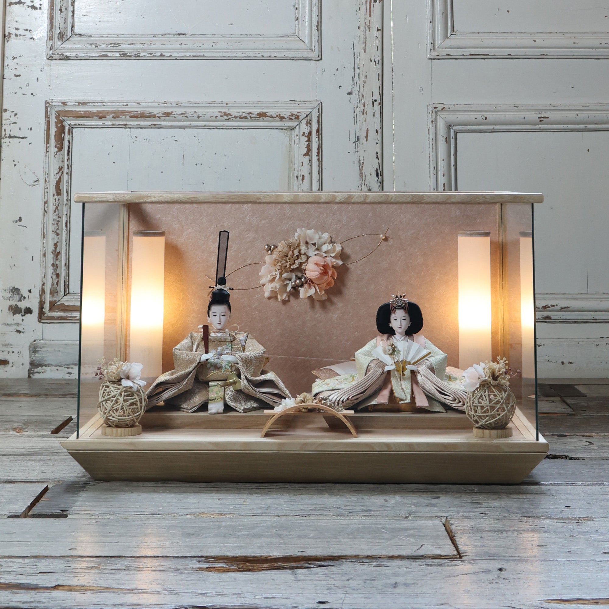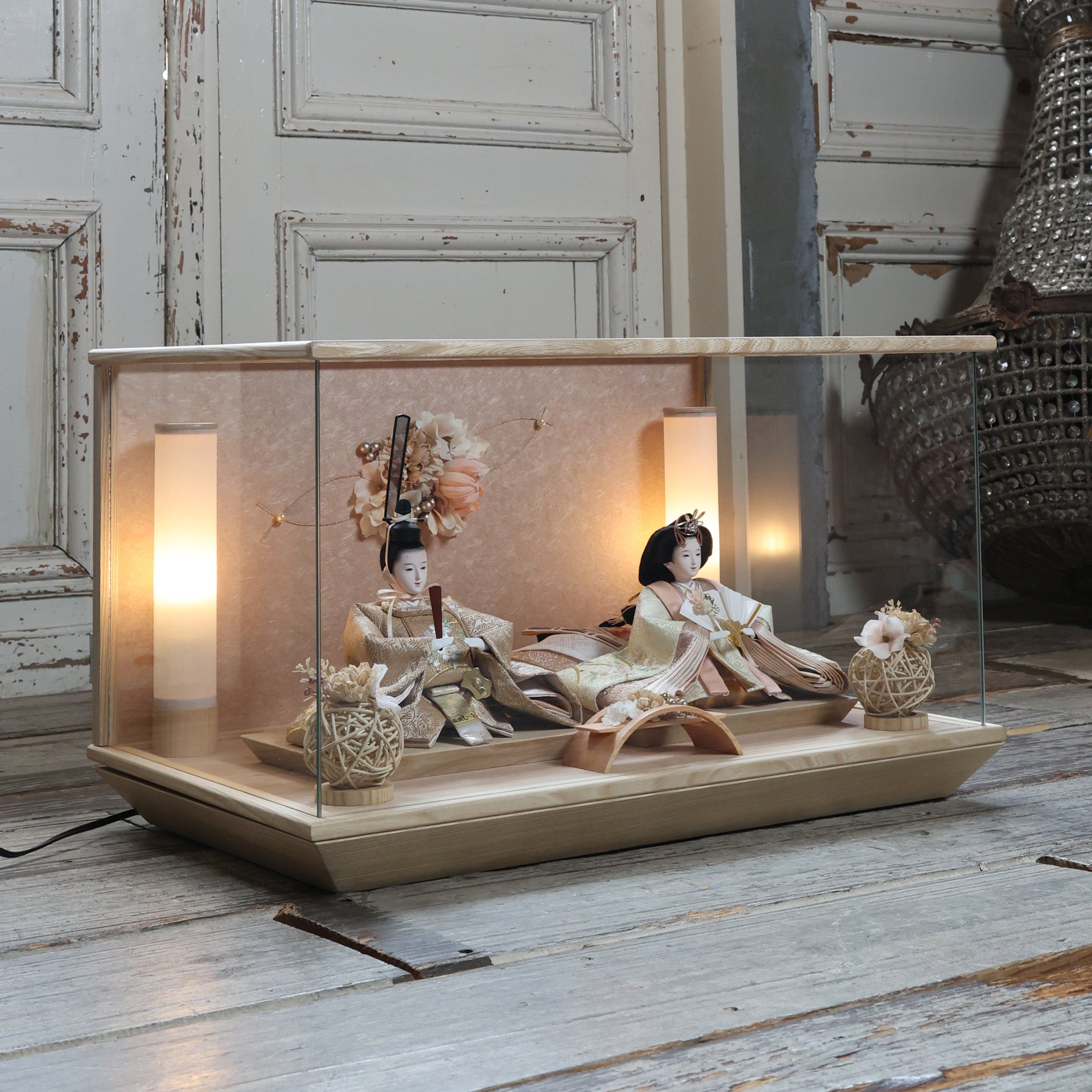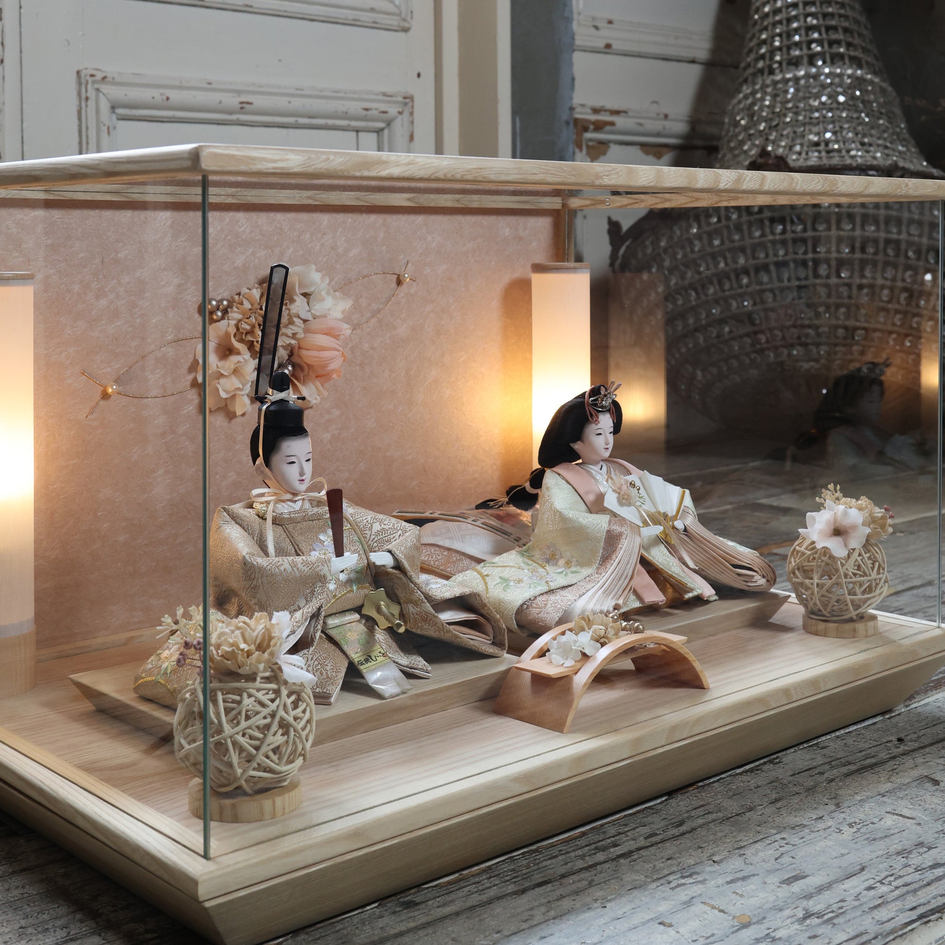 通常2mm厚が一般的な中、当店ではより高品質なAGC製3mmガラスを採用しています。厚みが増すことで強度と安全性が高まり、透明度の高いクリアな美しさを保ちます。大切な雛人形を守りながら、高級感のある見栄えを実現しています。