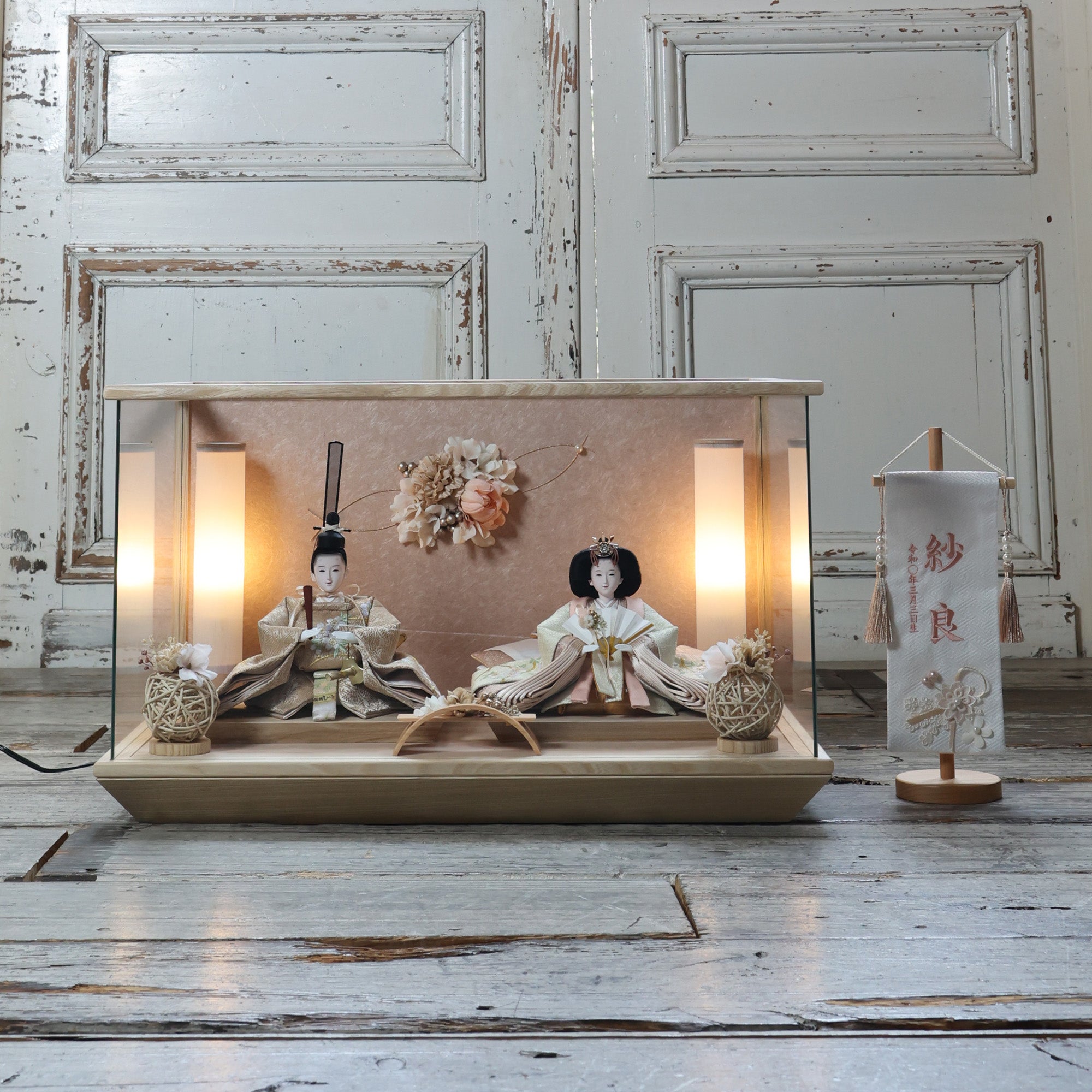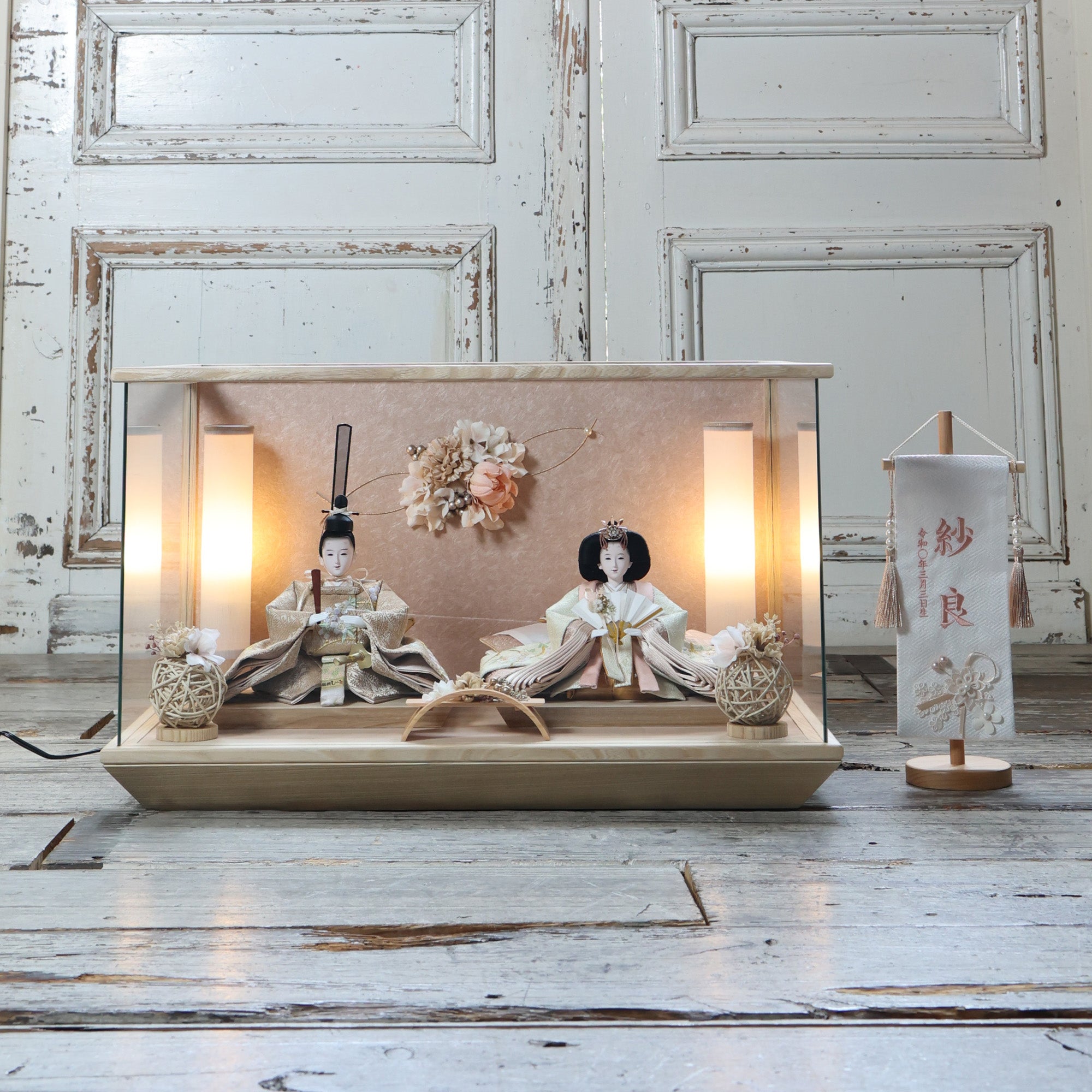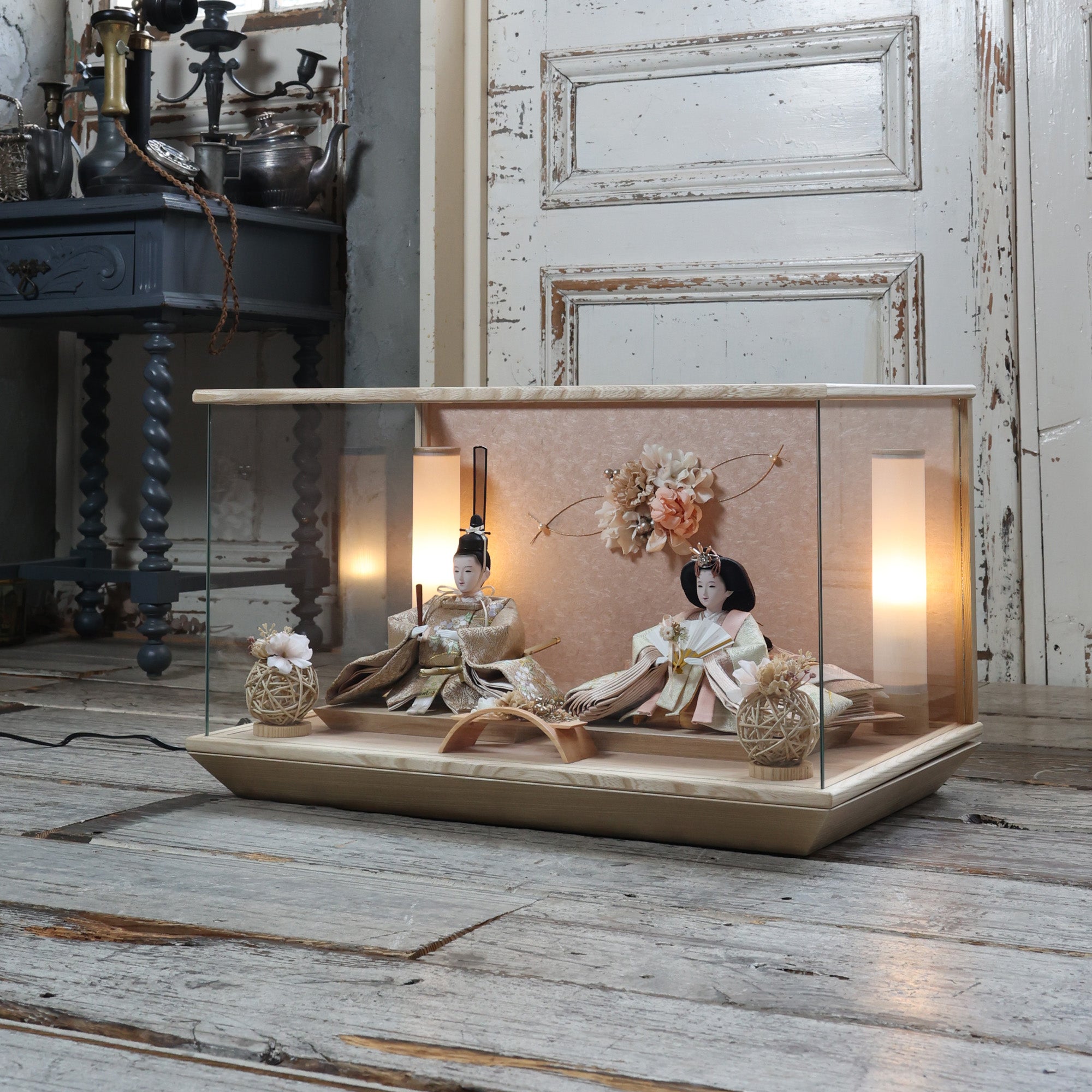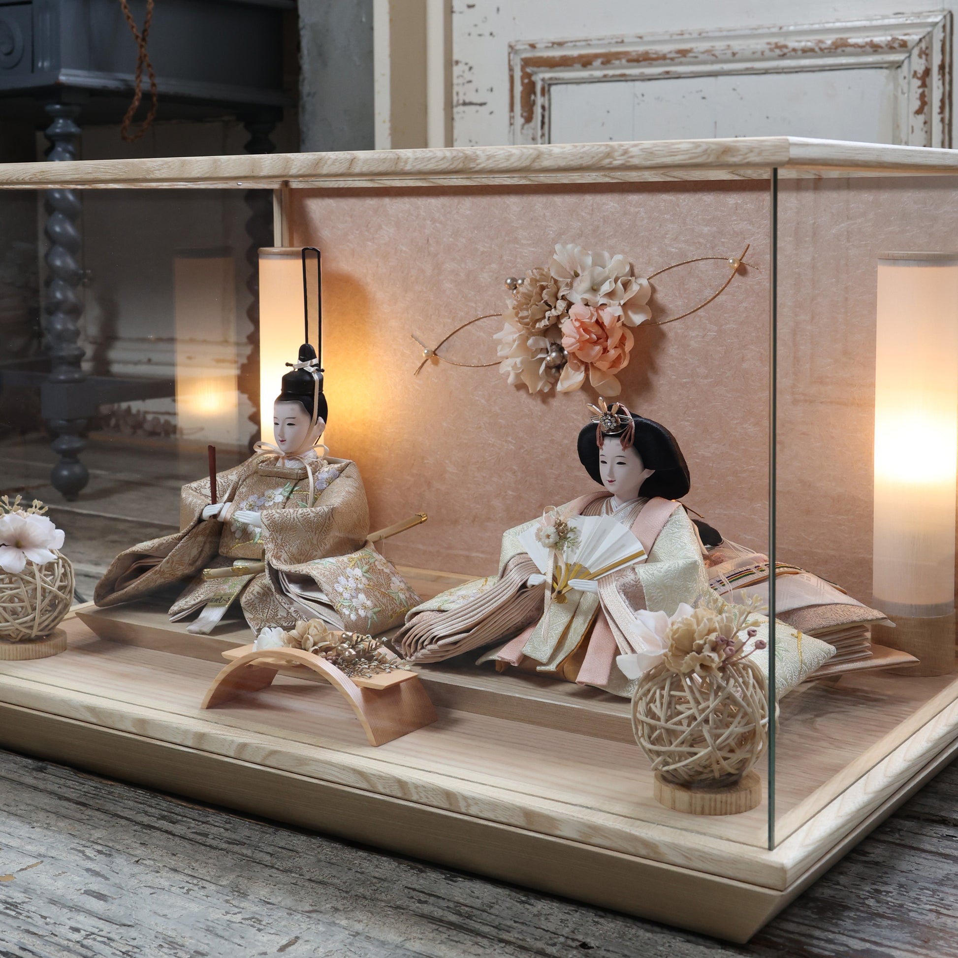 通常2mm厚が一般的な中、当店ではより高品質なAGC製3mmガラスを採用しています。厚みが増すことで強度と安全性が高まり、透明度の高いクリアな美しさを保ちます。大切な雛人形を守りながら、高級感のある見栄えを実現しています。