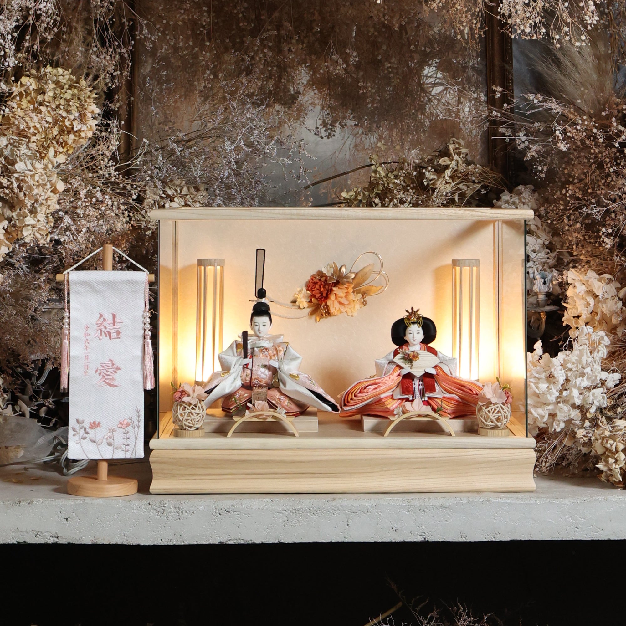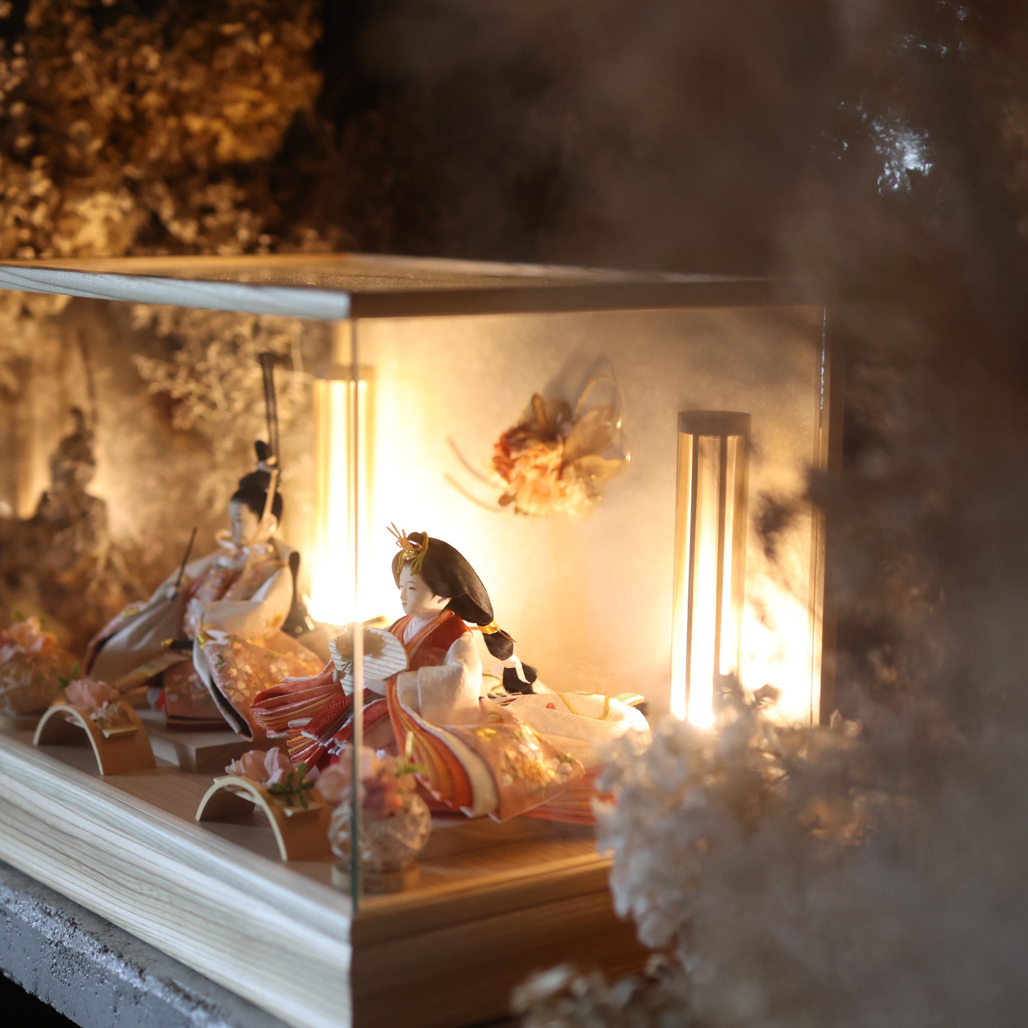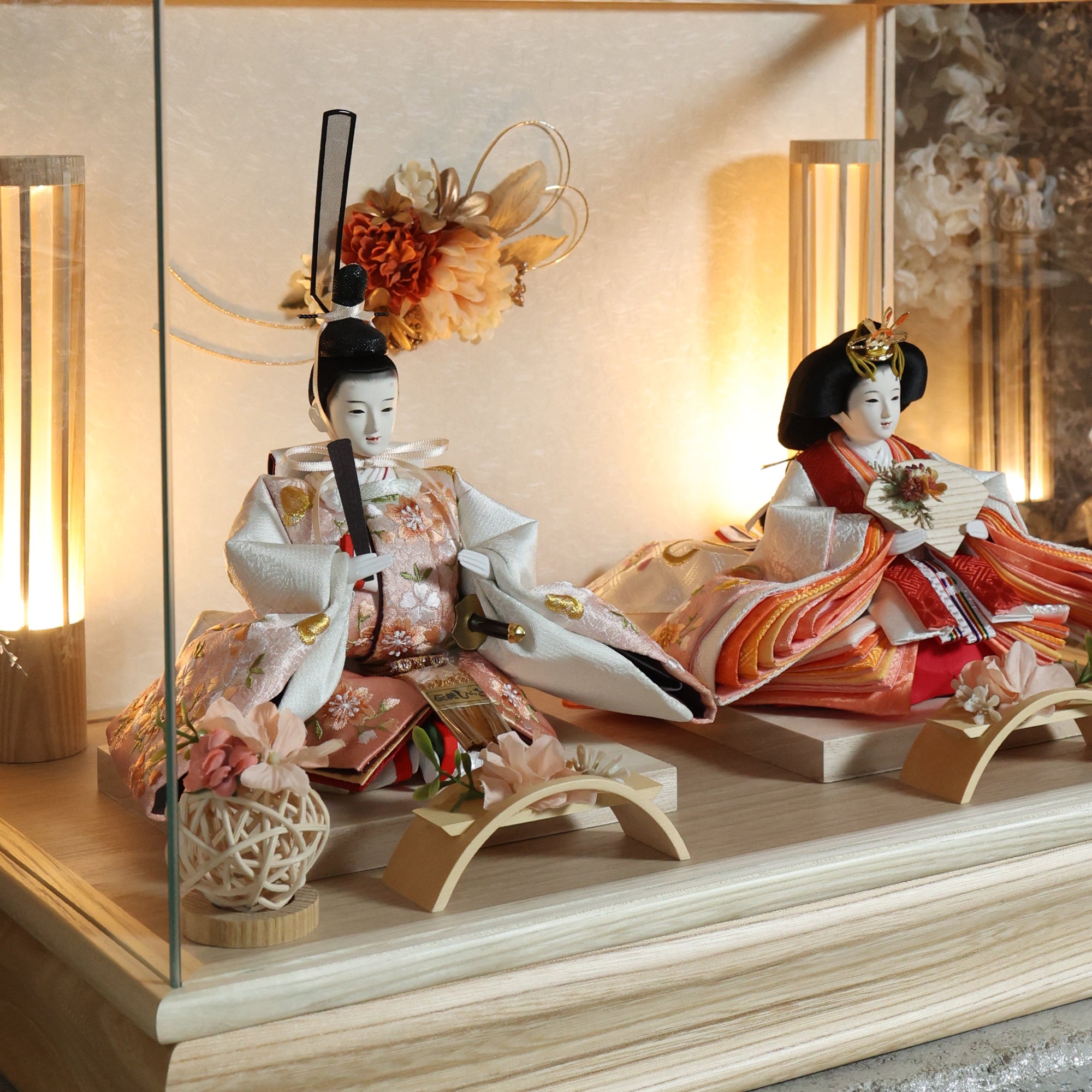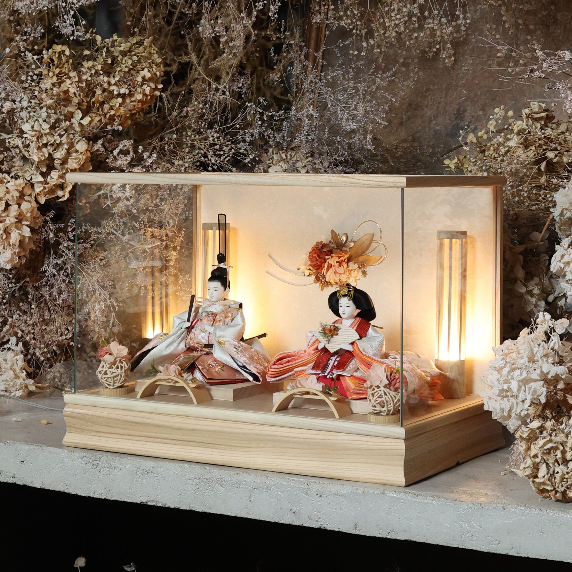 通常2mm厚が一般的な中、当店ではより高品質なAGC製3mmガラスを採用しています。厚みが増すことで強度と安全性が高まり、透明度の高いクリアな美しさを保ちます。大切な雛人形を守りながら、高級感のある見栄えを実現しています。