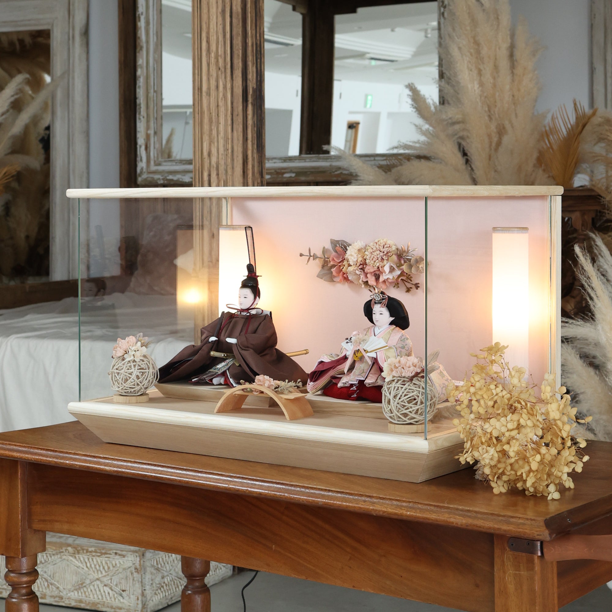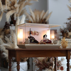 通常2mm厚が一般的な中、当店ではより高品質なAGC製3mmガラスを採用しています。厚みが増すことで強度と安全性が高まり、透明度の高いクリアな美しさを保ちます。大切な雛人形を守りながら、高級感のある見栄えを実現しています。