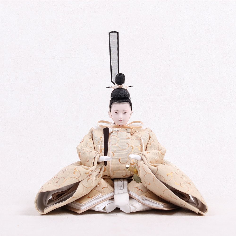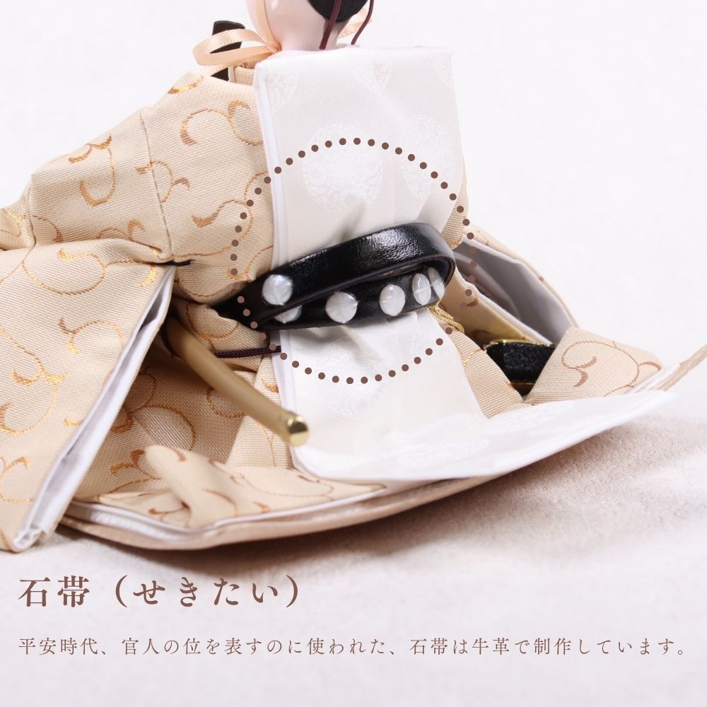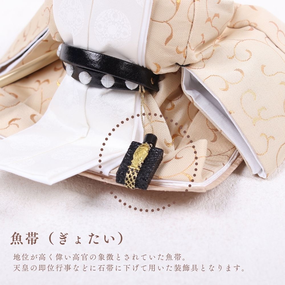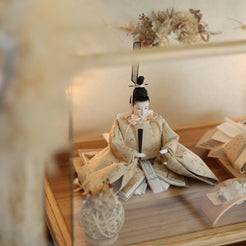 唐草文様に砥の粉色を纏った雛人形は、繁栄と幸福を願い、赤ちゃんの無垢さを表現する優雅な存在です。