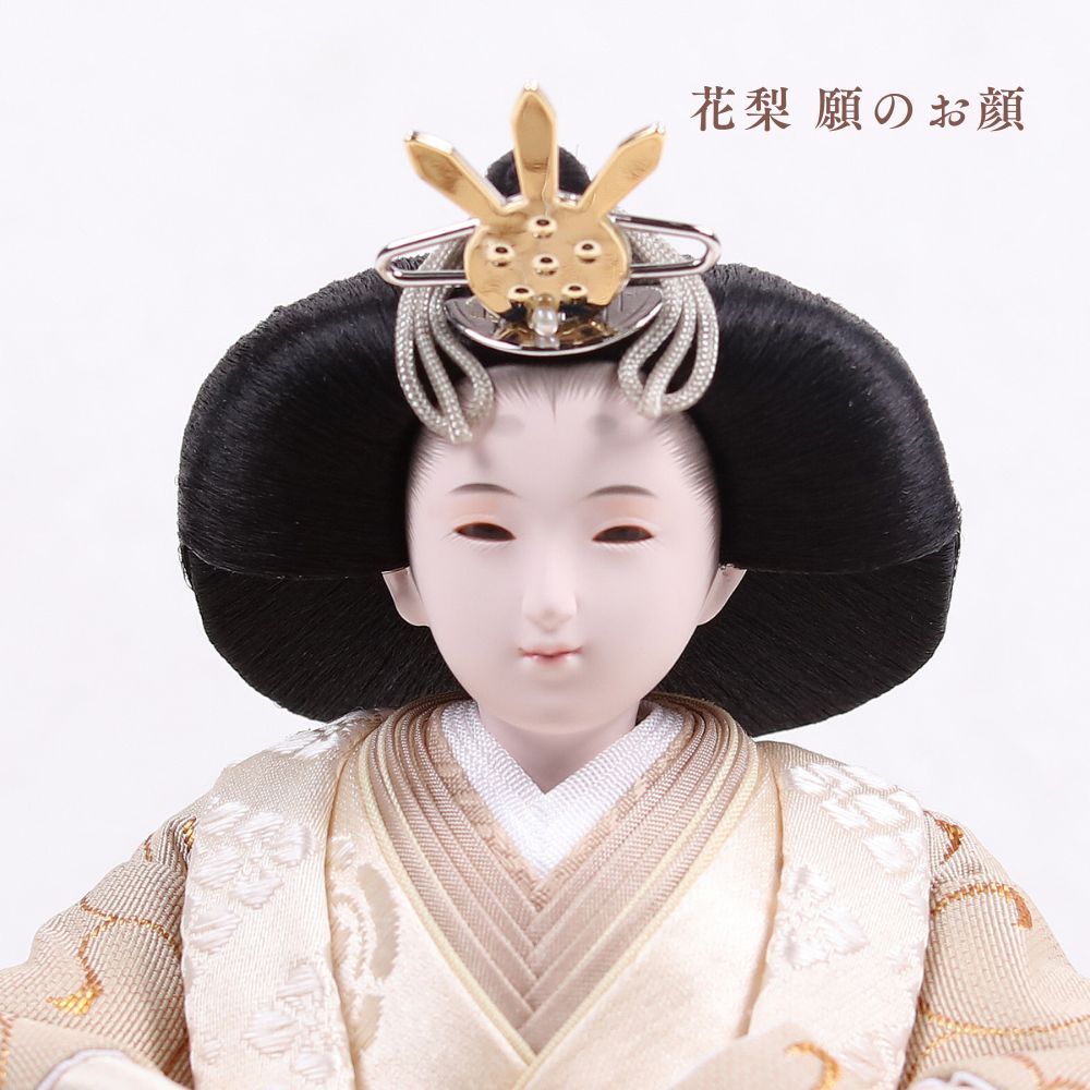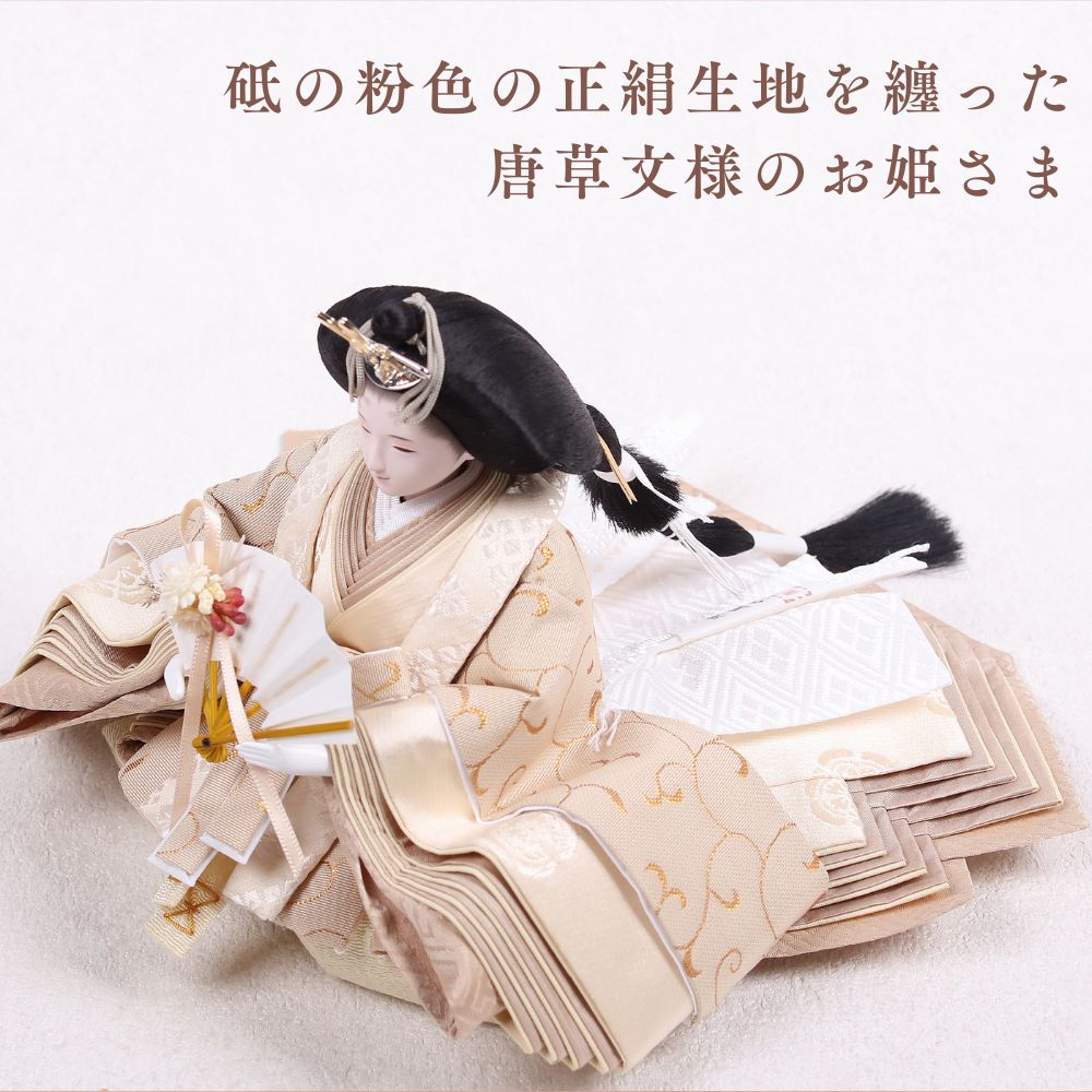 唐花文様の砥の粉色の雛人形は、繁栄と幸福を象徴し、赤ちゃんの成長を願う優雅で温かみのある存在です。